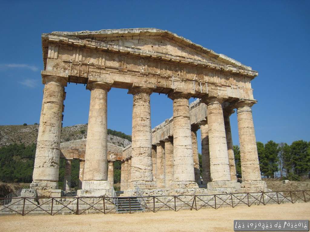 Ustica, c’était censé être une mise en jambes, 3 jours de repos balnéaire avant les visites. Ce matin, j’attaque donc Segeste, des ruines (temple et théatre) qui méritent selon tous mes guides le détour. Comme toujours, les explications pour les voyageurs sans auto sont un peu light voire assez fantaisistes pour le lonely Planet. Je cite « Bus (5 par jour) ou trains peu fréquents (10 par jour) » J’ai donc choisi de prendre le train, peu fréquent mais deux fois plus que le bus! J’avais récupéré les horaires sur le net, je débarque à 9h05 à la gare de Segeste Tempio. Nous sommes 4 dont 2 avec un trolley(!). Pas de hall de gare, c’est un restaurant-bar, aucune explication, pas de fléchage et bien sur la route bifurque, alors à droite ou à gauche ??? Heureusement, mes comparses italiens demandent. On en a pour 20 mn de grimpette pour arriver à la billetterie, pas au site en lui-même. Je prends le bus pour monter au théâtre (c’est en plus du ticket mais je ne me sens pas le courage de grimper !). Là-haut, c’est un peu décevant, la vue ne porte pas aussi loin que ce que je pensais, le théâtre n’est pas si grand que çà (depuis ma visite d’Athènes, je suis un peu blasée) et les panneaux explicatifs sont tout abimés et par conséquent illisibles. A 6 euros l’entrée, ils abusent un peu… Je redescends à pied vers le temple, ça donne des points de vue sympas. Finalement, c’est le temple qui va s’avérer le plus beau mais je ne conseille pas particulièrement Segeste comme site antique.