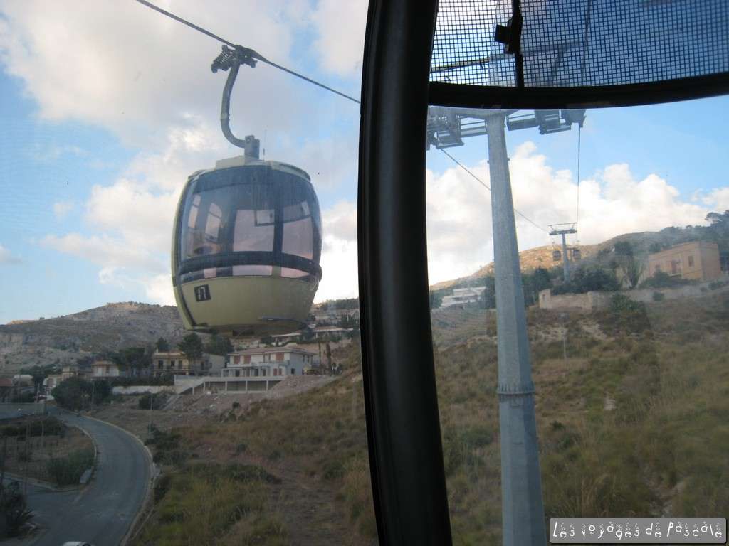Le premier but, c’est de trouver le départ du bus pour Erice. J’ai la table des horaires; il part à 17h30, ça devrait le faire ! Ben au final, non, ça va pas le faire. A 17h15, je suis à la gare routière et on me dit qu’il faut que je retourne à gare des trains car le bus part de là mais je n’ai vu aucun panneau quand j’y suis passée. J’ai l’impression de me faire balader, y a jamais rien d’écrit, je comprends rien à ce qu’on me dit, personne ne parle anglais, j’ai mal aux pieds, bref j’en ai marre…D’après le plan de Trapani, ce n’est pas beaucoup plus loin d’aller à pied au funiculaire que de retourner à la gare et je n’ai pas pour habitude de craquer si près du buffet… Je prends donc l’option funiculaire mais ça va me prendre au final 45 mn pour l’atteindre (je rajoute donc à ma liste de griefs ci-dessus que les plans ne sont pas à l’échelle). Cette soirée est super mal enquillée mais dès que le télécabine s’élève, je ne regrette rien et j’oublie tout. La vue est splendide sur les iles Egades, sur les salines de Trapani, et en plus, je bénéficie d’un super coucher de soleil.