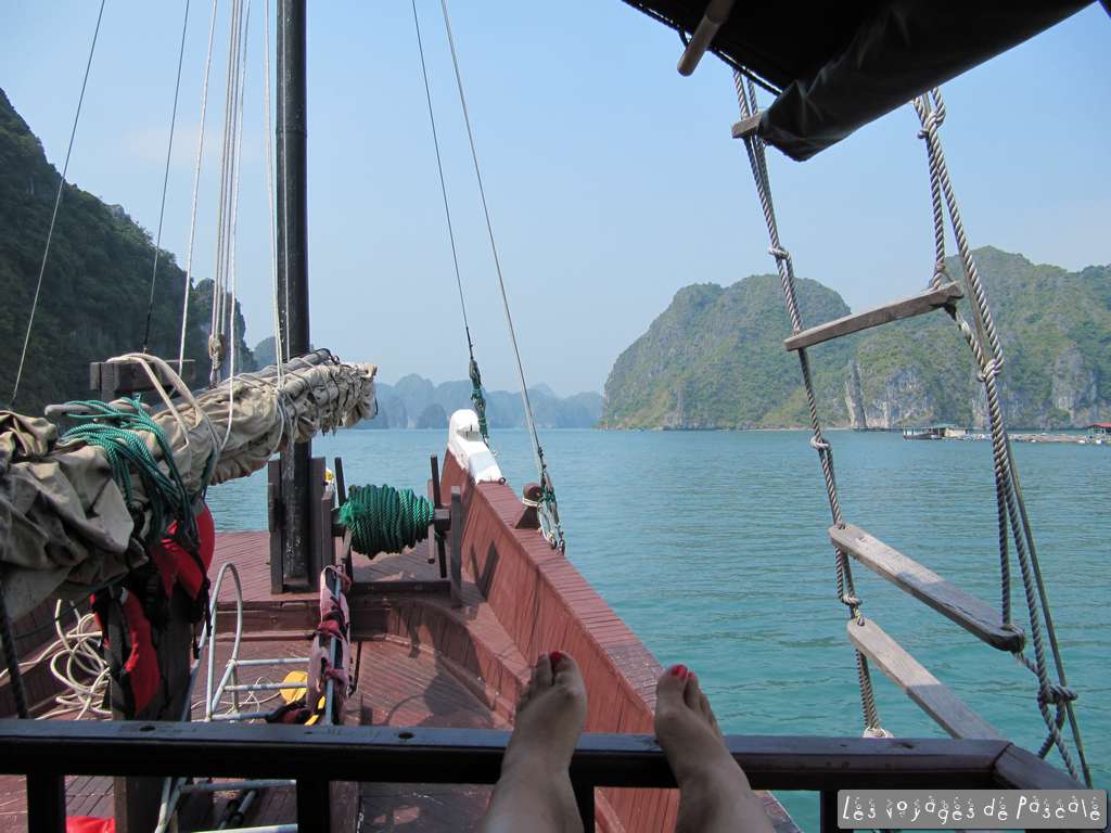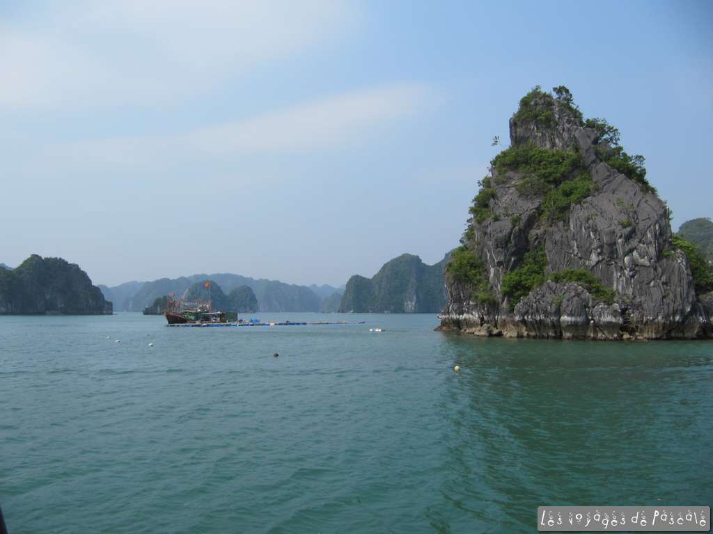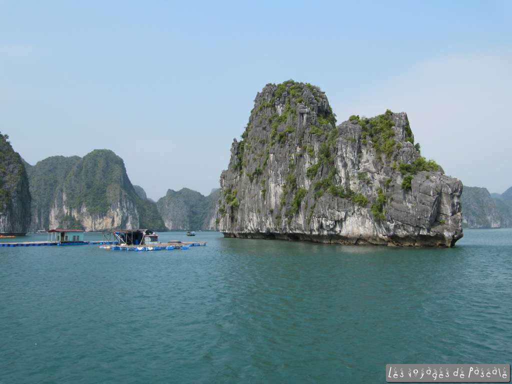 Lever à 7h00 mais pas de lever de soleil sur la baie, c’est encore bien bouché au niveau du ciel. L’équipage nous prépare un petit déjeuner (thé/café/pain/omelette/poire) et nous repartons. Nous demandons à mettre les voiles mais le capitaine nous fait comprendre qu’elles sont cassées et que c’est impossible. A la place, l’équipage nous propose de faire du kayak à peine partis alors que c’est couvert et venteux. Nous comprenons rapidement qu’il y a le câble d’accélérateur à changer et que ce serait bien que nous les laissions tranquilles sur la jonque. Francis ronchonne et ca semble les impressionner, car nous partons pour 2h00 de balade dans la baie (dixit l’équipage). Enfin « dixit » est un bien grand mot car il y a un vrai souci d’anglais à bord. D’habitude, ça ne me gêne pas mais quand les malentendus s’accumulent, c’est un vrai problème…Au bout d’une heure de balade sur l’eau, ils tentent de nous débarquer à nouveau pour 1h40 de randonnée à terre. Nous refusons à nouveau, ils repartent et après 15 mn, re-stop au milieu cette fois-ci de la baie et débrouillez-vous… Bon, heureusement, entre temps, le soleil s’est levé et il fait bien meilleur pour se baigner. Nous nous lançons aussi dans une opération Kayak. C’est super beau, les villages flottants que nous croisons sont incroyables (une vie comme à terre mais sur l’eau) mais les contrariétés avec cette jonque et le fait de se sentir pigeonnés gâchent un peu le tout. Bien entendu, le retour est à l’avenant du reste, nous revenons à 11h30 à Ben Beo au lieu de 12h00 et ils s’étonnent presque de ne pas avoir de pourboire…Pas fou, Mr Binh (de Blue swimmer sailing adventures) ne montre pas le bout de son nez !