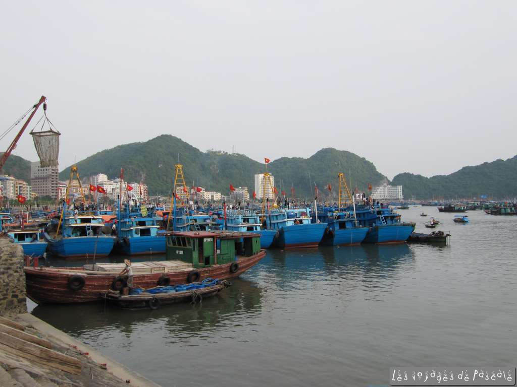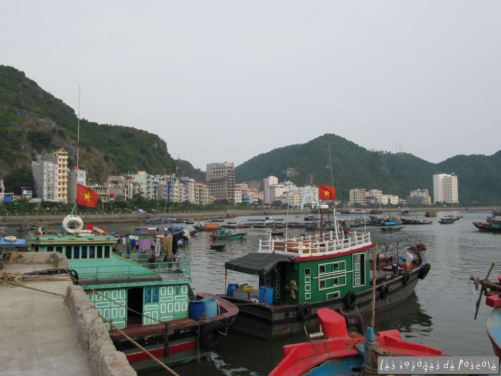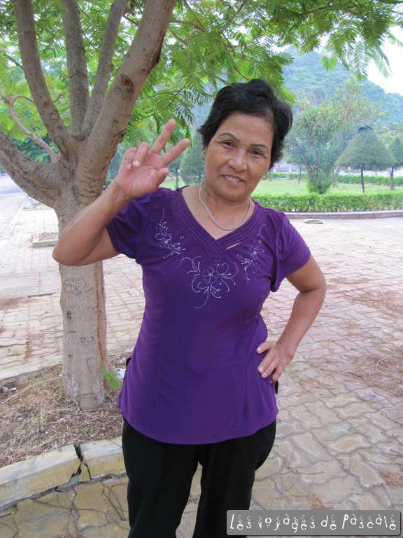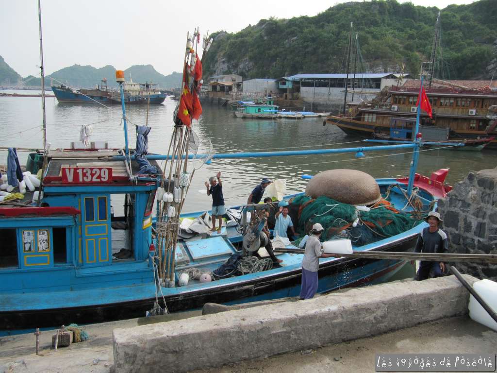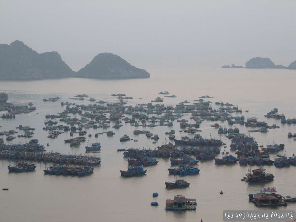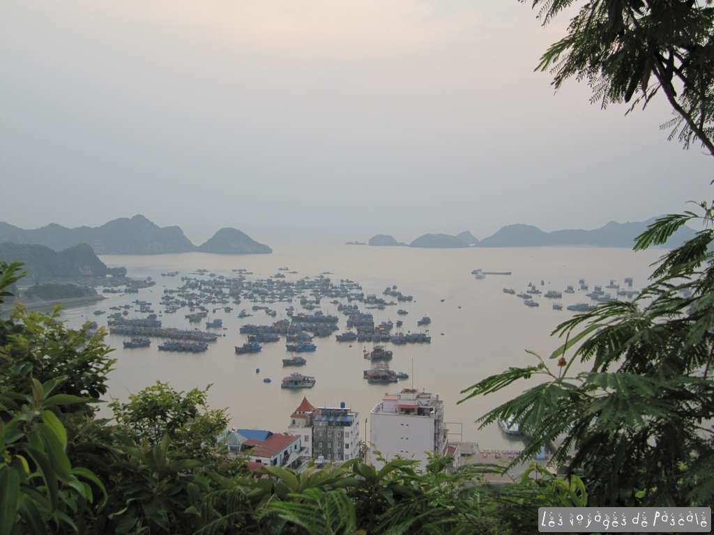 Donc en attendant de décider quel bus on prend pour rentrer à Hanoi, on s’arrete manger au Duc Tuan Hotel, parce qu’il y a du Wifi et que la carte a l’air pas mal. Le patron essaie de nous fourguer une chambre mais on lui dit qu’on part. En mangeant, on voit plusieurs touristes passer assez contents apparemment et salués par le patron. Bref, ça a l’air cool ici. En plus, j’ai un problème de Wifi, le patron dont l’informatique semble être la marotte, me prend le PC des mains pour tenter de me dépatouiller ça. Bref, ça change agréablement de tout ce qu’on a vu jusque là. Francis monte voir une de ses chambres (5ème sans ascenceur à 8$) et c’est mieux que la précédente au même prix (Tout a été refait à neuf récemment, c’est vraiment nickel, clim, ventilo, et vue mer). Donc, on reste encore une nuit à Cat Ba et on glande cet après-midi. Massage pour moi avec une petite masseuse qui m’a marché sur tout le corps. Finalement, je me sens bien mais sur le moment, c’était pas toujours doux…Avec Francis, petite balade avant de rendre le scooter au port de pêche, assez impressionnant. Gars sympathiques qui veulent se faire prendre en photo, amusant…Pour finir, on se tente l’ascension de « mountain N°1 » au sommet de laquelle se trouve un monument à la gloire d’Ho Chi Min. Ici, on ne se casse pas la tête avec les noms, on numérote (cat co 1, 2 et 3 pour les plages). Belle vue sur le port, le soleil est en train de se coucher mais encore une fois, trop de nuages, juste la couleur de la mer (marron-gris) se confond avec le ciel, assez surprenant…