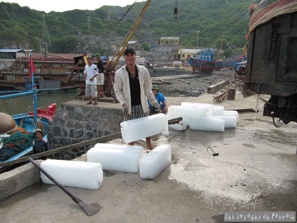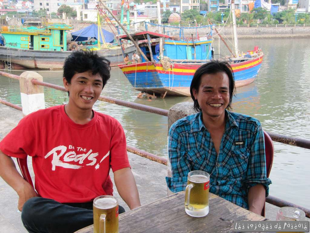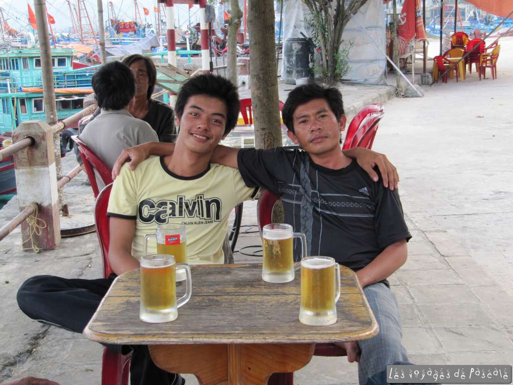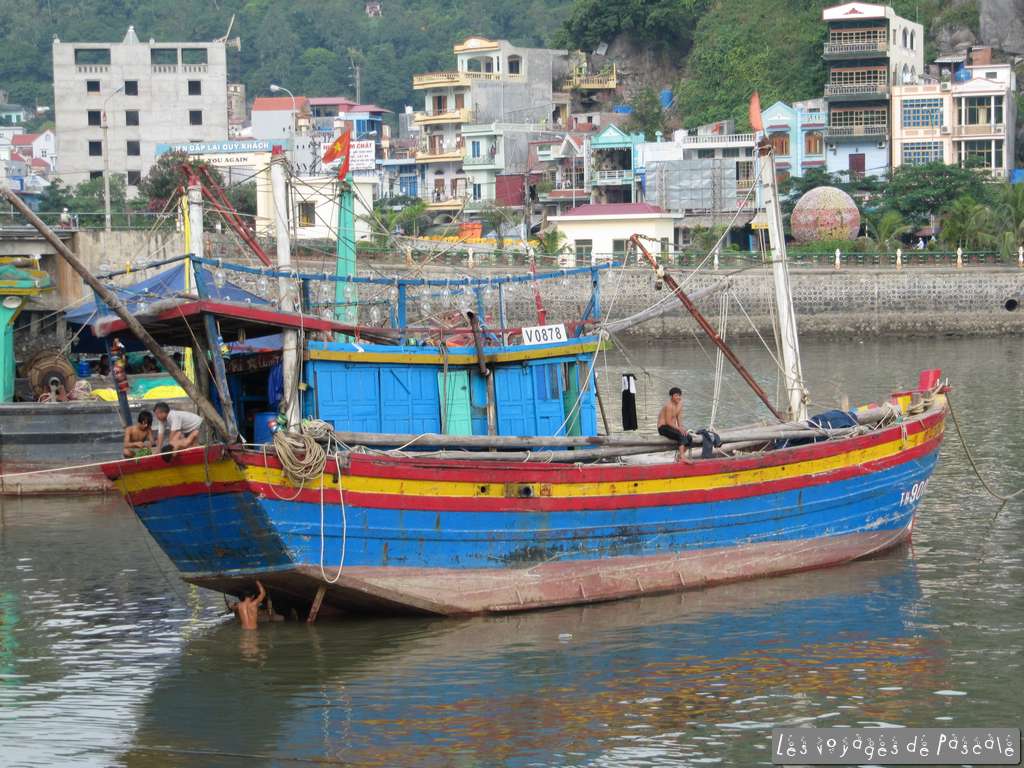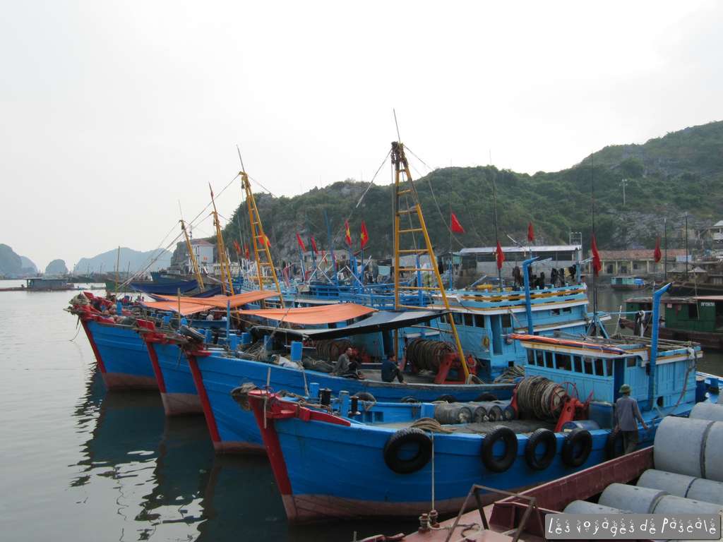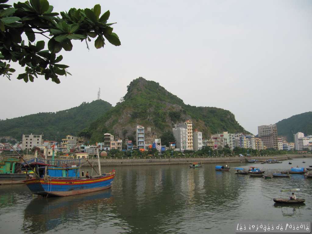 Donc en attendant de décider quel bus on prend pour rentrer à Hanoi, on s’arrete manger au Duc Tuan Hotel, parce qu’il y a du Wifi et que la carte a l’air pas mal. Le patron essaie de nous fourguer une chambre mais on lui dit qu’on part. En mangeant, on voit plusieurs touristes passer assez contents apparemment et salués par le patron. Bref, ça a l’air cool ici. En plus, j’ai un problème de Wifi, le patron dont l’informatique semble être la marotte, me prend le PC des mains pour tenter de me dépatouiller ça. Bref, ça change agréablement de tout ce qu’on a vu jusque là. Francis monte voir une de ses chambres (5ème sans ascenceur à 8$) et c’est mieux que la précédente au même prix (Tout a été refait à neuf récemment, c’est vraiment nickel, clim, ventilo, et vue mer). Donc, on reste encore une nuit à Cat Ba et on glande cet après-midi. Massage pour moi avec une petite masseuse qui m’a marché sur tout le corps. Finalement, je me sens bien mais sur le moment, c’était pas toujours doux…Avec Francis, petite balade avant de rendre le scooter au port de pêche, assez impressionnant. Gars sympathiques qui veulent se faire prendre en photo, amusant…Pour finir, on se tente l’ascension de « mountain N°1 » au sommet de laquelle se trouve un monument à la gloire d’Ho Chi Min. Ici, on ne se casse pas la tête avec les noms, on numérote (cat co 1, 2 et 3 pour les plages). Belle vue sur le port, le soleil est en train de se coucher mais encore une fois, trop de nuages, juste la couleur de la mer (marron-gris) se confond avec le ciel, assez surprenant…