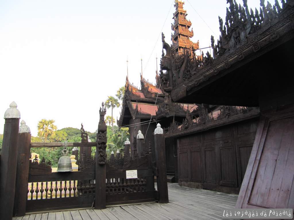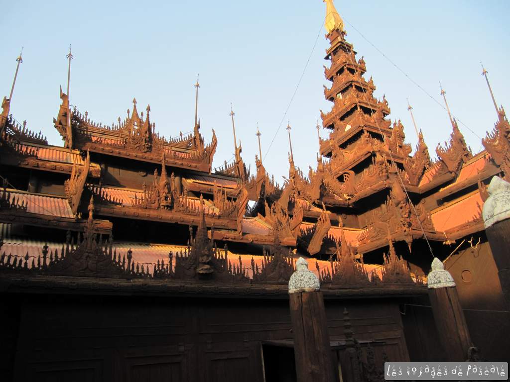 J’ai fini par débarquer un peu avant 10h à ma nouvelle chambre (assez pourrie on va dire et encore je suis surclassée dans une double, je crains pour la nouvelle demain !), mais la réception est top. J’ai de suite réservé avec eux un mototaxi pour la journée pour visiter Amarapura, Awa, et Sadaing. On a commencé avec quelques pagodes à Amarapura avant de terminer au fameux pont d’U-bein le plus long pont en teck du monde. Le plus sympa n’est pas seulement le pont mais la vie autour du lac. Rizières en train d’être plantées, pêcheurs sur une eau parfaitement lisse, un endroit très agréable. Ensuite, nous avons embrayé sur de vieux temples en ruines parfaitement déserts, en alternant avec des visites d’artisanat local, fabrication de bols à offrandes pour les moines (avec service d’exportation s’il vous plait !) et de poteries, également un petit passage devant un orphelinat, avant de cloturer le parcours en beauté avec Sagaing Hill et sa vue époustouflante sur toutes les collines boisées environnantes d’où émergent de jolis stupas dorés. Retour sur Mandalay et visite d’un très beau monastère en teck.