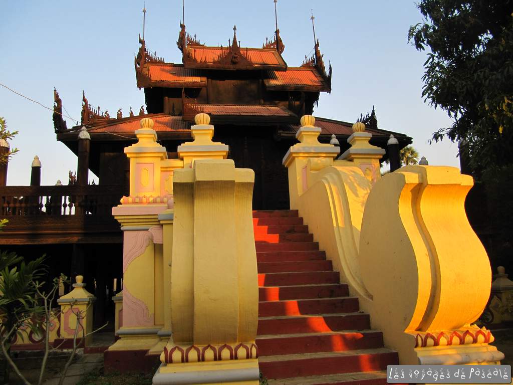 Sans doute ma meilleure journée depuis que je suis arrivée en Birmanie et pourtant, elle avait moyennement commencé. Je me suis levée avec 1) une gêne à l’oeil droit, j’ai de suite vu dans la glace que ma paupière droite avait doublé de volume, sans doute une piqure de moustique, 2) les fesses en compote, les selles birmanes étant nettement moins bien suspendues que les européennes. Je suis ensuite arrivée in extremis à 8h59 au petit déjeuner qui fermait à 9h, et je me suis pris la tête avec un taxi bleu pour mon transfert au nouvel hôtel, encore une question de prix, ils ne comptent plus qu’en milliers de kyat (1 millier = 1 euro), et font comme si les centaines n’existent pas, il ne reste alors que peu de marge à la négociation…