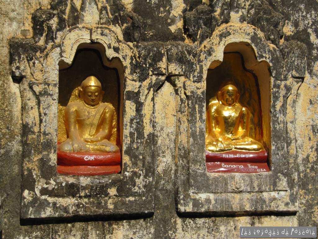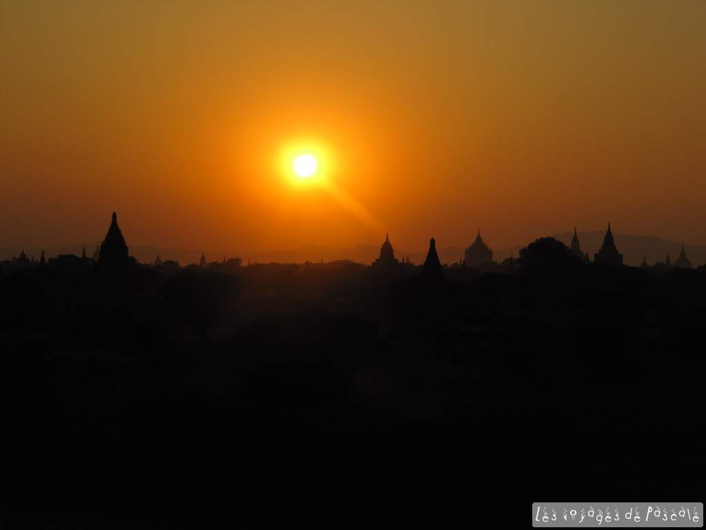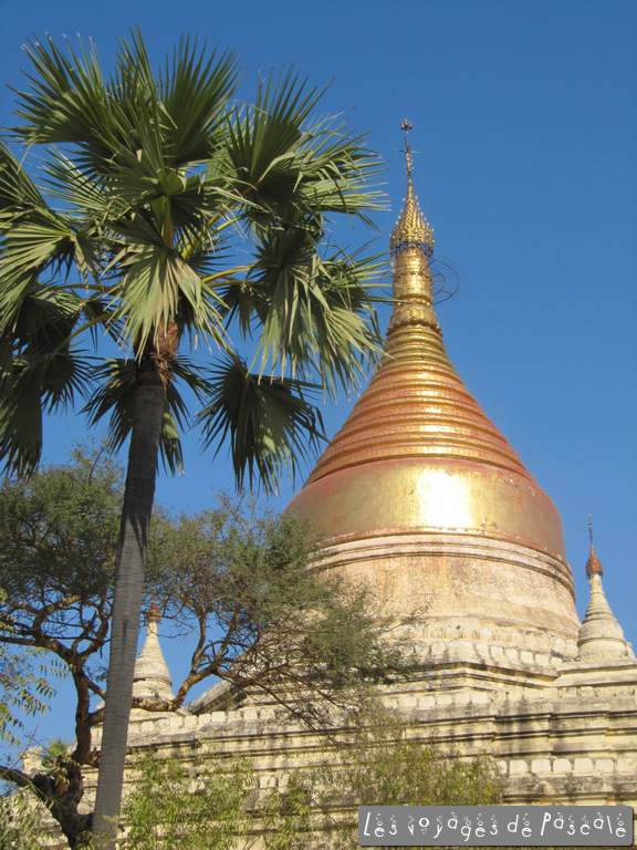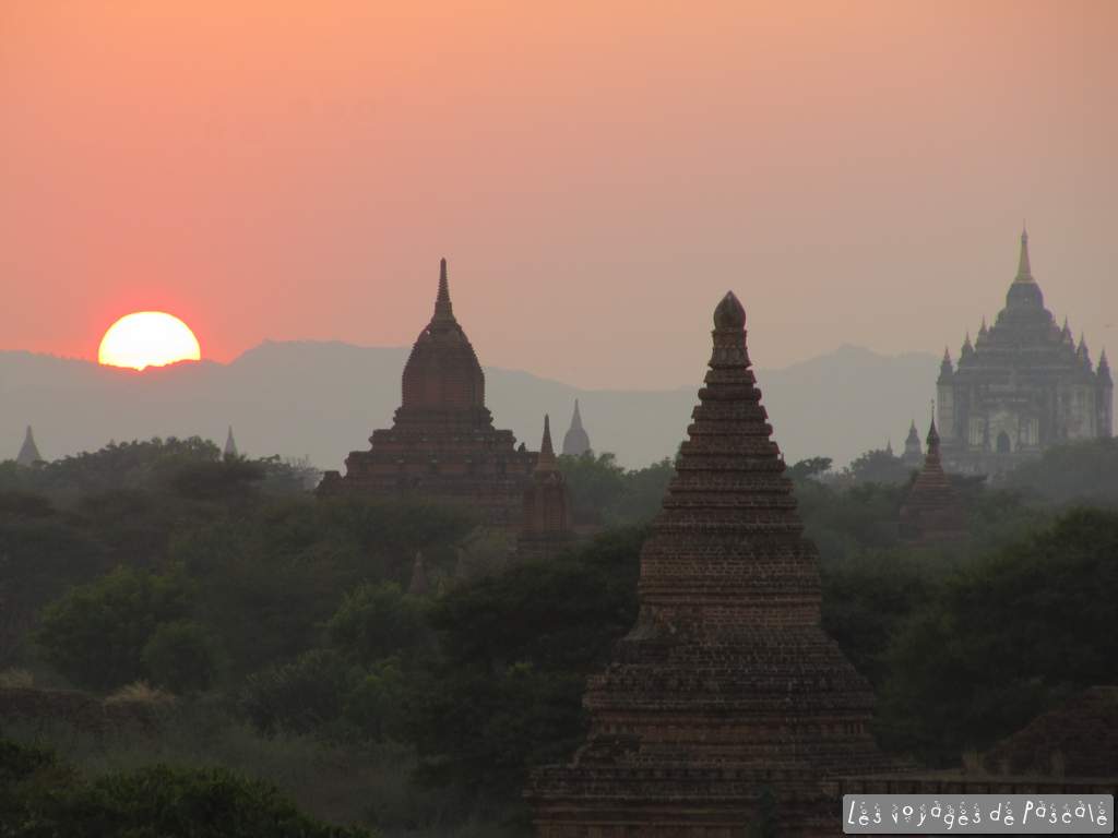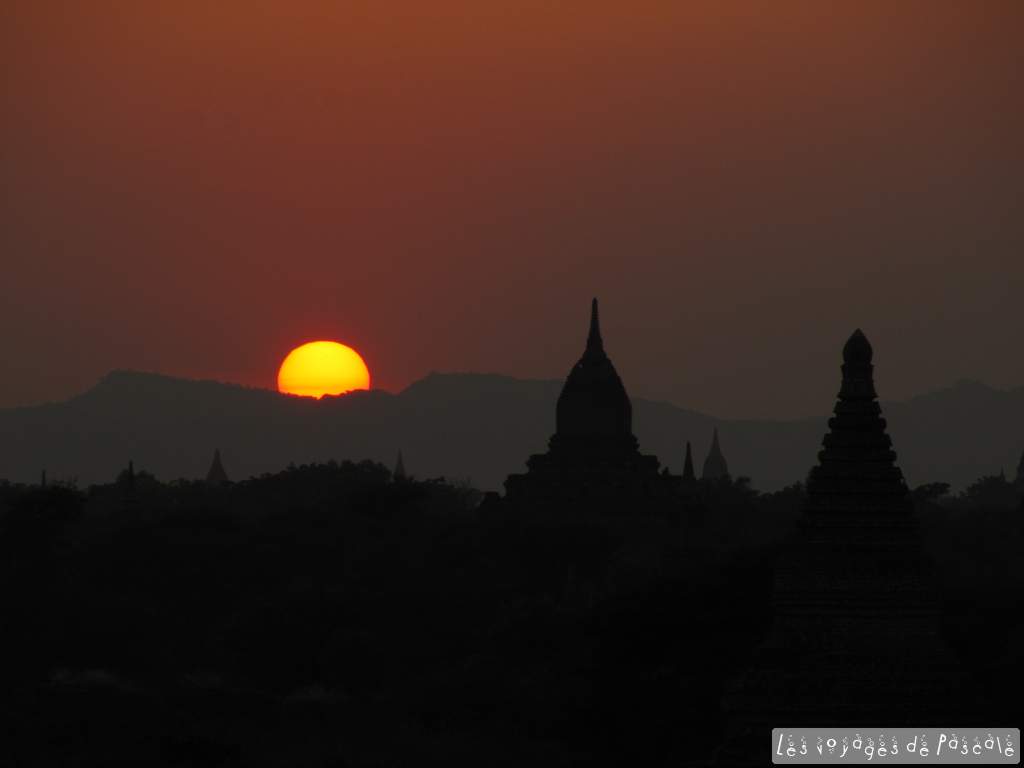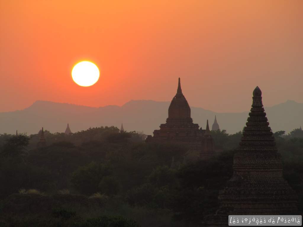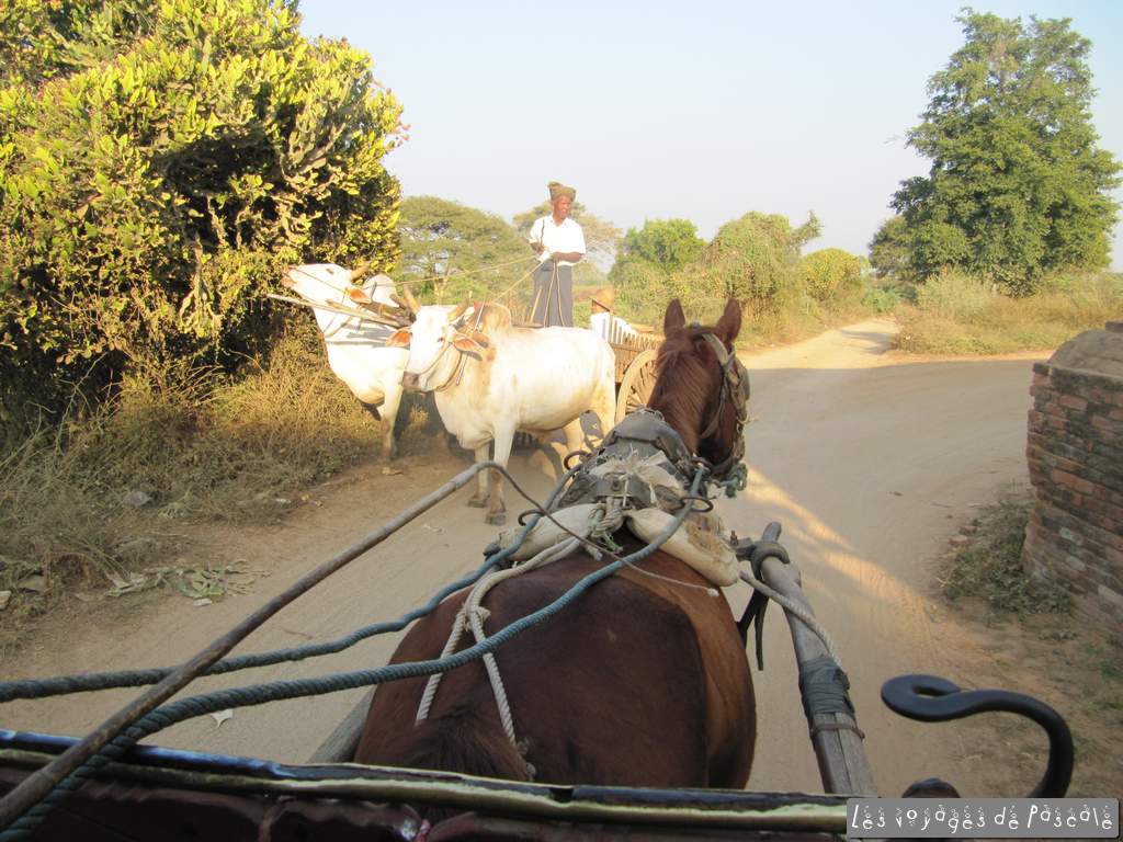 Aujourd’hui, balade en carriole dans Bagan. L’attraction du coin, c’est de musarder en « calèche » au milieu des temples. Hier, le couple anglo-malais (Shamsia et Adrian) rencontré au petit déjeuner m’avait proposé de partager la calèche, mais je n’avais pas donné suite car je pensais qu’on ne tenait qu’à 2, mais il y a aussi une place auprès du chauffeur. Je me suis donc rendue à leur guesthouse ce matin et suis partie avec eux. Départ 8h30, retour 18h30, pause déjeuner d’une heure, autant dire que c’est une bonne journée. Je ne rentre pas dans les détails, mais nous avons visité une bonne dizaine de temples, du XIème, du XIIème, etc… avec des bouddhas, des peintures murales, des vendeurs de souvenirs etc…et l’odeur du crottin en prime (merci Mo, c’est le nom du cheval). Journée très chouette aussi grâce à la personnalité de mes co-voyageurs, une bonne leçon d’anglais également (pour dire tournevis « screwdriver », j’ai dit « screw » qui veut dire « baiser », ca les a bien fait rire). Pour le coucher de soleil, nous avons fini par un temple moins bondé qu’hier mais quand même un peu, et j’ai été une fois de plus effarée par l’attitude des personnes que j’ai vues (francophones pour la plupart), notamment une femme, qui se plaignaient des vendeurs qui la suivaient partout « même en haut des temples » (je la cite). Grosse envie de lui dire que c’était avant tout LEUR pays mais je me suis retenue, pas envie de me prendre la tête avec une mégère. Le touriste digne de ce nom, déplie bien son trépied face au soleil couchant, histoire d’être sur que personne ne lui pique sa place, allonge ses jambes, aussi pour empêcher tout passage, un sans-gêne incroyable…