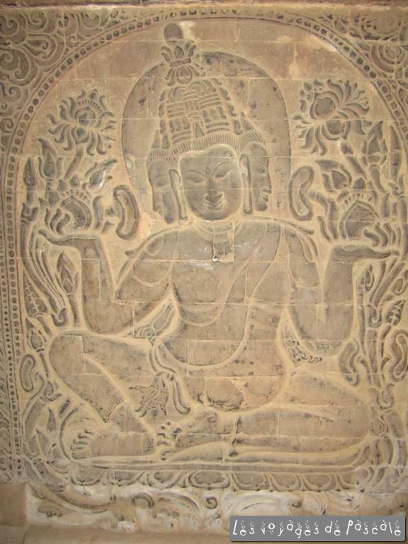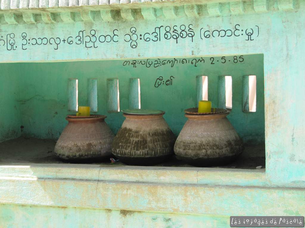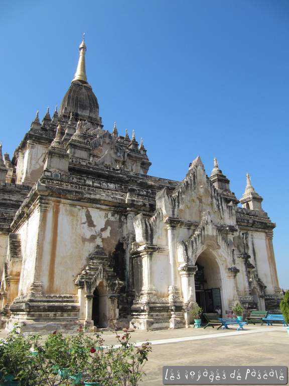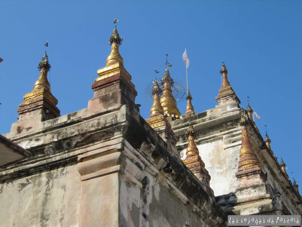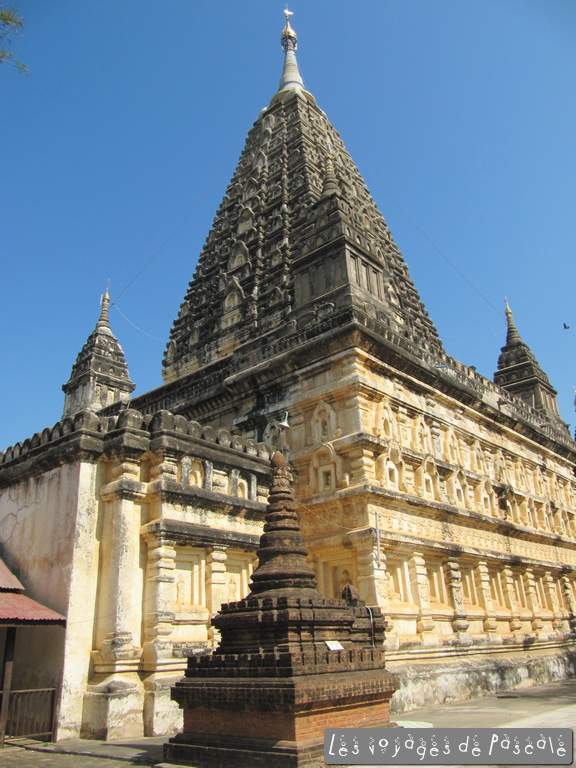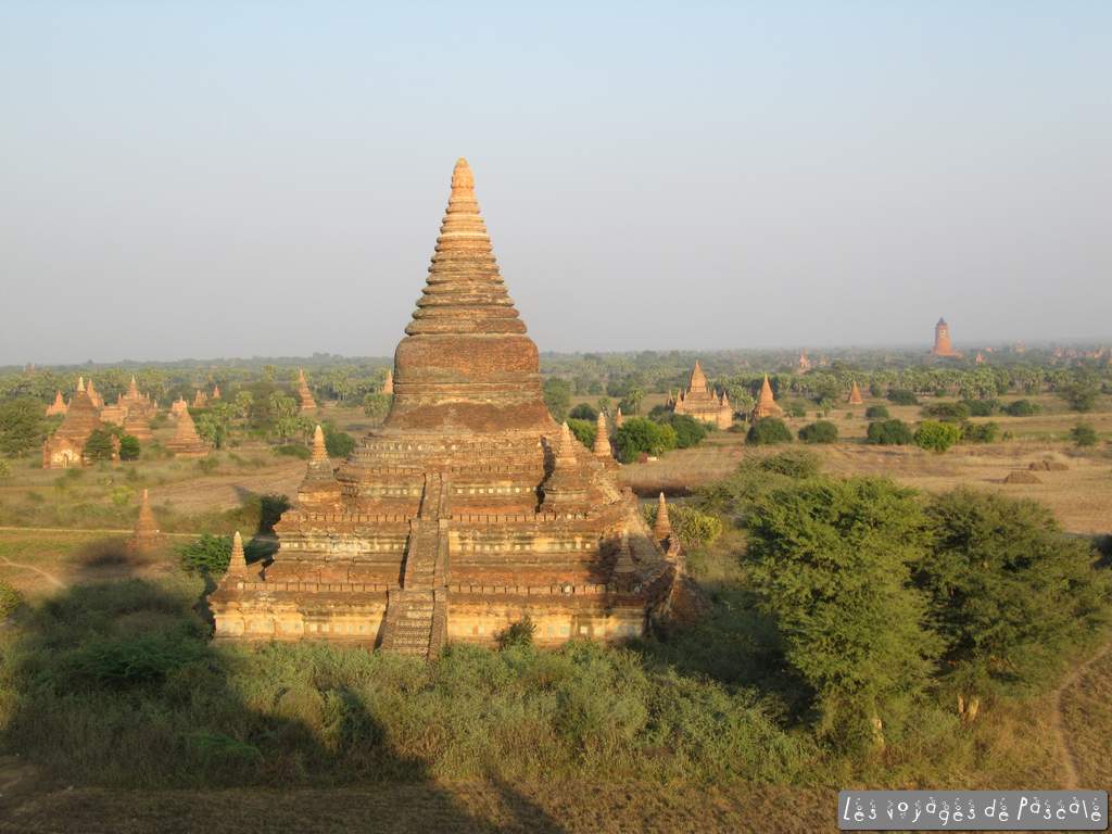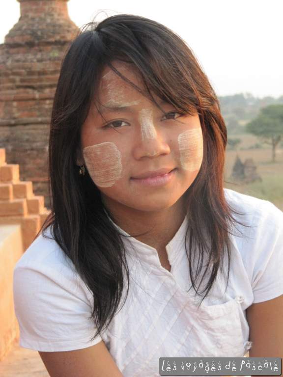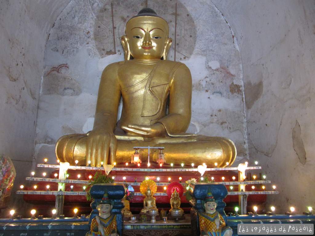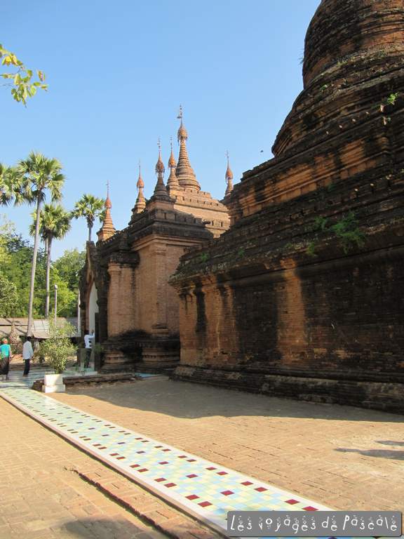 Aujourd’hui, balade en carriole dans Bagan. L’attraction du coin, c’est de musarder en « calèche » au milieu des temples. Hier, le couple anglo-malais (Shamsia et Adrian) rencontré au petit déjeuner m’avait proposé de partager la calèche, mais je n’avais pas donné suite car je pensais qu’on ne tenait qu’à 2, mais il y a aussi une place auprès du chauffeur. Je me suis donc rendue à leur guesthouse ce matin et suis partie avec eux. Départ 8h30, retour 18h30, pause déjeuner d’une heure, autant dire que c’est une bonne journée. Je ne rentre pas dans les détails, mais nous avons visité une bonne dizaine de temples, du XIème, du XIIème, etc… avec des bouddhas, des peintures murales, des vendeurs de souvenirs etc…et l’odeur du crottin en prime (merci Mo, c’est le nom du cheval). Journée très chouette aussi grâce à la personnalité de mes co-voyageurs, une bonne leçon d’anglais également (pour dire tournevis « screwdriver », j’ai dit « screw » qui veut dire « baiser », ca les a bien fait rire). Pour le coucher de soleil, nous avons fini par un temple moins bondé qu’hier mais quand même un peu, et j’ai été une fois de plus effarée par l’attitude des personnes que j’ai vues (francophones pour la plupart), notamment une femme, qui se plaignaient des vendeurs qui la suivaient partout « même en haut des temples » (je la cite). Grosse envie de lui dire que c’était avant tout LEUR pays mais je me suis retenue, pas envie de me prendre la tête avec une mégère. Le touriste digne de ce nom, déplie bien son trépied face au soleil couchant, histoire d’être sur que personne ne lui pique sa place, allonge ses jambes, aussi pour empêcher tout passage, un sans-gêne incroyable…