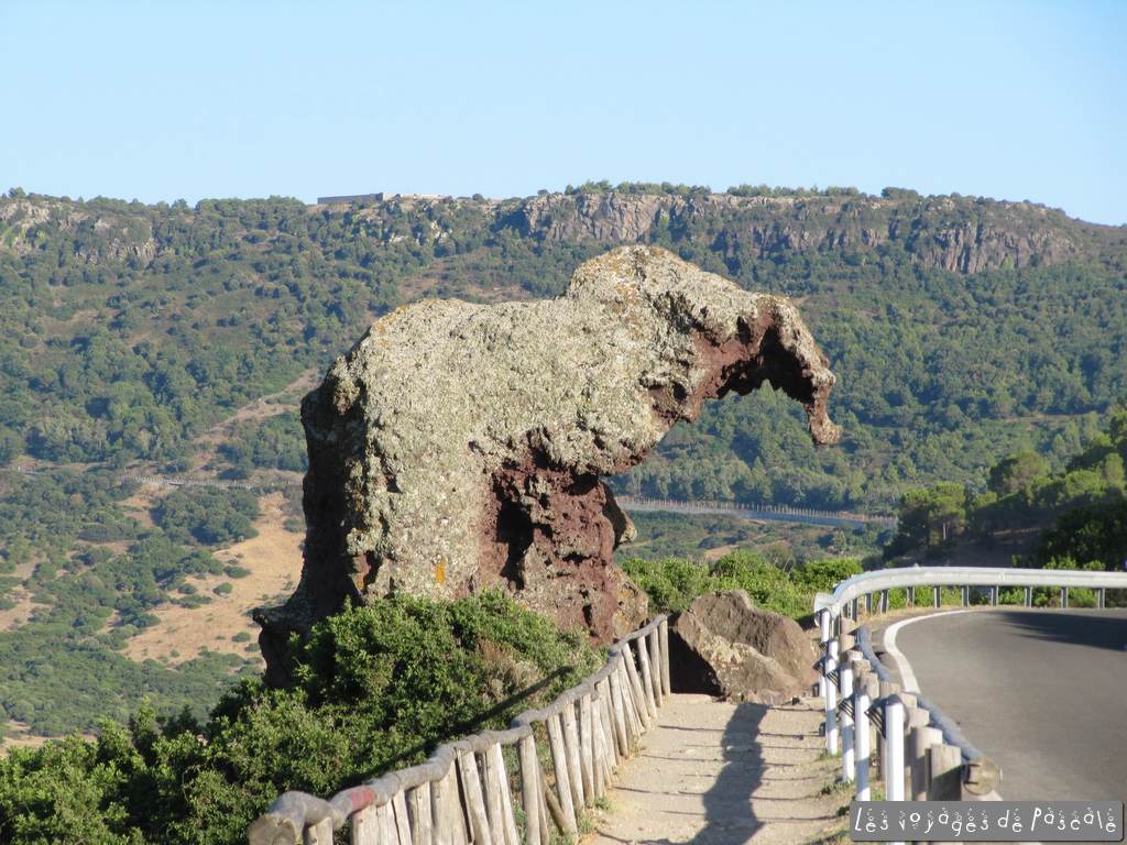 Journée débutant tranquillement à la piscine, pour profiter de la visite de Castelsardo à la fraiche (soit après 16h, mais c’est tout relatif…). Un record ce midi en montant dans la voiture, 40 degrés au compteur. Nous prenons la route en direction de la cote. Des virages, encore des virages, au milieu de petits sommets assez secs, de vignes et de forets. Au passage, un petit coup de gueule sur la carte Michelin de la Sardaigne qui est une daube finie, les noms des lieux ne sont pas ceux des panneaux, les sites touristiques majeurs ne sont pas non plus indiqués, nous sommes obligés de combiner avec le Lonely Planet. Nous arrivons finalement au Mont Tinari (là, c’est grace à la carte car aucun panneau le long de la route), avec un superbe bélvédère (en ruines quand meme) sur la cote Nord. Celle ci est découpée et les rochers sont rouges, une sorte de Ploumanach sarde. On voit loin, y compris les falaises de Bonifacio en Corse. Arrêt plage au plus chaud de la journée à la cala rossa, une petite crique sympa et pas bondée, accessible par un chemin poussiéreux de plusieurs kilomètres, la couleur de la fiat 500 est maintenant indéterminée…