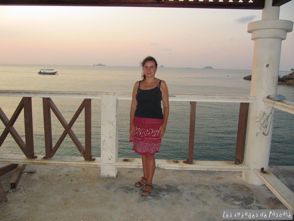 Boucler le sac, petit-déjeuner, rendre les clefs de la chambre, un tour de bateau et hop débarquement sur Coral Bay à Kecil à même pas 9h30. J’avais beaucoup hésité entre les deux îles et retenu Besar sur les conseils de français qui avaient logé là. Autant Besar était tranquille, autant Kecil est plus grouillante. Le premier resort que je tente est complet, le deuxième a une chambre très moyenne, le troisième est aussi complet. Au final, c est vite vu… Je prends ce que je trouve, c’est pour une nuit donc pas la mer à boire. Le problème n’est pas tant dans la chambre en elle-même au plancher disjoint, aux peintures moyennes et à la salle de bain rudimentaire mais dans les odeurs d’égout, assez normales puisque les eaux usées des salles de bains de nos chambres sur pilotis se déversent directement dans une eau noirâtre stagnant sous les bungalows qui s’écoule ensuite jusqu’à la mer en une petite rivière. J’avais lu que les Perhentian étaient une catastrophe écologique, sur Besar, je ne comprenais pas pourquoi, sur Kecil, ça m’est apparu clairement. Pour autant, tout est moins cher ici, les trips snorkeling (enfin, c’est le même prix mais on va plus loin et en plus ils offrent le petit déjeuner), les transferts en bateau, la bouffe etc… Je m’inscris donc pour un « snorkeling trip » qui va débuter à 11h. Nous sommes 4, génial car les autres bateaux ont plutôt 10-12 passagers. Je n’ai eu que deux arrêts en commun avec celui de la veille mais j’ai vu de plus grosses tortues, en action cette fois-ci, encore des requins à Shark Point et admiré les coraux et nombreux poissons autour du phare en face de Coral bay. On a fini par Love Beach, une jolie plage déserte. Retour au port pour déjeuner puis encore un peu de plage et beau coucher de soleil, un avantage de Kecil puisque de Besar, le soleil couchant est caché par Kecil. Les tables des deux restos de plages se remplissent, je choisis le menu BBQ avec marlin grillé, trop bon le poisson ici et discute tardivement avec un couple de jeunes français en voyage de 6-8 mois en Asie du Sud Est.