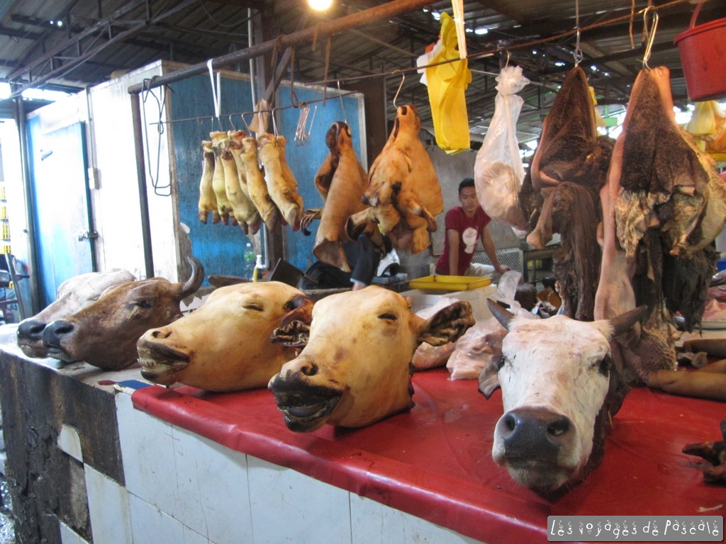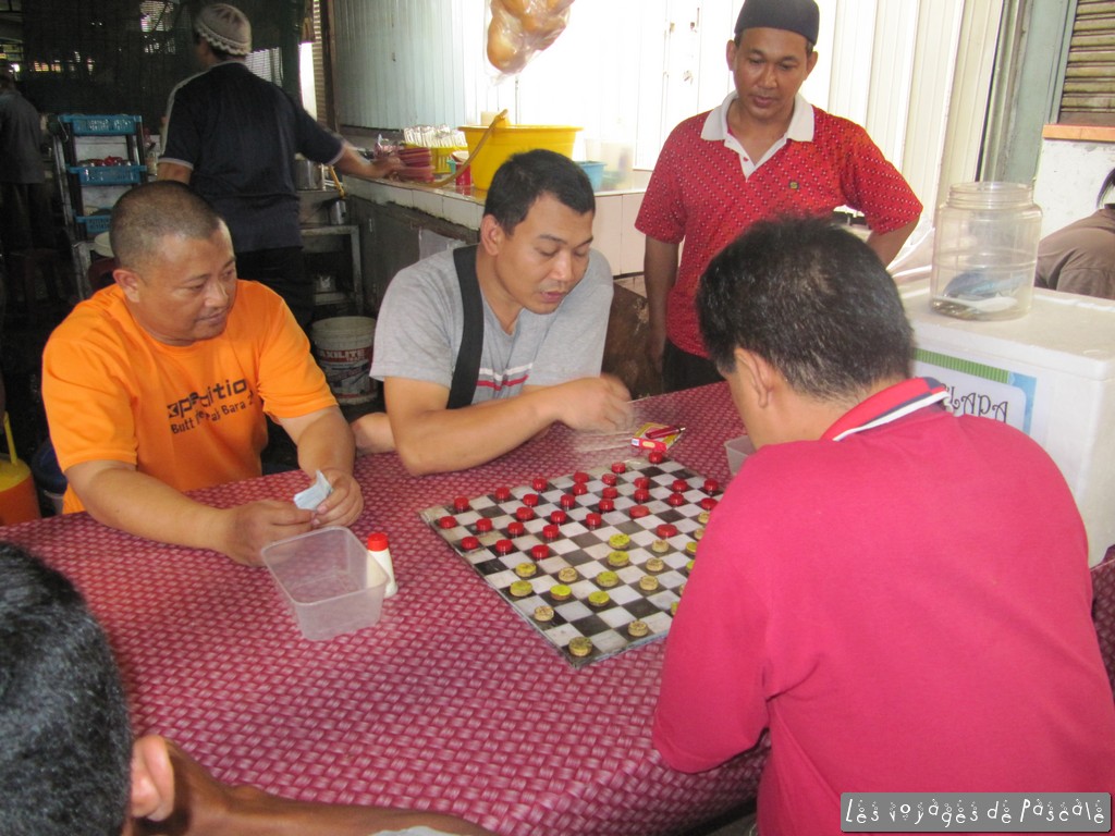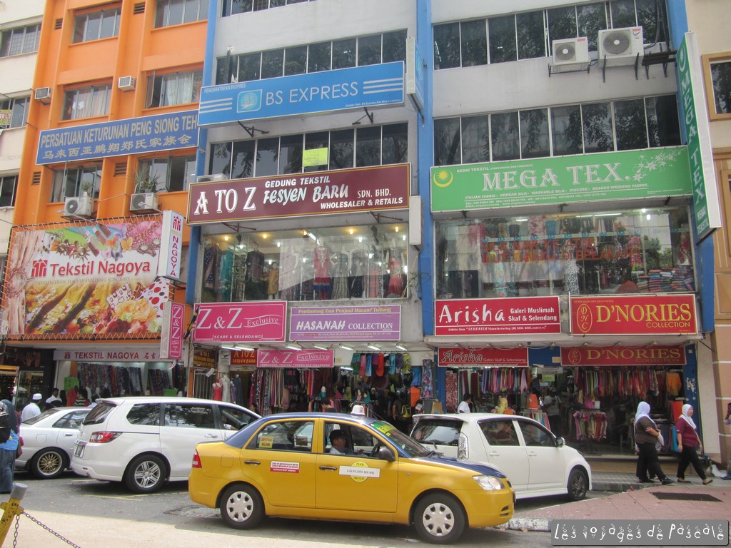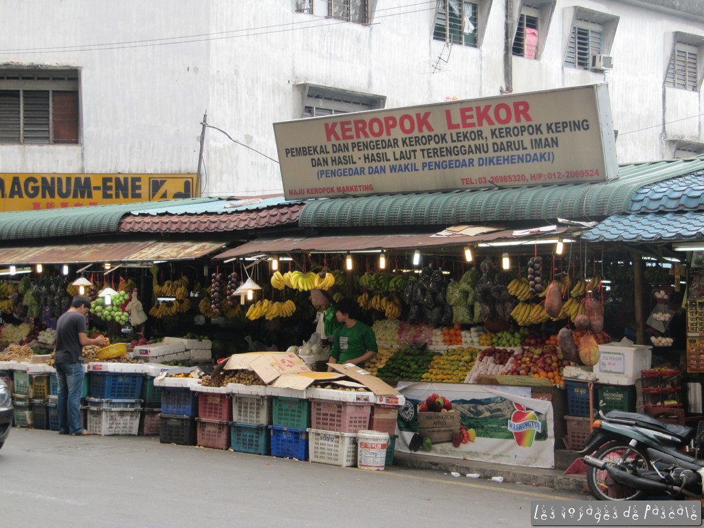 Aussitôt sortie du train, je me suis mise en route pour Chinatown, j’ai décidé de prendre une chambre pour la journée, pour avoir une douche, du wifi, un stockage pour mon sac. Je ne voulais pas mettre trop cher, je me suis rabattue sur les Guest houses bon marché et j’ai du en faire deux avant de trouver une piaule. Salle de bain à l’extérieur, un ventilo, pas de fenêtre bien sur, tout ça pour 8,50 euros. Un peu glandé avant de me mettre en route pour le quartier de Kampang Baru, qui est exactement comme annoncé, un petit quartier de maisons traditionnelles en bois et jardinets avec en fond les tours Petronas. J’ai ensuite poursuivi sur le marché de Chow Kit, une très bonne surprise, un marché animé et bien achalandé (viandes, poissons, fruits et légumes, épices) où tout le monde voulait se faire prendre en photo. Egalement des joueurs de dames, billets à la main, je suppose qu’on joue de l’argent. Puis je suis revenue à pieds sur Chinatown en traversant Little India. Pour me mettre au frais, j’ai visité les magasins de saris, j’ai vu défiler des kilomètres de tissus colorés, et des centaines de voiles musulmans, des déclinaisons de couleurs infinies. Petite sieste avant de repartir pour l’aéroport et de rentrer cette nuit sur Paris en A380. Un peu décue, pas vraiment de différence entre l’A380 et un autre airbus récent, à part le temps de récupération des bagages, beaucoup plus long ici 🙂 Arrivée sans encombre sur Paris et retour sur Rennes avec un TGV bien entendu en retard…