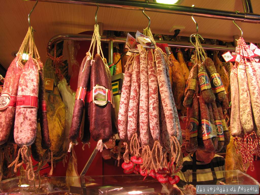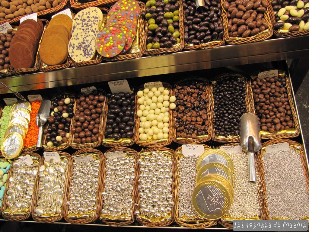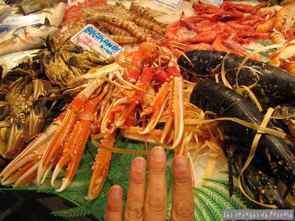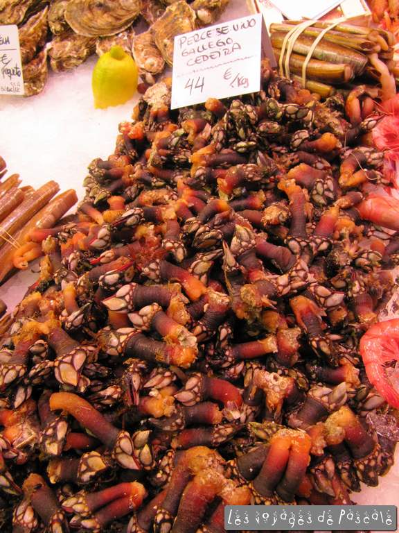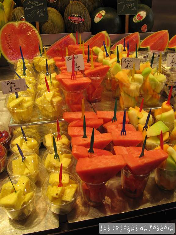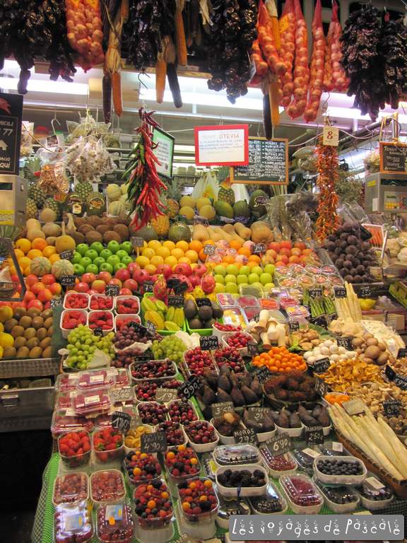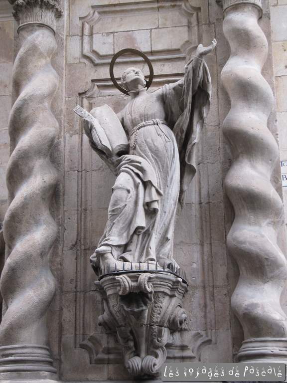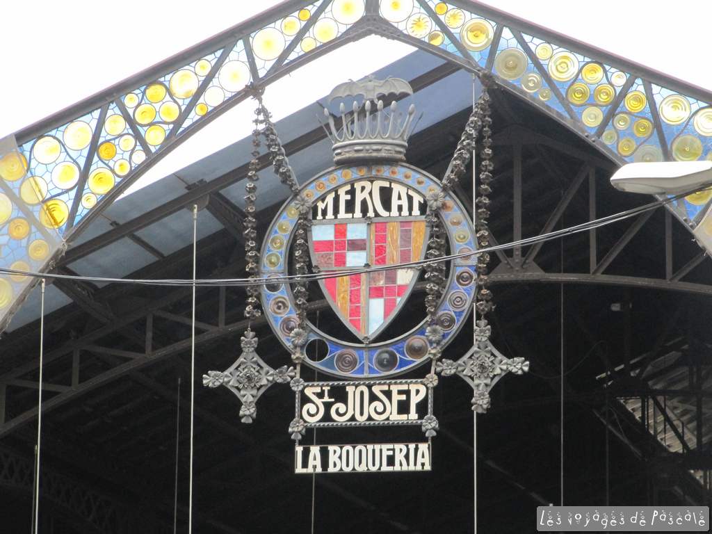 La journée a commencé sous un ciel couvert et par un petit déjeuner, et quel petit déjeuner !!! De tous mes voyages, je n’ai jamais vu un tel choix, de pâtisseries, de charcuteries, tout est appétissant, bon et à profusion. Le problème, c’est que tout m’a fait envie et que j’ai trop mangé, je me suis sentie lourde toute la matinée 🙁 Nous attaquons par le quartier Barri Gotic, la cathédrale de belle taille et ses superbes peintures murales, ainsi que son beau cloître ou séjournent douze oies ! A noter que ce week-end, on fête ici le corpus christi et qu’une des coutumes est de faire danser un œuf sur un jet d’eau (!) La fontaine du cloître a donc été somptueusement décorée de fleurs fraîches et au sommet on voit effectivement un œuf dur sursauter sous la pression du jet. Rigolo. Halte géniale au marché de la Boqueria, sur les Ramblas. Tous les produits bien sur (poissons, charcuteries, fruits etc..), mais surtout une présentation soignée et appétissante des produits, une vrai symphonie de couleurs, belles photos en perspectives. On a continué ensuite sur l’ église Santa Maria del Pi, puis l’Antic Hospital de la Sta Creu, très beaux patios et jardins, et le Monaster de Sant Pau del Camp au milieu des ruelles du quartier El Raval. Remontée ensuite sur le quartier de l’Eixample, belles allées perpendiculaires pour arrivée à la Casa Batllo (prononcer ballio), une des plus célèbres réalisations de Gaudi que nous ne visiterons pas pour cause de tarif prohibitif (20 euros) et aussi à peine assez de temps pour en profiter car nous avons acheté un e-ticket pour la Sagrada Familia avec horaires imposés (entre 15h et 16h).