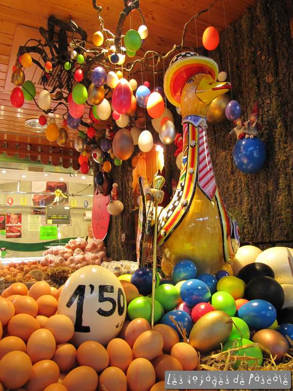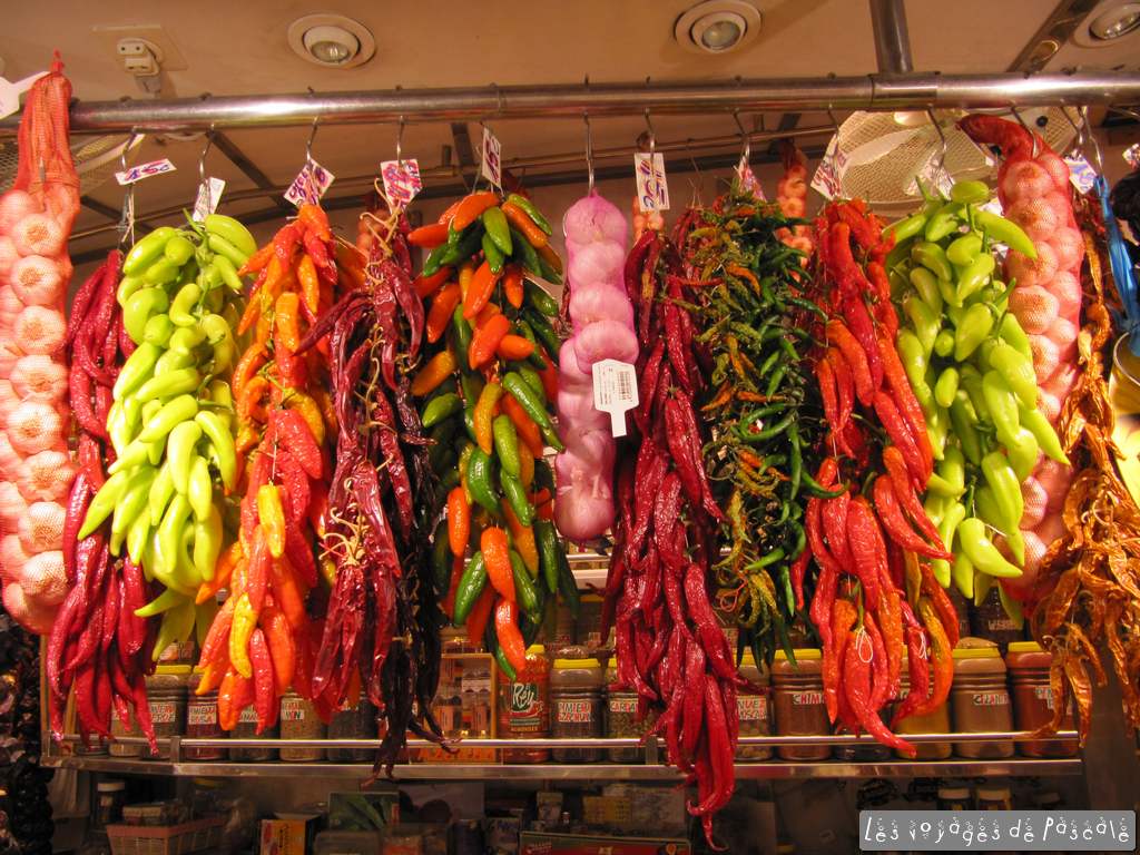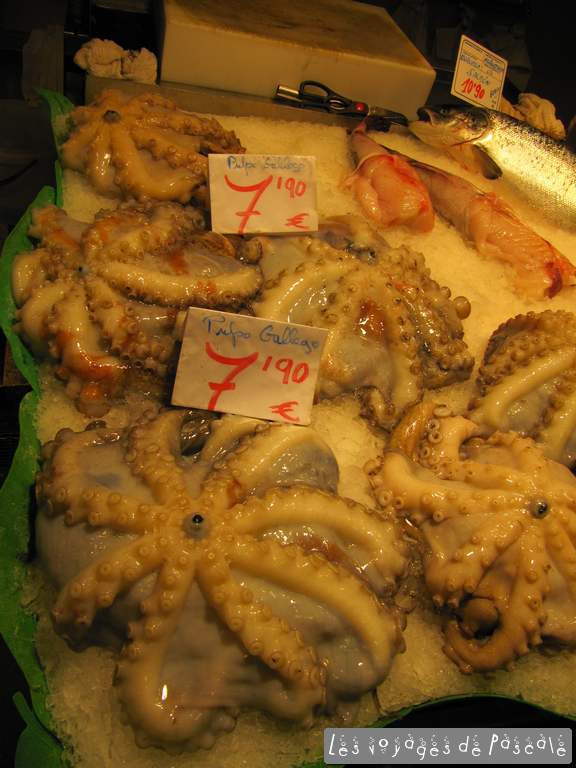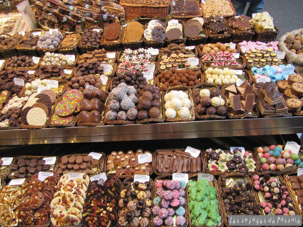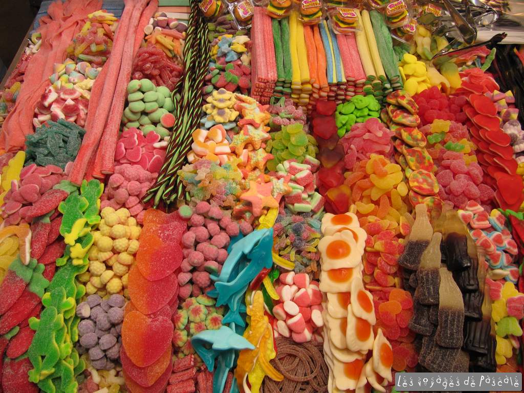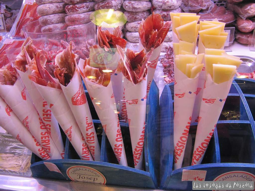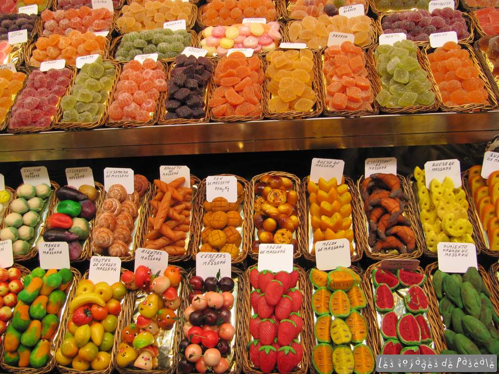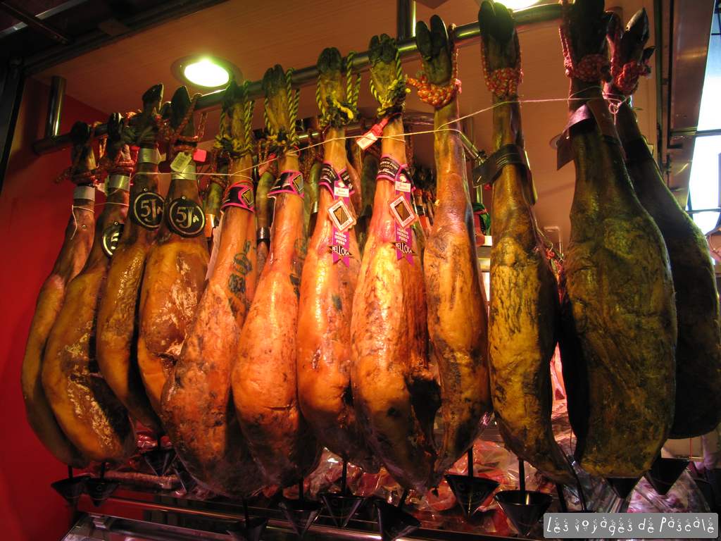 La journée a commencé sous un ciel couvert et par un petit déjeuner, et quel petit déjeuner !!! De tous mes voyages, je n’ai jamais vu un tel choix, de pâtisseries, de charcuteries, tout est appétissant, bon et à profusion. Le problème, c’est que tout m’a fait envie et que j’ai trop mangé, je me suis sentie lourde toute la matinée 🙁 Nous attaquons par le quartier Barri Gotic, la cathédrale de belle taille et ses superbes peintures murales, ainsi que son beau cloître ou séjournent douze oies ! A noter que ce week-end, on fête ici le corpus christi et qu’une des coutumes est de faire danser un œuf sur un jet d’eau (!) La fontaine du cloître a donc été somptueusement décorée de fleurs fraîches et au sommet on voit effectivement un œuf dur sursauter sous la pression du jet. Rigolo. Halte géniale au marché de la Boqueria, sur les Ramblas. Tous les produits bien sur (poissons, charcuteries, fruits etc..), mais surtout une présentation soignée et appétissante des produits, une vrai symphonie de couleurs, belles photos en perspectives. On a continué ensuite sur l’ église Santa Maria del Pi, puis l’Antic Hospital de la Sta Creu, très beaux patios et jardins, et le Monaster de Sant Pau del Camp au milieu des ruelles du quartier El Raval. Remontée ensuite sur le quartier de l’Eixample, belles allées perpendiculaires pour arrivée à la Casa Batllo (prononcer ballio), une des plus célèbres réalisations de Gaudi que nous ne visiterons pas pour cause de tarif prohibitif (20 euros) et aussi à peine assez de temps pour en profiter car nous avons acheté un e-ticket pour la Sagrada Familia avec horaires imposés (entre 15h et 16h).