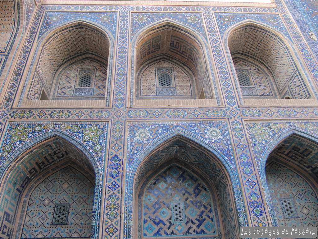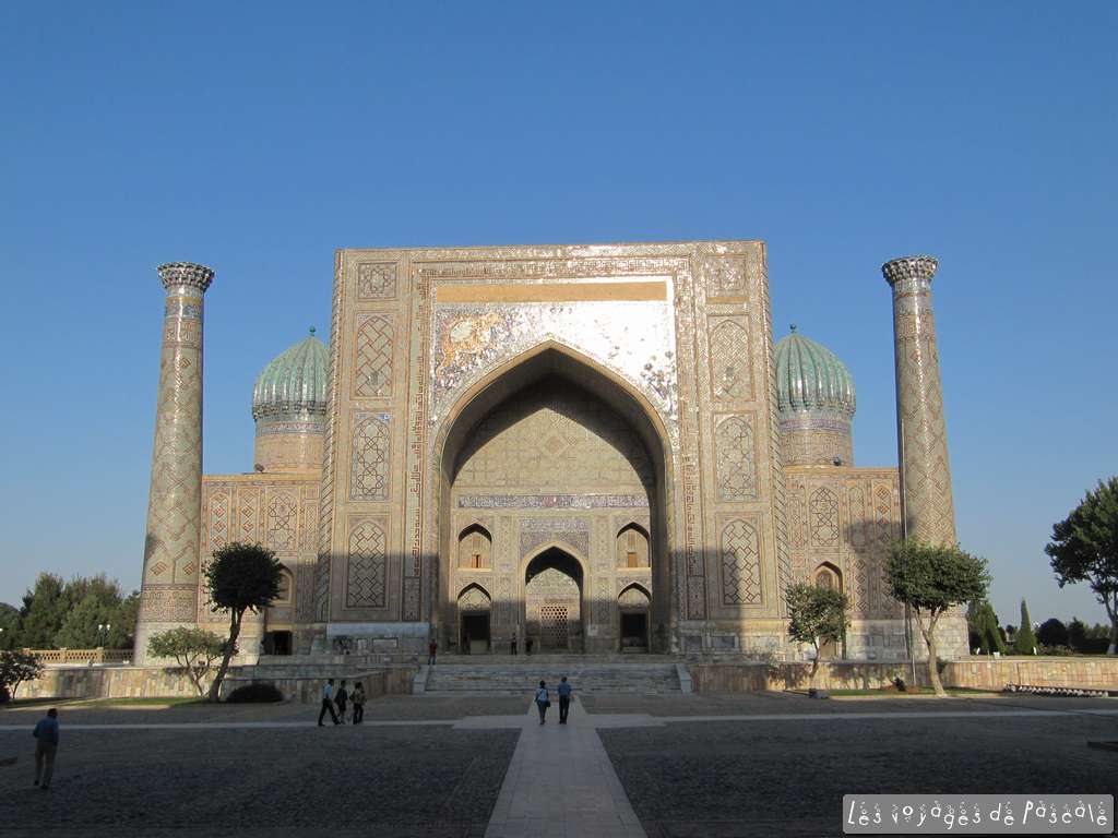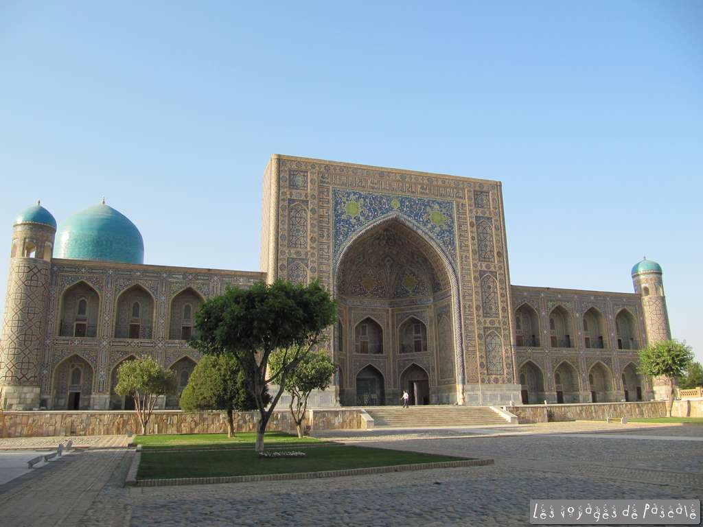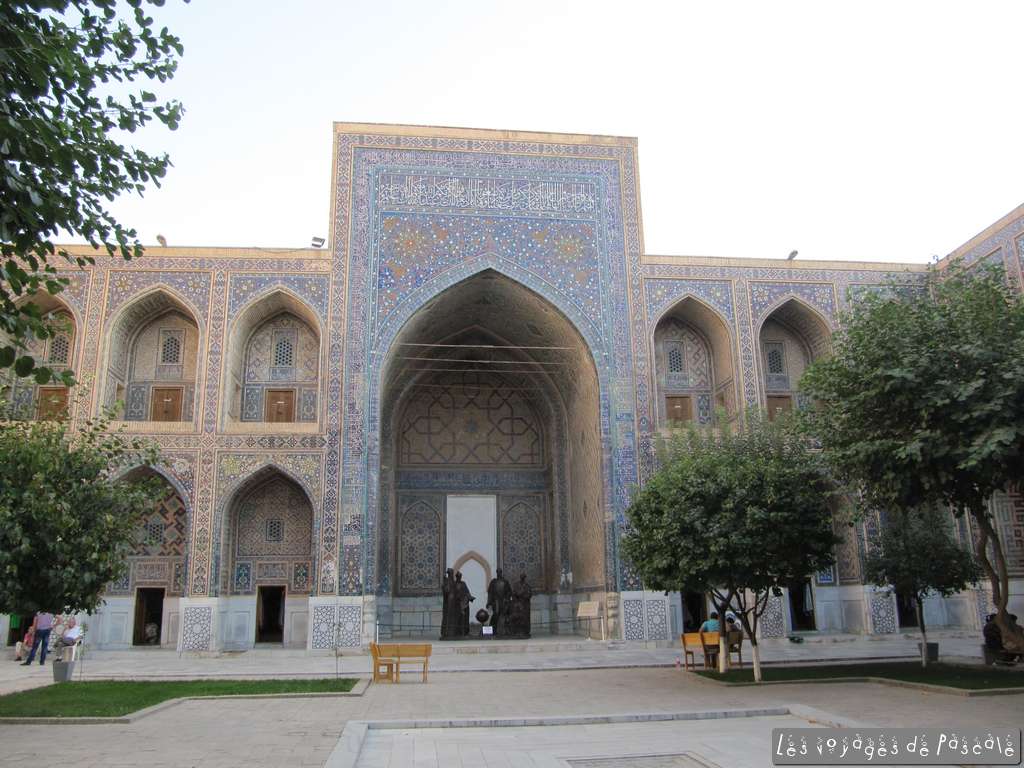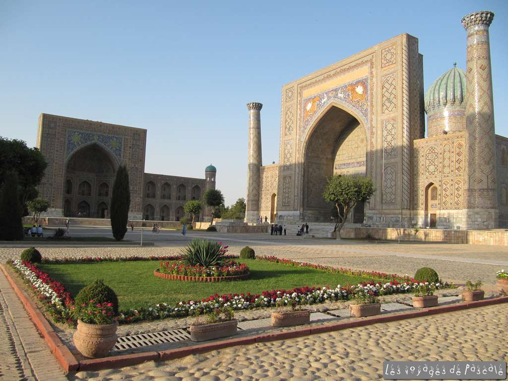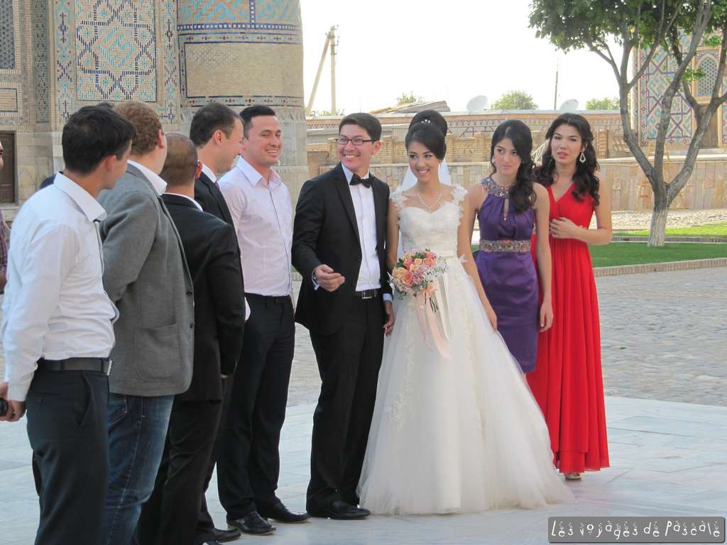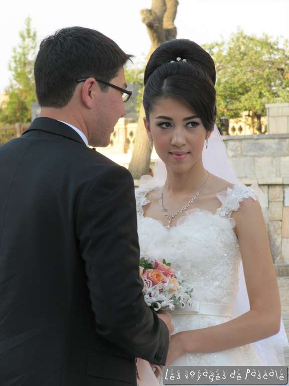 Nous sommes enfin arrivées à Samarcande à 13h passées. Le taxi qui aurait du nous couter 3000 à deux maxi a été dur à négocier, nous avons fini par baisser les bras à 4000 chacune. Puis nous nous sommes séparées, l’anglaise ayant réservé à un endroit et moi voulant aller à un autre. Finalement, pas de problème pour avoir une chambre pour deux nuits, la moins chère de mon séjour pour l’instant, avec salle de bain partagée mais un wifi du tonnerre, j’ai l’impression que c’est salle de bain ou wifi, il faut choisir:-) Petite sieste au frais, il fait très très chaud et je suis allée visiter le monument le plus connu d’Asie Centrale, dixit le lonely planet, soit le Registan à Samarcande. C’est vrai que c’est plutot impressionnant, bien entretenu et au milieu d’un parc plutot fleuri, ce qui est assez rare en Ouzbékistan depuis le début du voyage. Encore vu deux mariées, suis à 6 depuis le début de la semaine et ici, c’est plus chic moins provincial, les robes sont plus élégantes, on voit que la ville est plus riche.