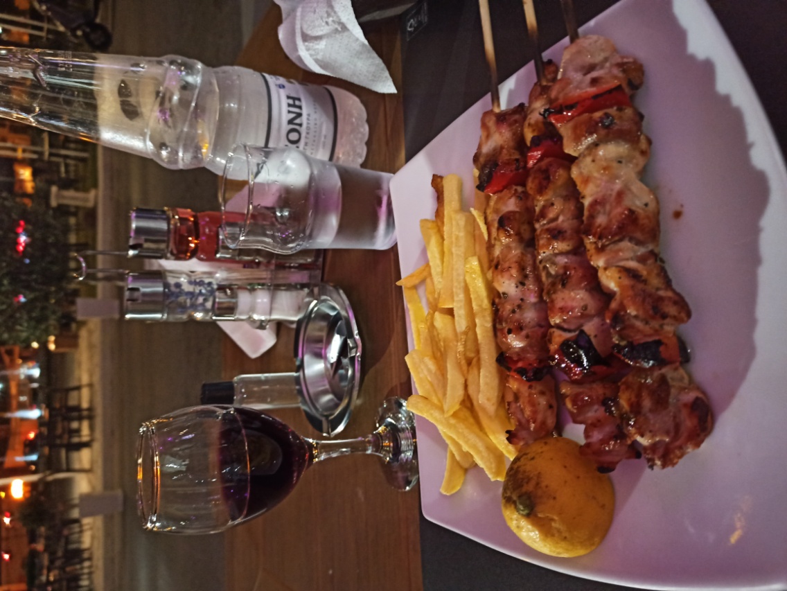 Une bonne surprise cet hôtel, accueil sympa, chambre pas mal et plus moderne qu’attendue, à 7mn à pieds du port où j’ai trouvé un resto pour mon premier dîner grec, souvlaki (brochettes) de poulet et un verre de vin rouge pour fêter le début des vacances !