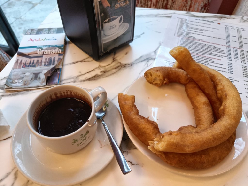Dernière matinée en Espagne, il est temps de faire un petit dej chocolate con churros. Je suis retournée là où j’avais pris un chocolat hier, car il était très bon. Les churros étaient bon aussi, pas très croustillants mais pas gras. A la différence de Cadix l’an dernier, c’étaient des gros churros pas des petits. Le minimum c’était 3, ça m’a fait un bon petit déjeuner.