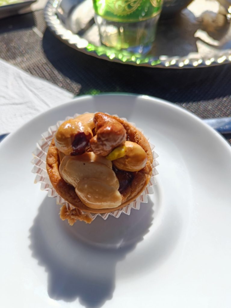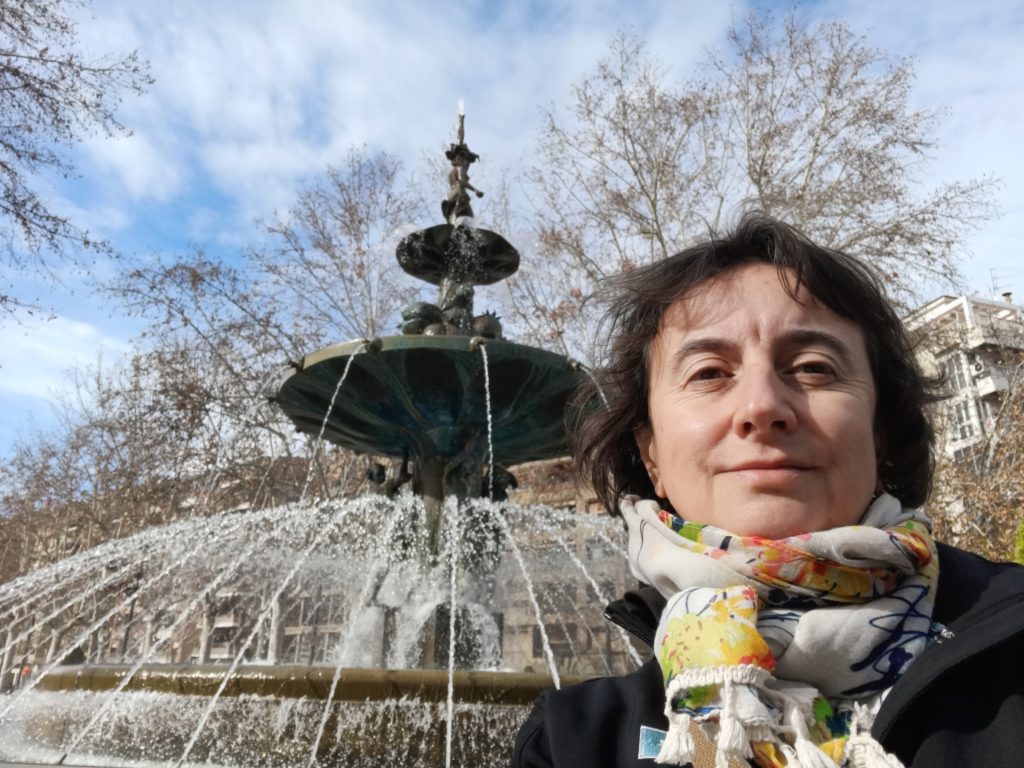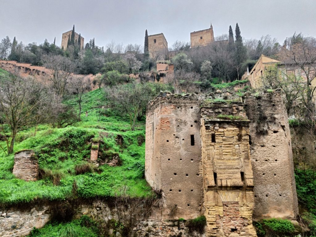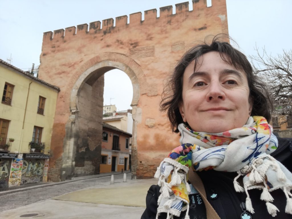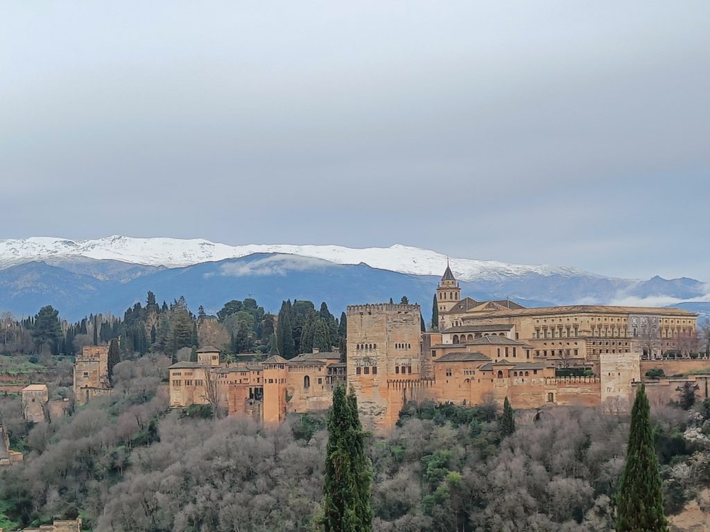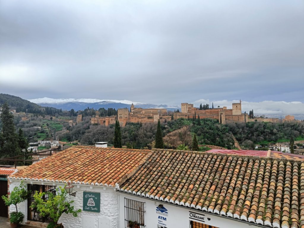 Ensuite, je suis encore partie me balader vers l’ouest, voir quelques églises, universités, murailles et portes arabes. On se croirait vraiment à Marrakech car c’est plutôt rouge que blanc ! Le ciel est toujours couvert, je suis repassée au belvédère St Nicolas, il avait du neiger car c’était plus blanc mais hélas toujours nuageux. Il a fallu attendre midi et la fin de ma balade pour que ça se lève. J’ai récupéré mon sac et après hésitation, j’ai décidé d’aller à la gare routière le plus tôt possible et de manger sur place. Et j’ai bien fait car j’ai attendu le bus 33 qui n’est jamais passé… Une nana nous a dit un truc en espagnol en passant, une autre a traduit en disant que pas de bus 33 sur cette rue. Et effectivement en y regardant bien, la police semblait bloquer la rue…un peu de panique car c’est plus de 50mn de marche avec le sac et j’ai décidé d’aller prendre le métro (15mn de marche dont 5 dans la direction d’où je venais…). Je les ai faites au pas de charge, un type qui travaillait dans la station m’a aidée à prendre le ticket et m’a dit dans quel sens il fallait le prendre car rien n’était indiqué, pas un seul plan de lignes. Je suis arrivée à 13h, ouf, donc j’avais le temps de déjeuner. J’avais repéré un restaurant ‘al medina’ a priori marocain mais qui propose des falafels (hélas trop secs) et une sorte de salade tomates poivrons arrosés de thé à la menthe (lui par contre fameux), le tout en terrasse en plein soleil.