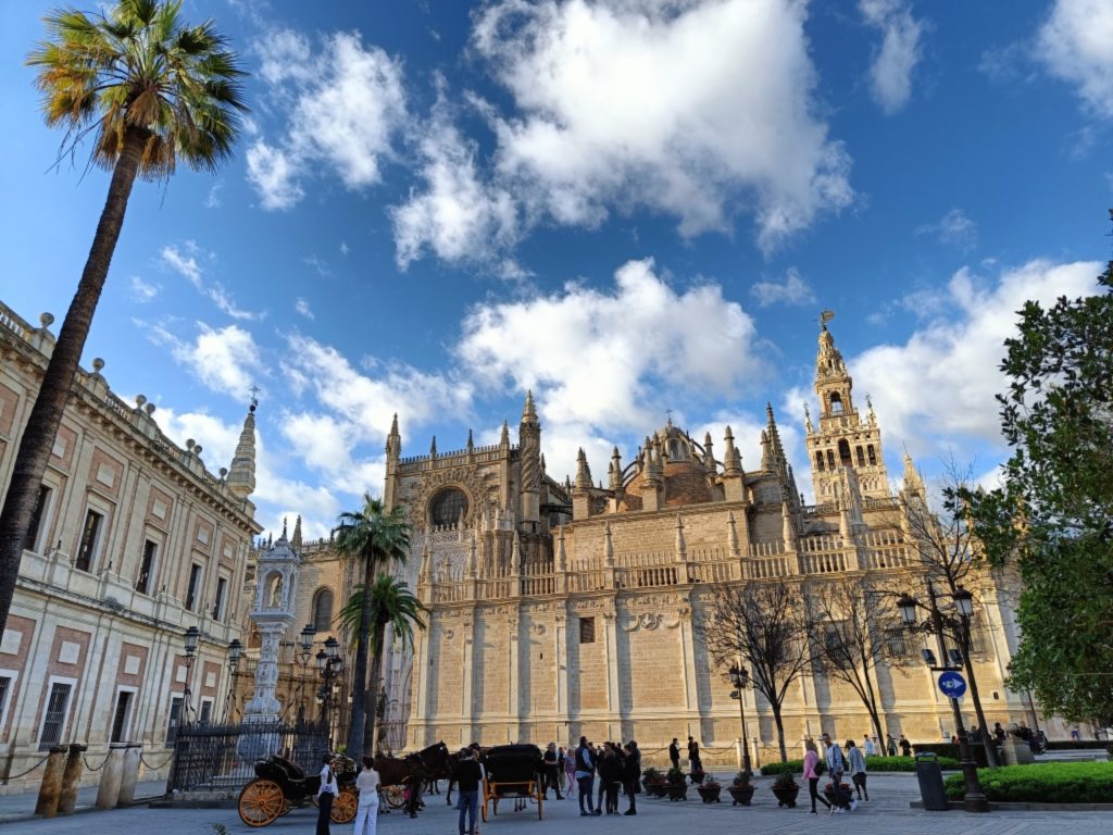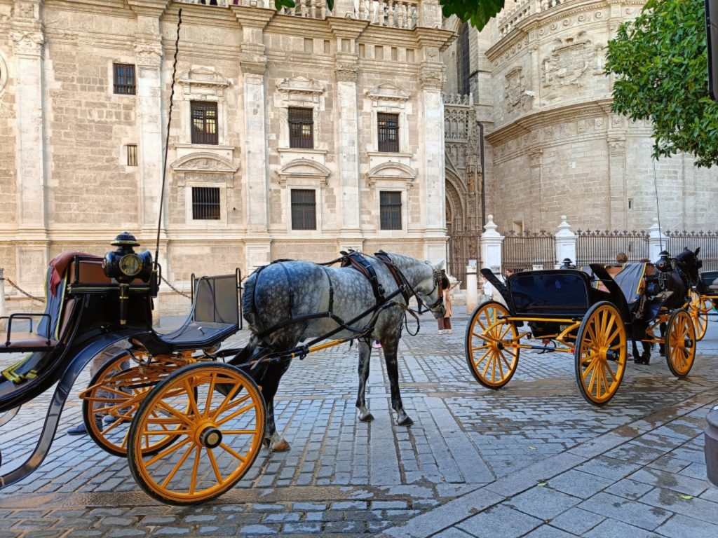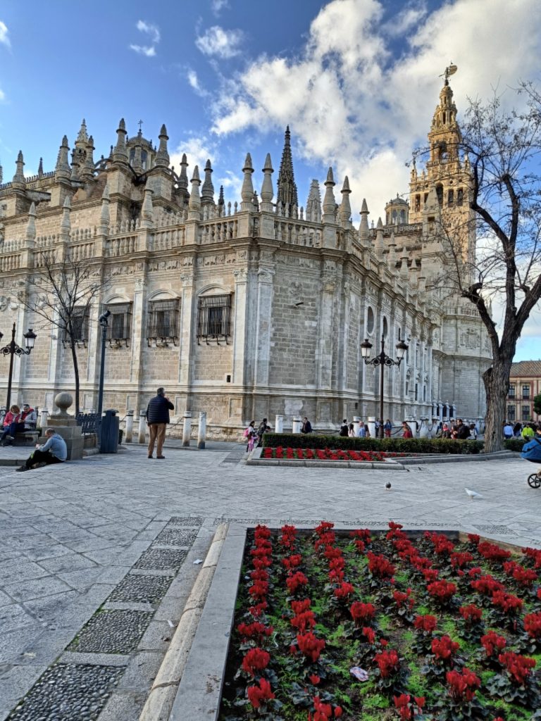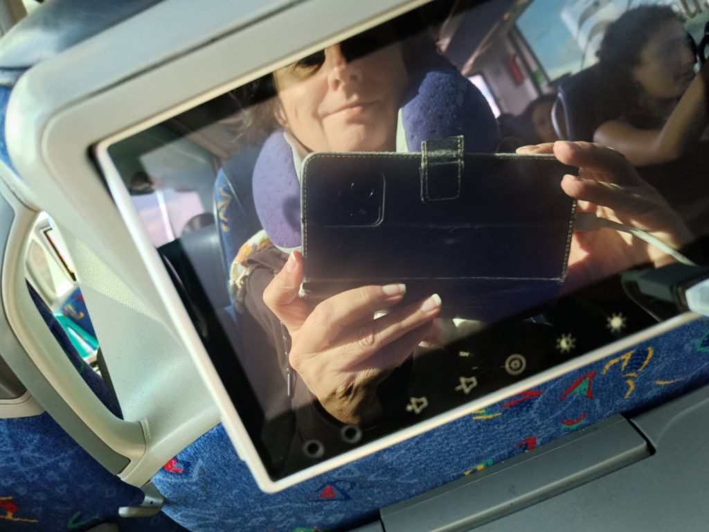 Départ du bus pour Séville à 14h précises, c’est parti pour 3h de route en traversant l’Andalousie vers l’ouest. Le bus est tout confort, y a même un écran comme dans un avion !