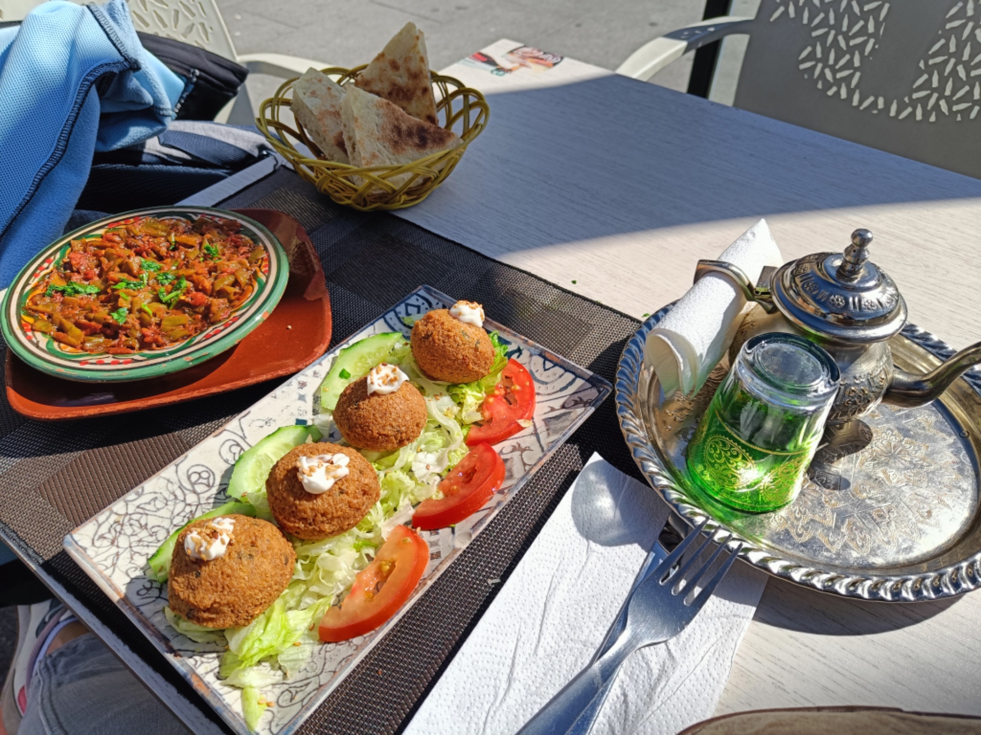 Ensuite, je suis encore partie me balader vers l’ouest, voir quelques églises, universités, murailles et portes arabes. On se croirait vraiment à Marrakech car c’est plutôt rouge que blanc ! Le ciel est toujours couvert, je suis repassée au belvédère St Nicolas, il avait du neiger car c’était plus blanc mais hélas toujours nuageux. Il a fallu attendre midi et la fin de ma balade pour que ça se lève. J’ai récupéré mon sac et après hésitation, j’ai décidé d’aller à la gare routière le plus tôt possible et de manger sur place. Et j’ai bien fait car j’ai attendu le bus 33 qui n’est jamais passé… Une nana nous a dit un truc en espagnol en passant, une autre a traduit en disant que pas de bus 33 sur cette rue. Et effectivement en y regardant bien, la police semblait bloquer la rue…un peu de panique car c’est plus de 50mn de marche avec le sac et j’ai décidé d’aller prendre le métro (15mn de marche dont 5 dans la direction d’où je venais…). Je les ai faites au pas de charge, un type qui travaillait dans la station m’a aidée à prendre le ticket et m’a dit dans quel sens il fallait le prendre car rien n’était indiqué, pas un seul plan de lignes. Je suis arrivée à 13h, ouf, donc j’avais le temps de déjeuner. J’avais repéré un restaurant ‘al medina’ a priori marocain mais qui propose des falafels (hélas trop secs) et une sorte de salade tomates poivrons arrosés de thé à la menthe (lui par contre fameux), le tout en terrasse en plein soleil.
