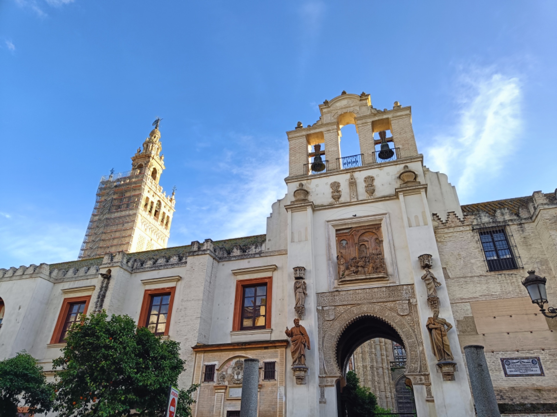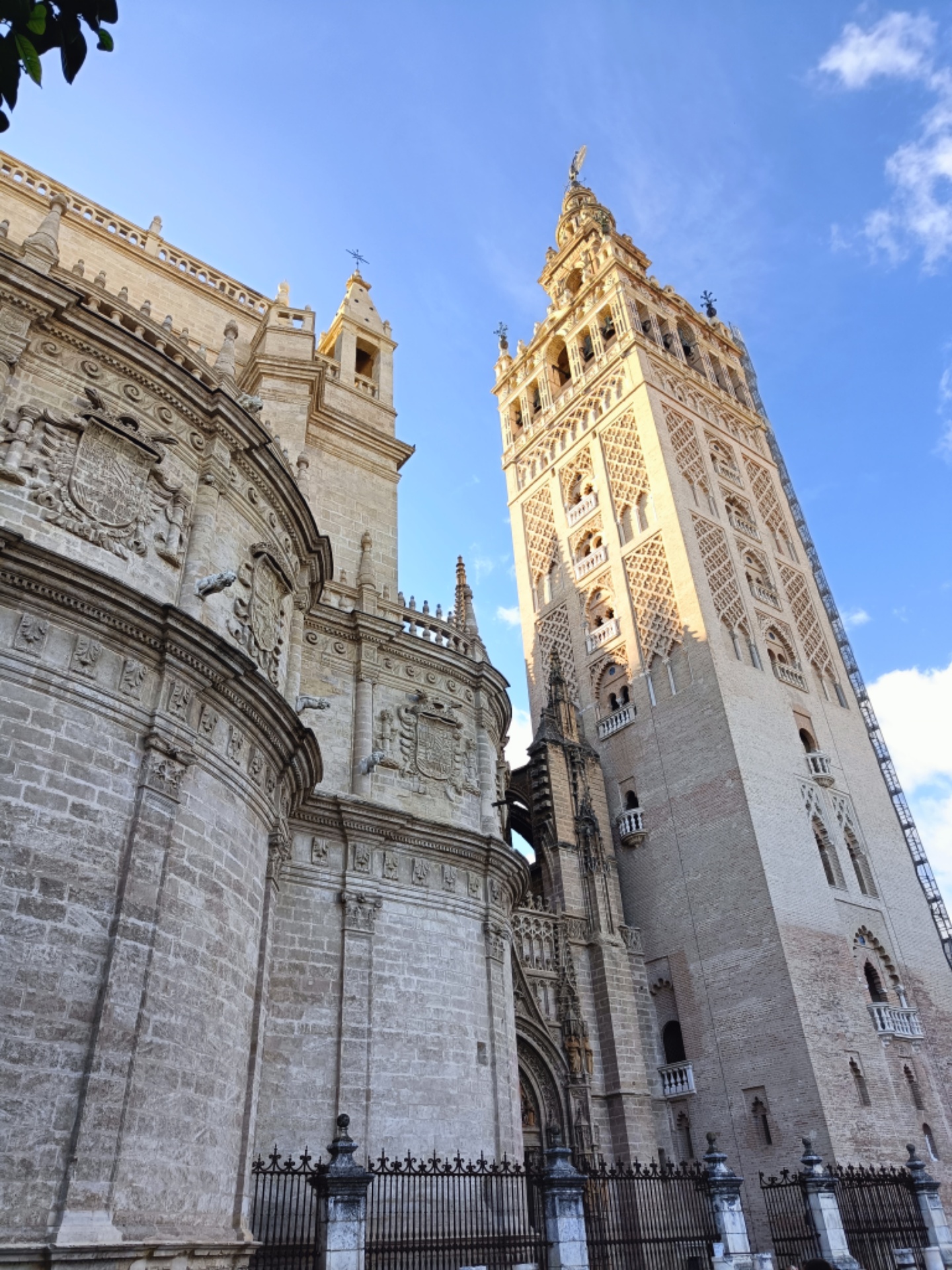 Départ du bus pour Séville à 14h précises, c’est parti pour 3h de route en traversant l’Andalousie vers l’ouest. Le bus est tout confort, y a même un écran comme dans un avion !