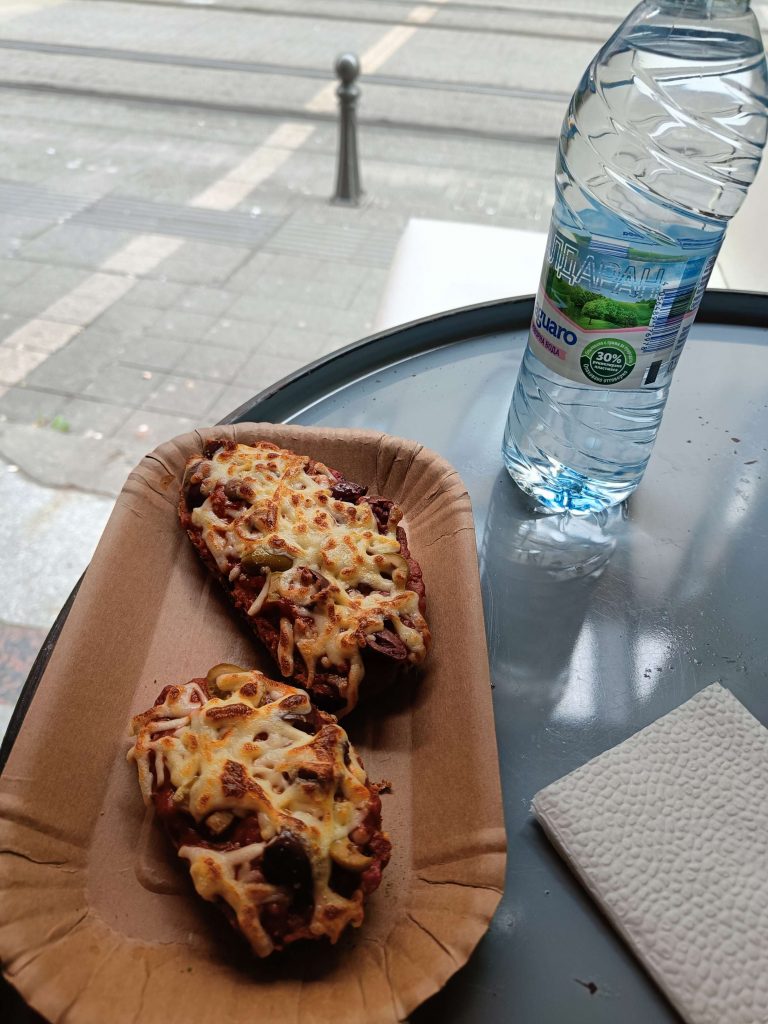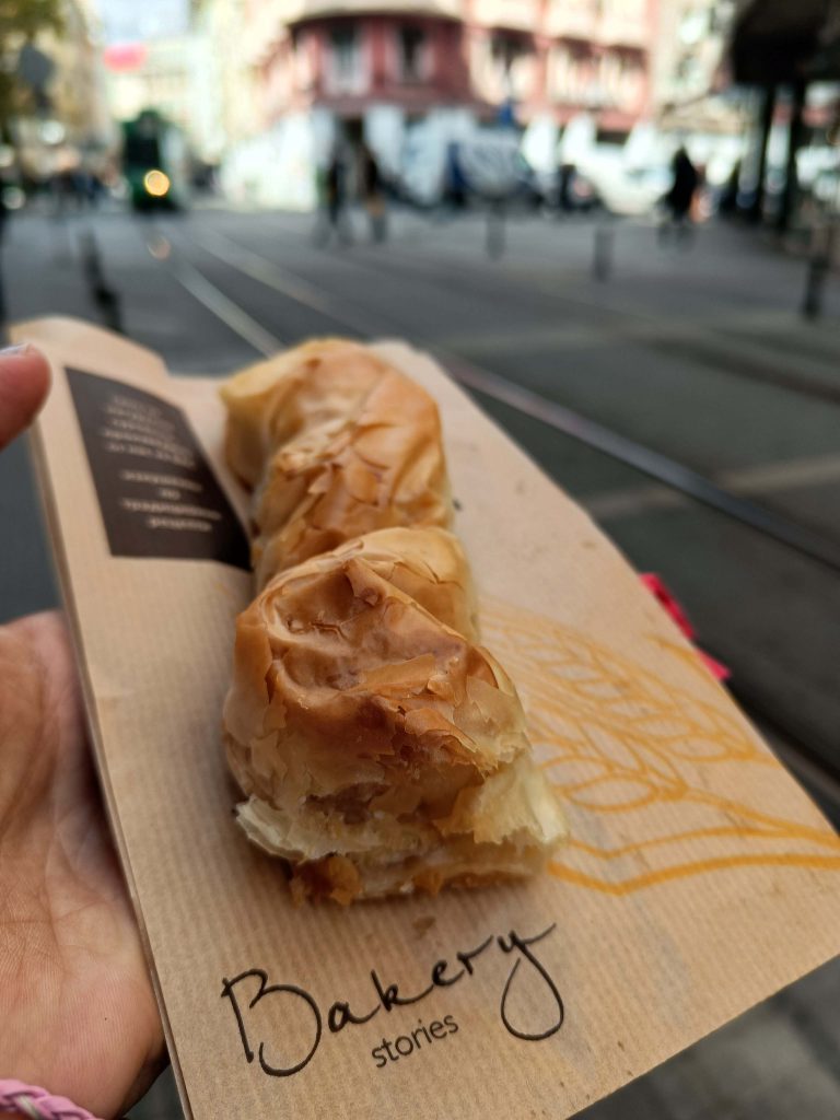 Pour le déjeuner, je voulais faire léger vu le petit dej dans l’avion, j’ai trouvé un petit bout boui qui fait des tartines avec du lyutenitsa (sauce poivron tomate piment) et du fromage pour celle que j’ai choisie. En boisson locale, il n’avait que de l’ayran, mais comme c’est du yaourt dilué et que je n’aime pas le yaourt, je n’ai pas donné suite ! C’etait bon la tartine, pas le truc du siècle mais c’était chaud et ça m’a fait du bien. J’ai enchaîné sur la pâtisserie à côté avec feuilleté aux pommes avec de la feuille de filo, pas mal mais pas non plus exceptionnel surtout que c’est facile à refaire à la maison.