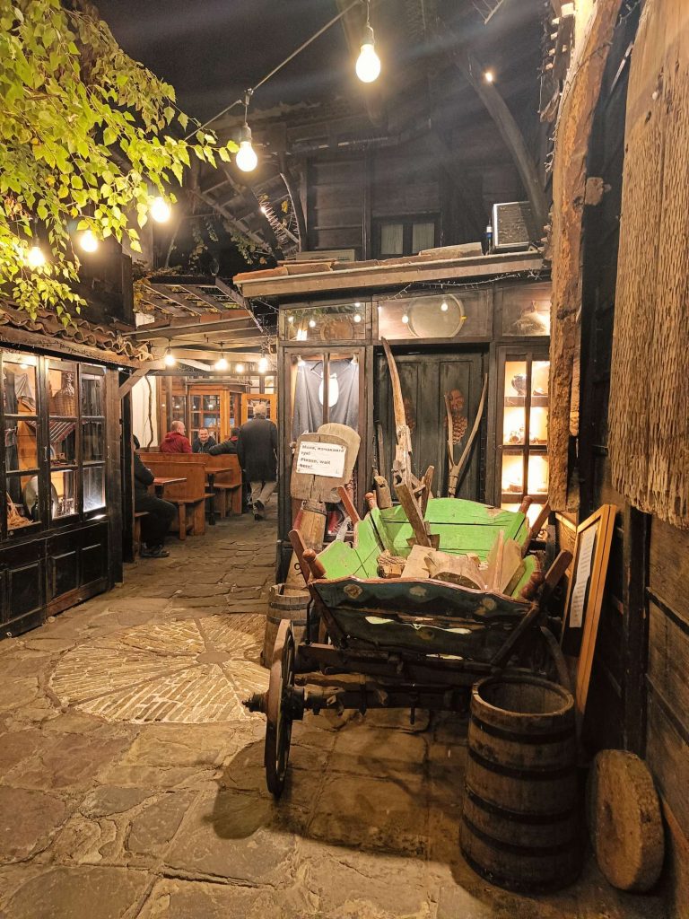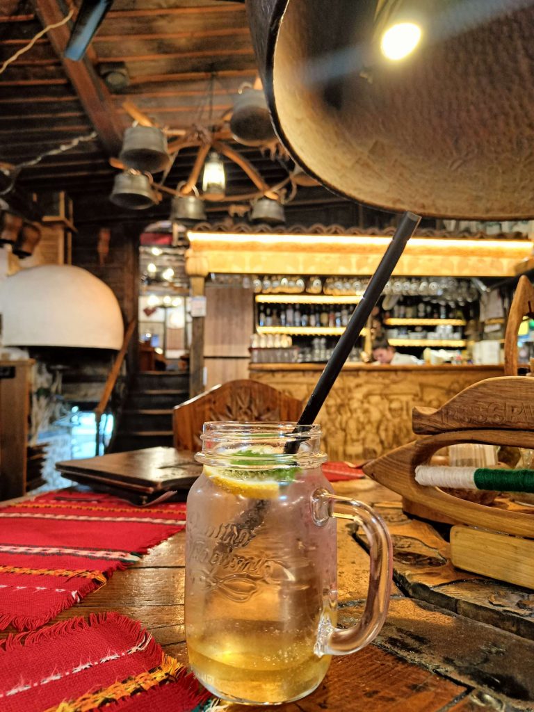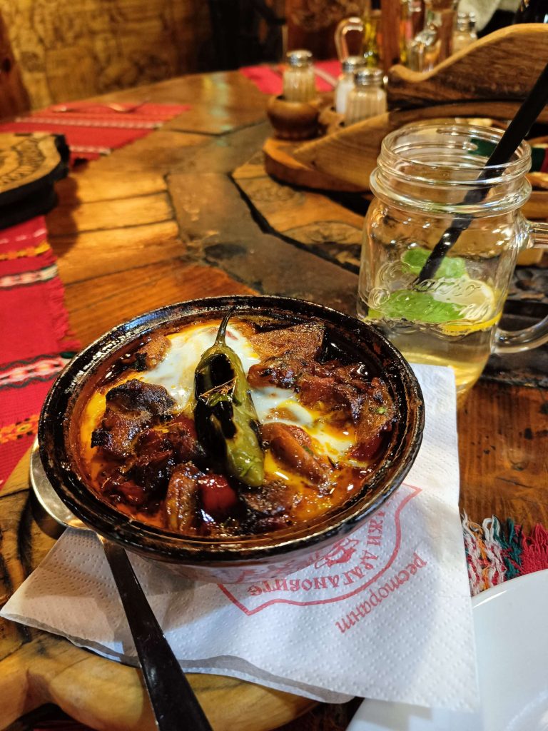 Par contre, j’ai trouvé un super resto un peu folklorique, avec une déco très slave, complet en réservation, alors il m’a casée à une grande table ronde avec déjà une personne seule. Franchement, c’était hyper bon, j’ai pris un kavarma, un ragoût de porc fondant avec poivrons, tomates et champignons. Délicieux. J’avais aussi pris du pain, on aurait dit de la brioche, et en boisson, une sorte de limonade faite maison très bonne aussi. C’était vraiment le final idéal pour cette découverte rapide de Sofia avant de partir demain pour l’étape suivante.