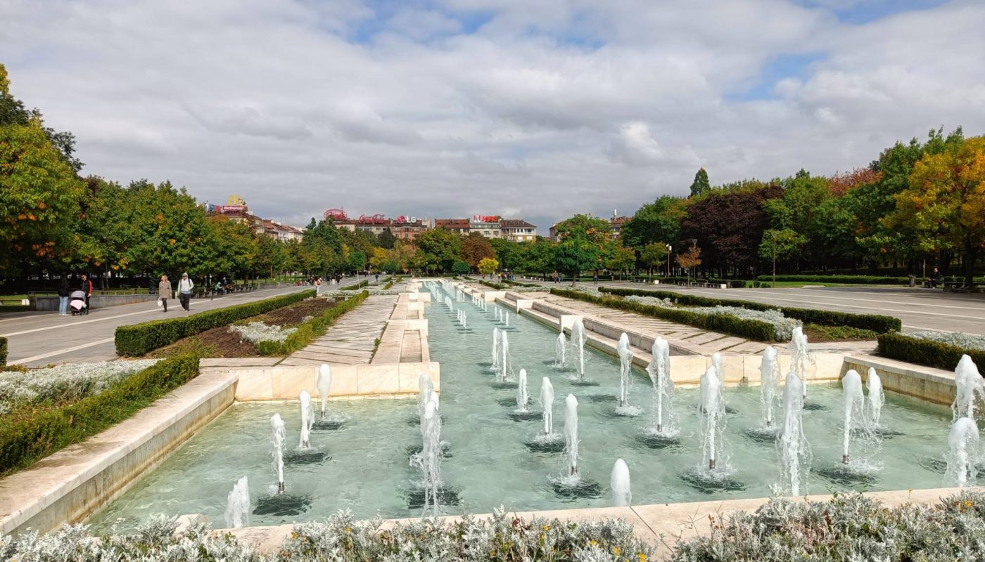 J’ai poussé jusqu’au palais de la culture (très moche) mais par contre les fontaines devant sont très belles. C’était chouette, le soleil commençait à pointer, et au loin je voyais une montagne avec de la neige.. hier matin j’étais en Grèce à me baigner, maintenant le pourrais presque aller skier !