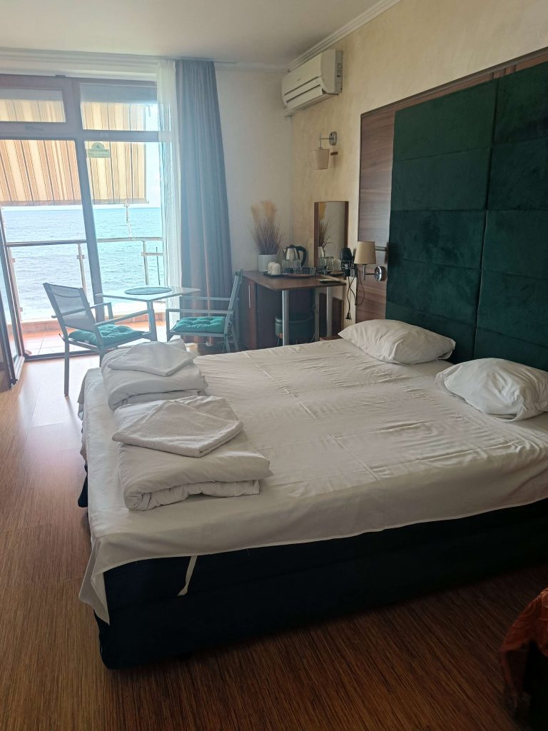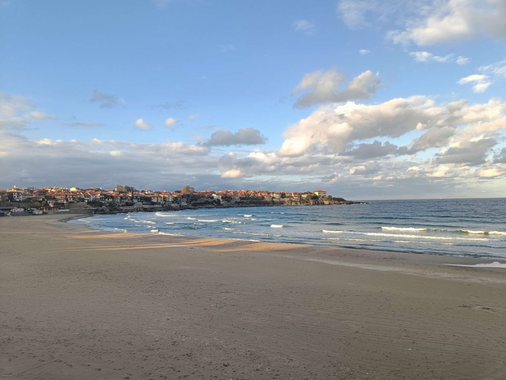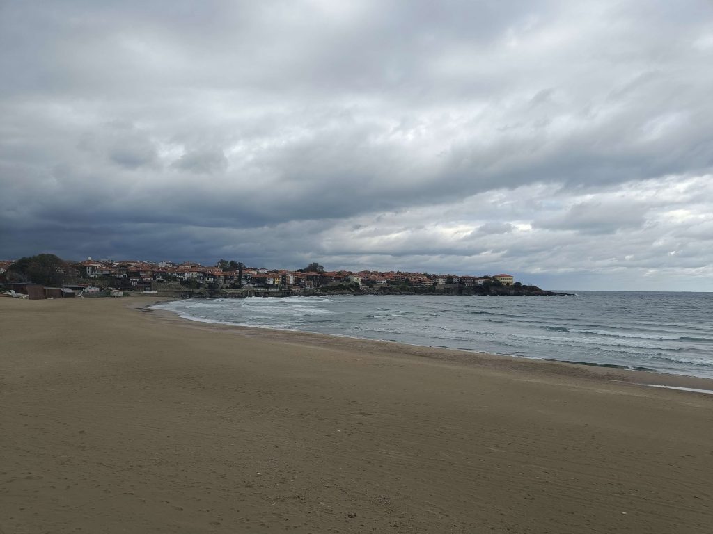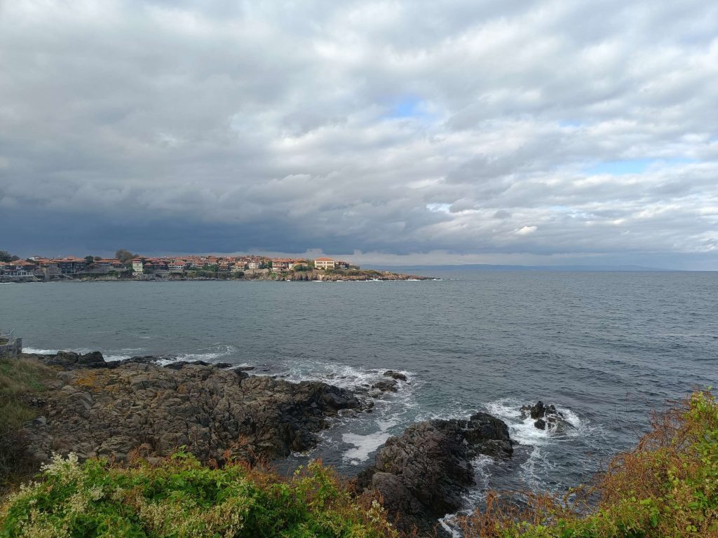 A Bourgas, il pleuvait carrément, mais pas eu le temps de me mouiller car je suis remontée dans un bus pour Sozopol. Je suis arrivée vers 15h sur Sozopol, avec des éclaircies qui commençait à apparaître. J’ai pris la direction de ma chambre mais grosse (mauvaise) surprise, tout est fermé. On dirait une ville fantôme en plus avec cette météo et la mer démontée. Y a même des gros tas de bois en attente de rangement ou déjà rangés, on sent que la ville se prépare pour l’hiver.