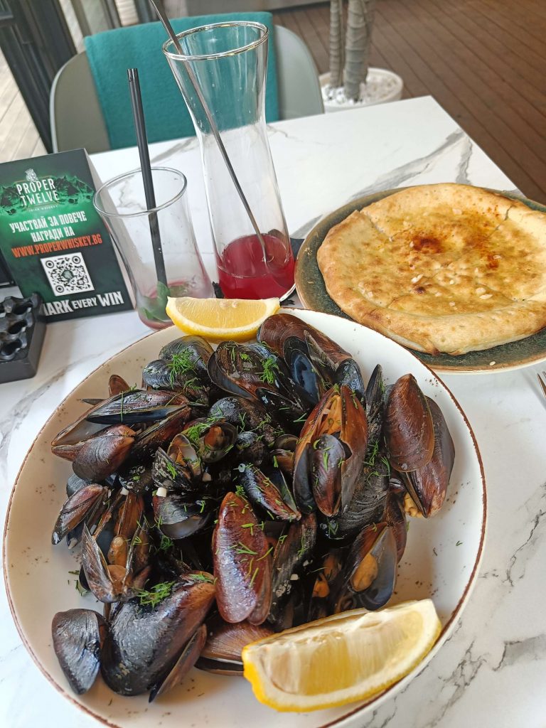 Ma chambre par contre est super, en surplomb de la mer, pas de vis à vis et lit XXL.J’ai un peu échangé avec deux Français qui cherchaient une chambre et qui mangeaient hier au même resto que moi, le monde est petit quand même. Mais je me suis mise en route pour trouver à manger à 17h, ce qui n’a pas été une mince affaire. Heureusement j’ai trouvé un resto pas trop mal dans la vieille ville, au pire, j’en ferai ma cantine si rien d’autre ouvert. Au menu de ce déjeuner : moules/pain/limonade à la grenade. Après ça, pas question de dîner ce soir, ce sera trop rapproché ! Alors j’ai fait quelques courses pour le petit dej vu le désert autour de moi. Mais arrivée à la chambre, je me suis rendu compte que pas de couteau ni cuillères, juste des touillettes, à voir comment ça va tartiner la confiture 🙂