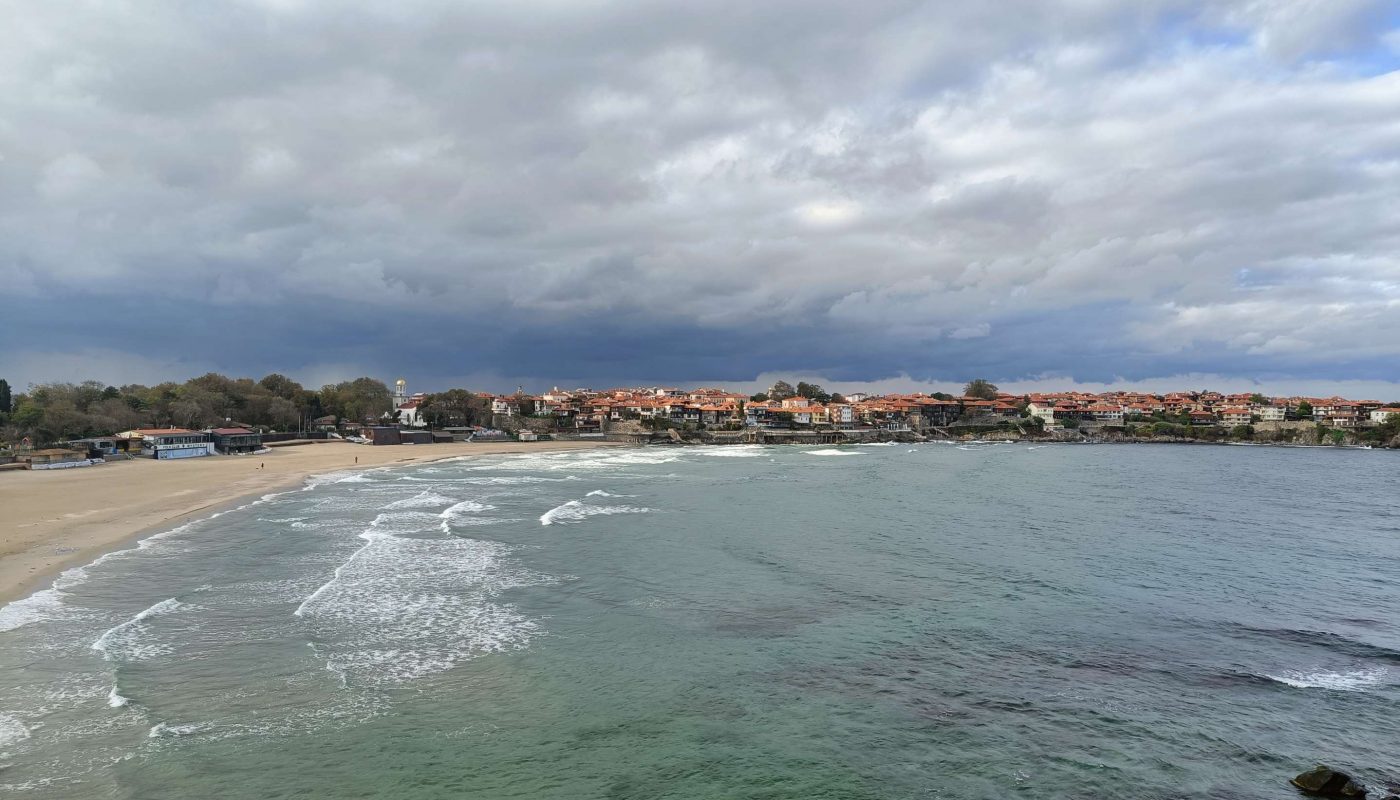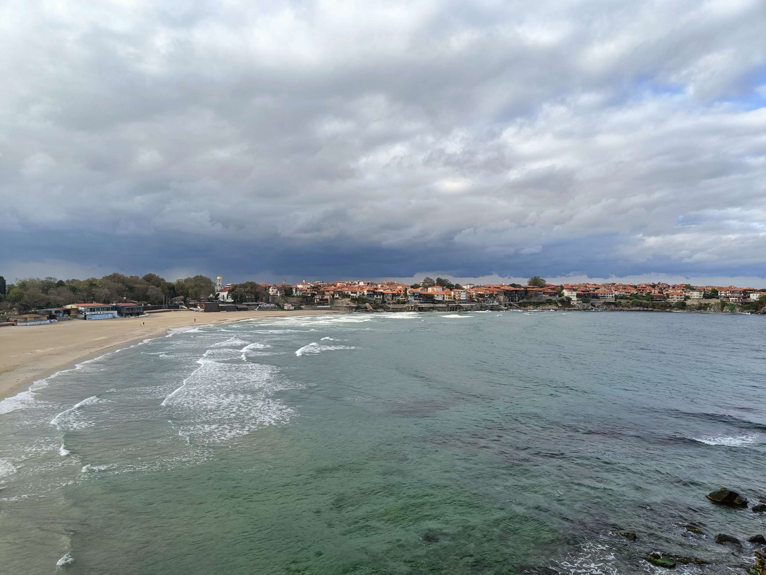 A Bourgas, il pleuvait carrément, mais pas eu le temps de me mouiller car je suis remontée dans un bus pour Sozopol. Je suis arrivée vers 15h sur Sozopol, avec des éclaircies qui commençait à apparaître. J’ai pris la direction de ma chambre mais grosse (mauvaise) surprise, tout est fermé. On dirait une ville fantôme en plus avec cette météo et la mer démontée. Y a même des gros tas de bois en attente de rangement ou déjà rangés, on sent que la ville se prépare pour l’hiver.