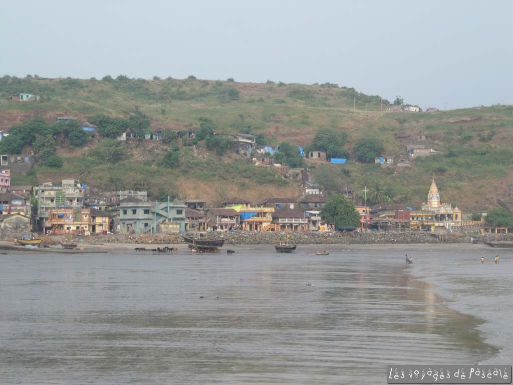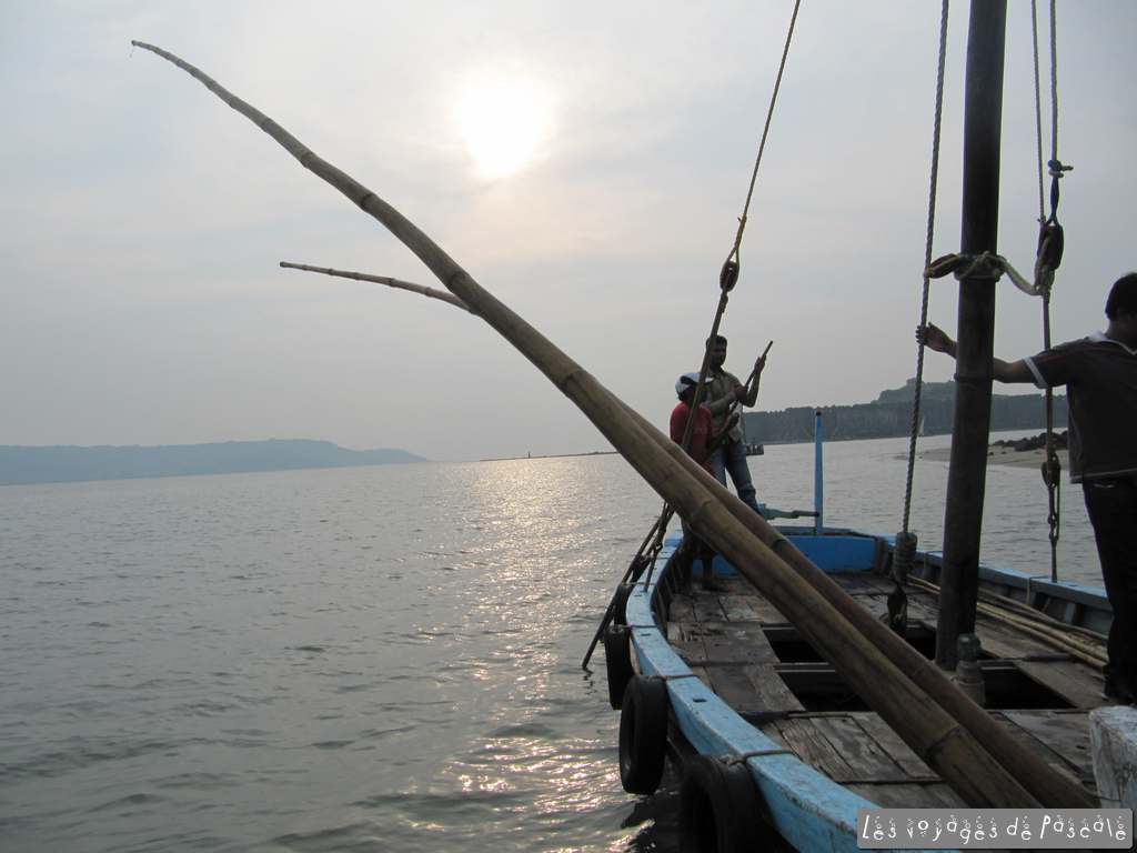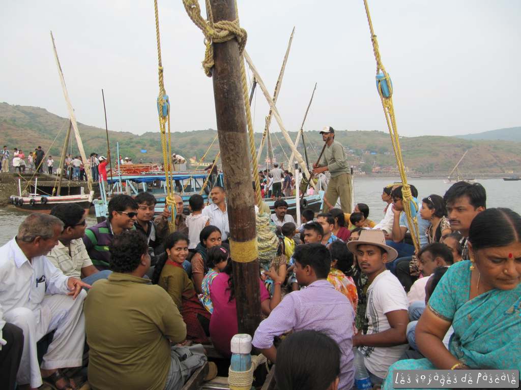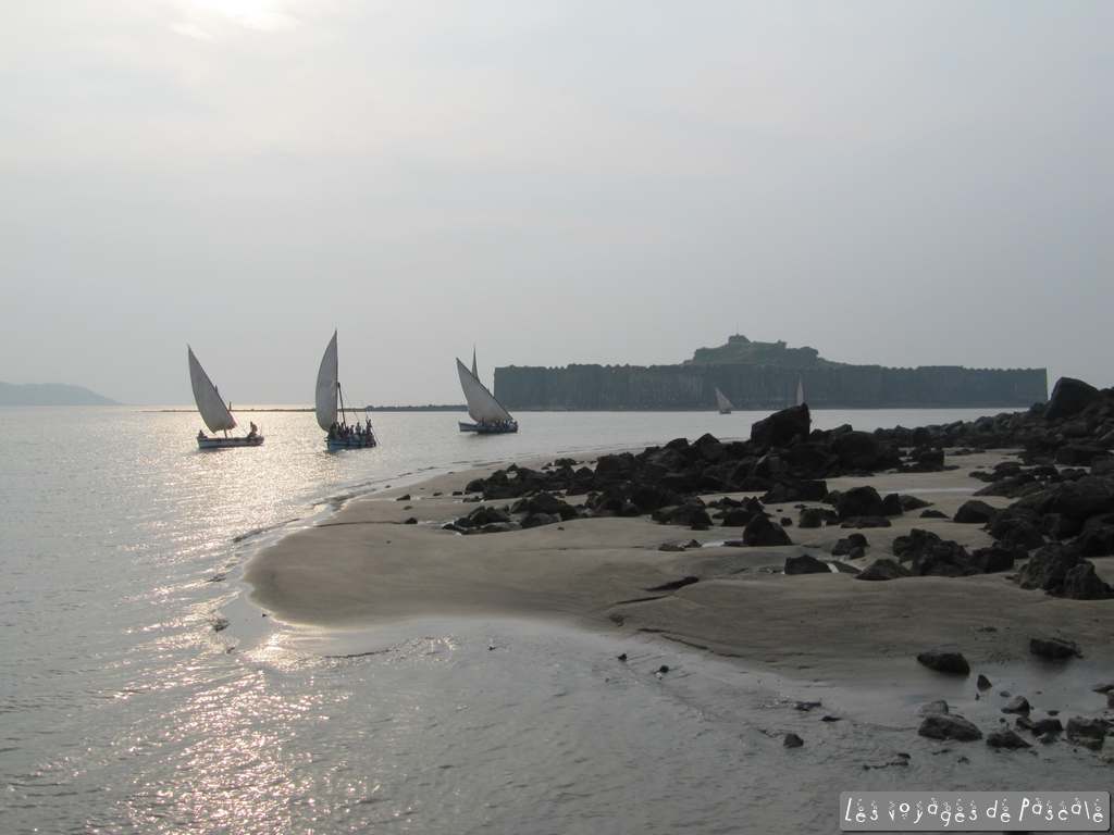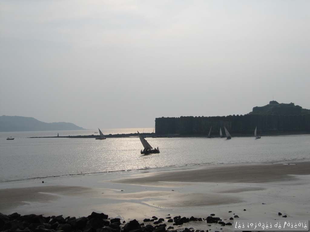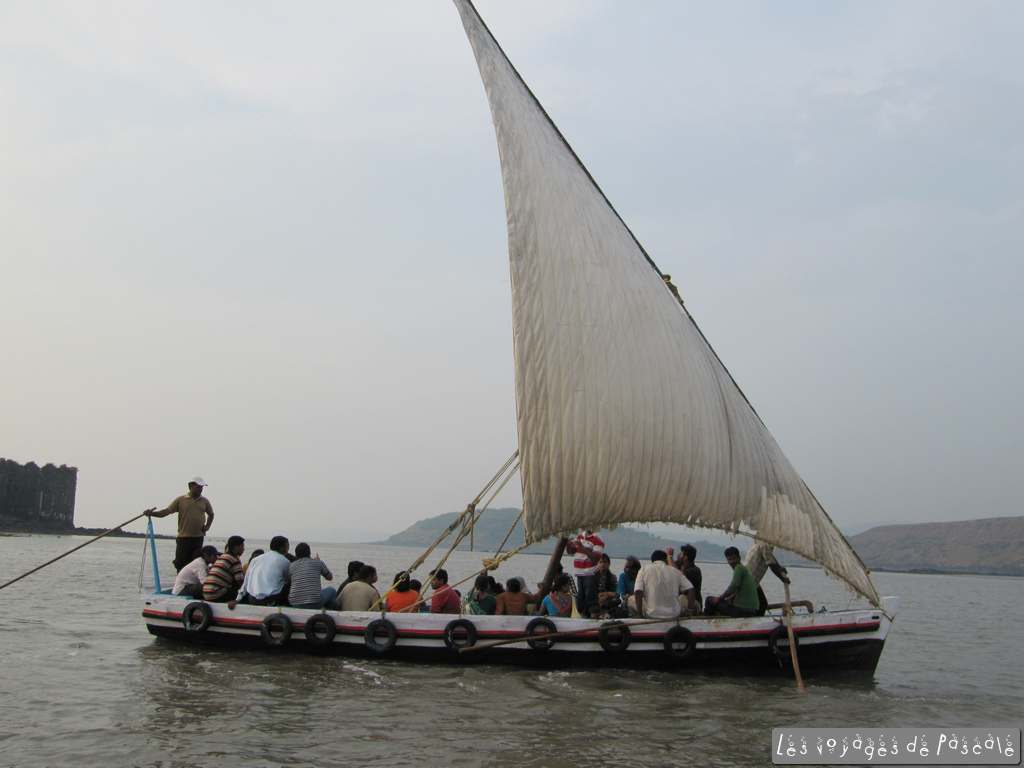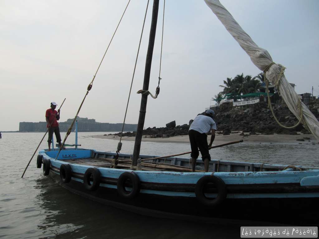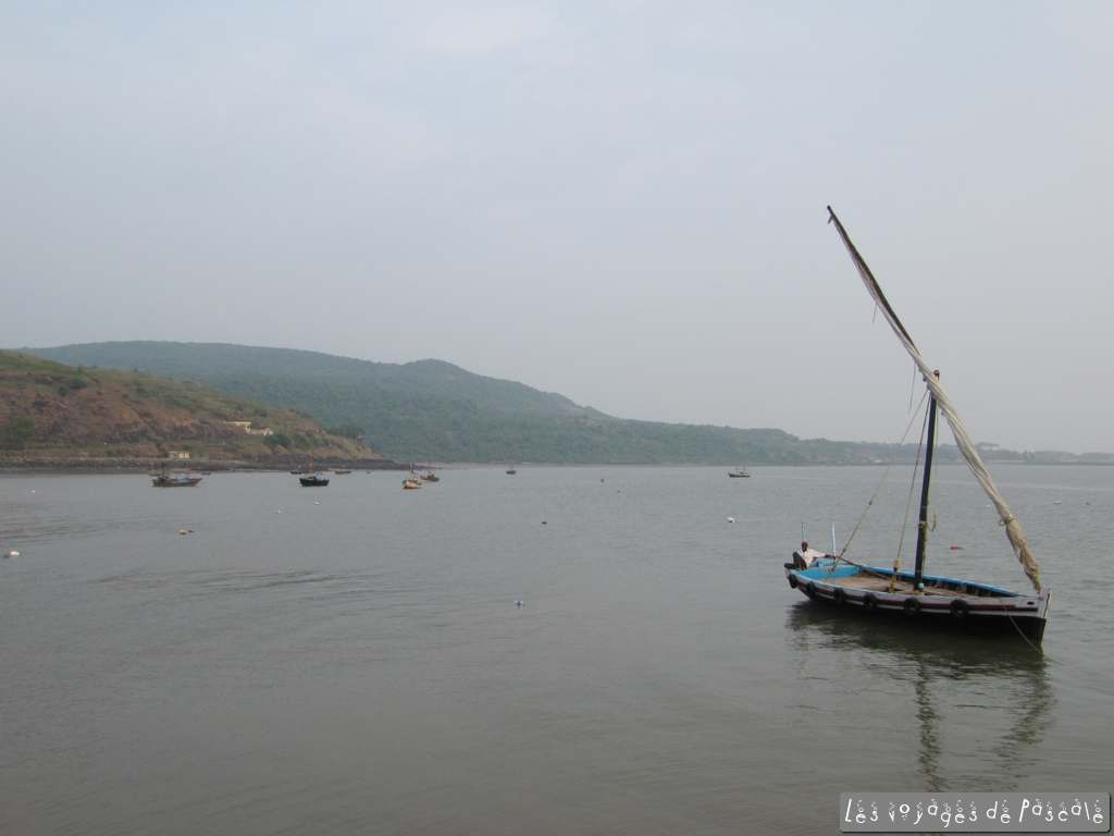 Dix sept km annoncés, parcourus en 40 mn, j’ai regardé le compteur avec plus d’attention, nous roulons souvent à 15 km/h, à cause des vaches, des véhicules en sens inverse, des routes dans un état pitoyable… j’ai même cru que nous n’arriverions pas à temps au fort, censé fermé à 17h30. Vu la foule qui attend le départ, pas de risque de le rater, la cerise sur le gateau, ce sont les bateaux qui nous y emmènent, des bateaux typiques (à voile latine me dit le spécialiste) et qui mettent vraiment la voile pour avancer. On embarque autant de passagers que le bateau peut en contenir (nous sommes encore les seuls blancs) et c’est parti pour une quinzaine de minutes de traversée. S’il n’y a pas assez de vent, les 3 membres d’équipage se servent d’une « pigouille » (c’est ce qu’on dirait dans les Deux-Sèvres !) ou d’une perche (pour les autres) pour toucher le fond et faire avancer le bateau. Le fort en lui-même est imposant, et en train d’être recouvert par la végétation. Super panorama sur la côte, un endroit encore bien plaisant. Nous revenons tranquillement sur Kashid beach pour la nuit avec un arret « beer bar » pour boire une bière (ici les restos ne semblent pas avoir de licence pour en vendre) et diner à notre guest house de 3 « thalis » (une assiette garnie riz, pain accompagnée soit de la viande  soit du végétarien) plus que bienvenus vu que nous n’avions pas déjeuné. J’ai converti Francis à mes habitudes, un bon petit déjeuner, rien le midi ou des fruits si ca se présente (il fait de toutes façons si chaud que l’appétit n’est pas forcément là) et un bon diner avant d’aller au lit !