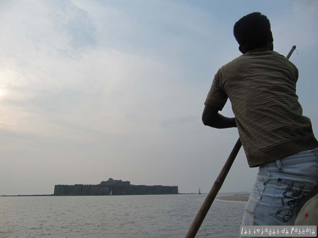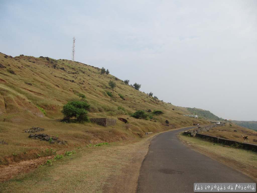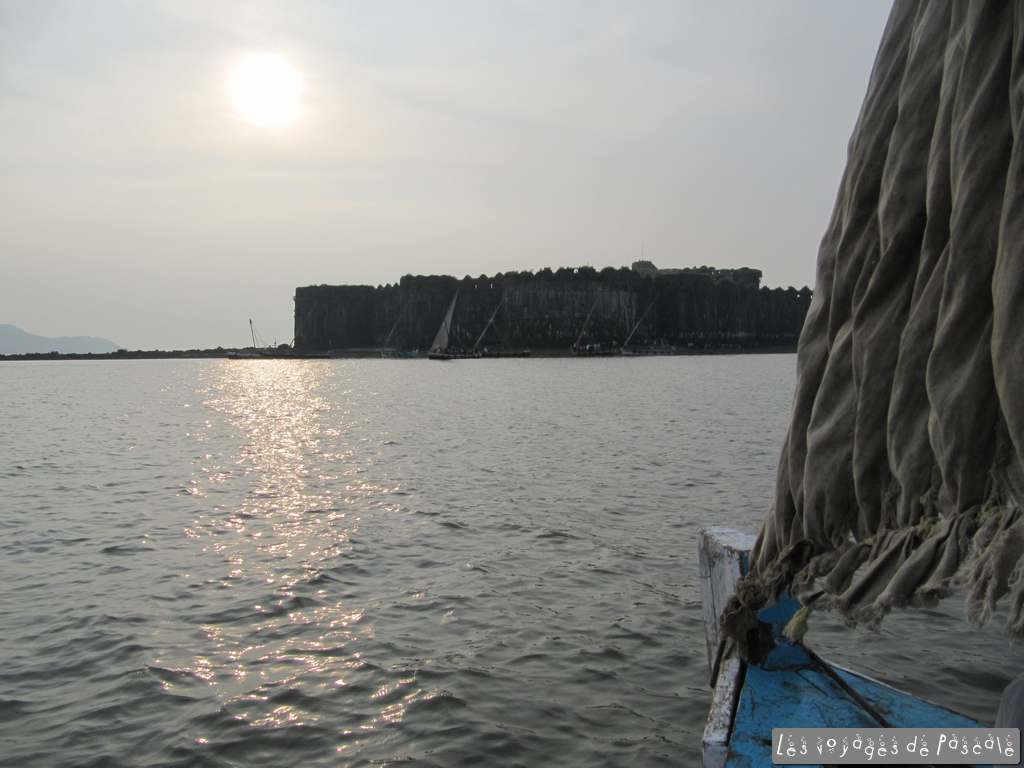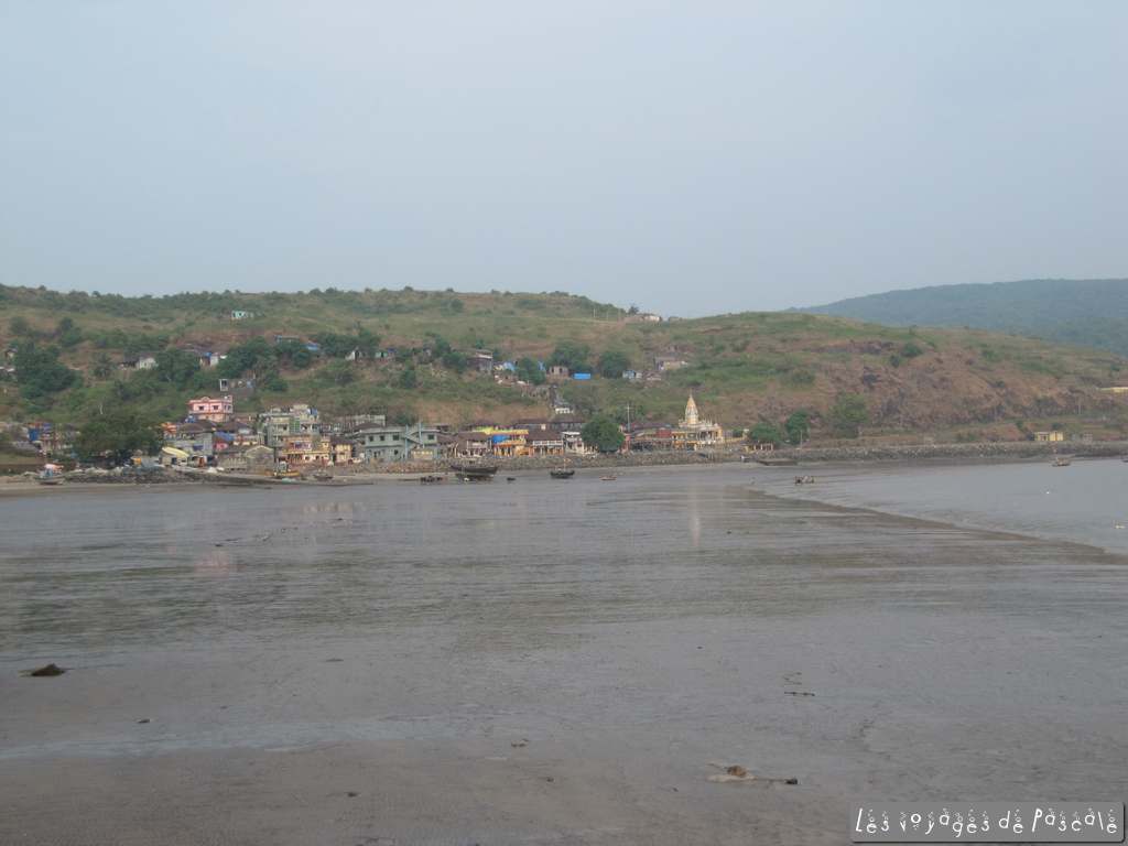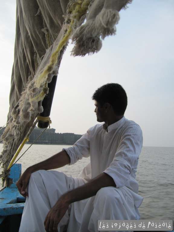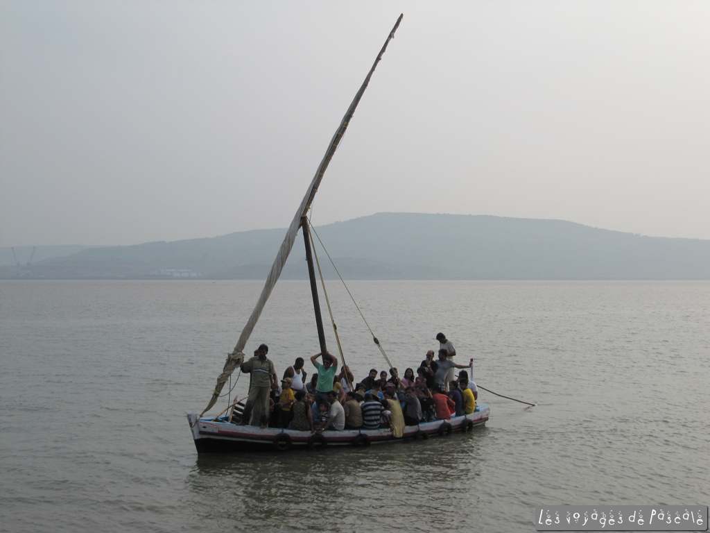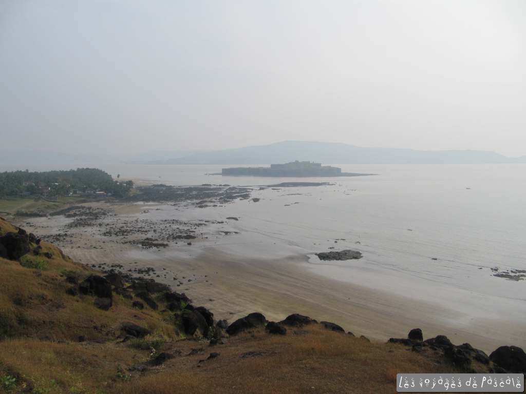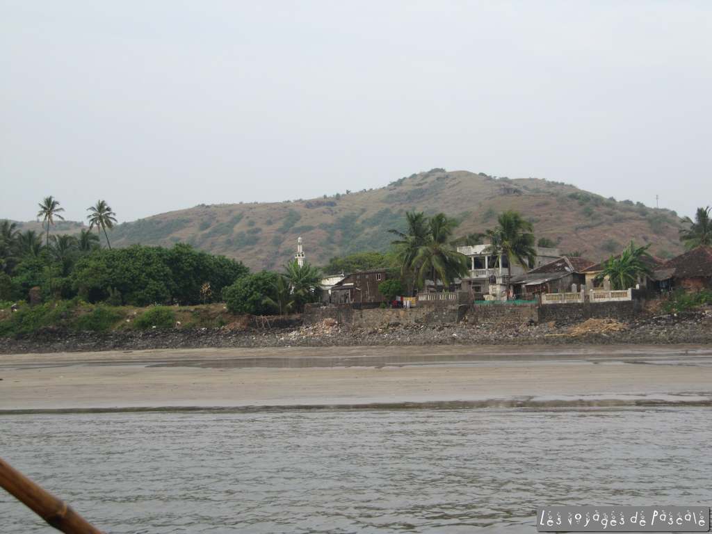 Dix sept km annoncés, parcourus en 40 mn, j’ai regardé le compteur avec plus d’attention, nous roulons souvent à 15 km/h, à cause des vaches, des véhicules en sens inverse, des routes dans un état pitoyable… j’ai même cru que nous n’arriverions pas à temps au fort, censé fermé à 17h30. Vu la foule qui attend le départ, pas de risque de le rater, la cerise sur le gateau, ce sont les bateaux qui nous y emmènent, des bateaux typiques (à voile latine me dit le spécialiste) et qui mettent vraiment la voile pour avancer. On embarque autant de passagers que le bateau peut en contenir (nous sommes encore les seuls blancs) et c’est parti pour une quinzaine de minutes de traversée. S’il n’y a pas assez de vent, les 3 membres d’équipage se servent d’une « pigouille » (c’est ce qu’on dirait dans les Deux-Sèvres !) ou d’une perche (pour les autres) pour toucher le fond et faire avancer le bateau. Le fort en lui-même est imposant, et en train d’être recouvert par la végétation. Super panorama sur la côte, un endroit encore bien plaisant. Nous revenons tranquillement sur Kashid beach pour la nuit avec un arret « beer bar » pour boire une bière (ici les restos ne semblent pas avoir de licence pour en vendre) et diner à notre guest house de 3 « thalis » (une assiette garnie riz, pain accompagnée soit de la viande  soit du végétarien) plus que bienvenus vu que nous n’avions pas déjeuné. J’ai converti Francis à mes habitudes, un bon petit déjeuner, rien le midi ou des fruits si ca se présente (il fait de toutes façons si chaud que l’appétit n’est pas forcément là) et un bon diner avant d’aller au lit !