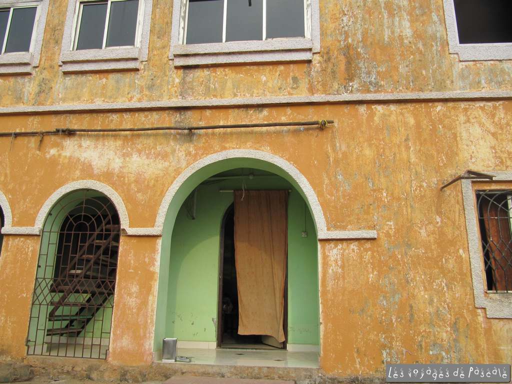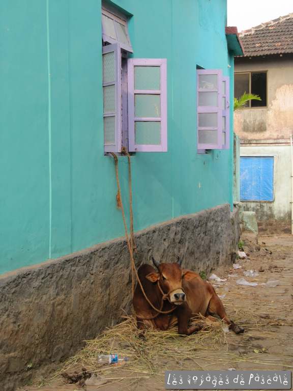 Journée cool, pas plus de 50 km aujourd’hui. On commence par un petit déjeuner au même endroit qu’hier, on ne veut pas manger à notre hôtel, car on a peur que la cuisine soit aussi sale que la chambre. Je teste encore de nouvelles crêpes au petit déjeuner (dont une grande comme un pancake avec des oignons et piments incrustés dedans), Francis reste sagement au toast/café. Je suis devenue aussi grande adepte du « chai », le thé local, au lait, aux épices et très sucré. Notre chauffeur nous attend pour une bonne heure de route (très défoncée), au cours de laquelle nous traversons des villages, des marais, des rizières moissonnées, des ports (souvent près d’un haut fourneau pour faciliter l’apport du minerai, Francis trouve que ca ressemble à la Moselle des années 70, les cocotiers et le beau temps en plus !). Je n’ose pas prendre de photo dans les villages, mais c’est très typique. Echoppes minuscules, chèvres, moutons, vaches au milieu de la route et des queues à toutes les boucheries ou magasins de volaille. Bizarre pour des végétariens, non ?