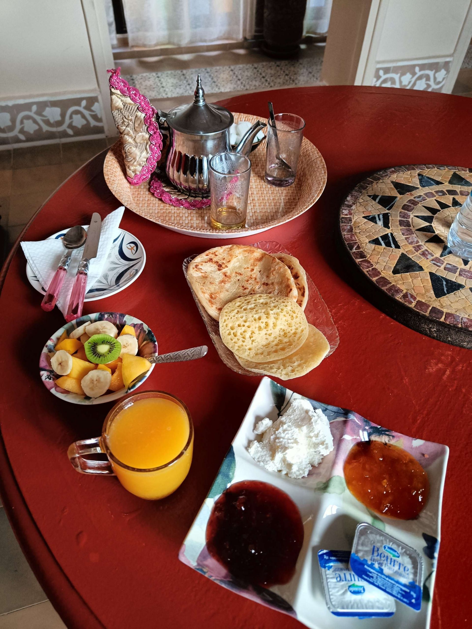 La nuit a été bruyante, un mariage apparemment, puis j’ai eu carrément du mal à m’endormir avec tout ce vent et cette pluie. Par sécurité, j’avais mis le réveil car les dames m’amenaient le petit dej à 9h. Heureusement, car avec le peu de lumière dans le riad, pas de risque d’être réveillé par le jour.