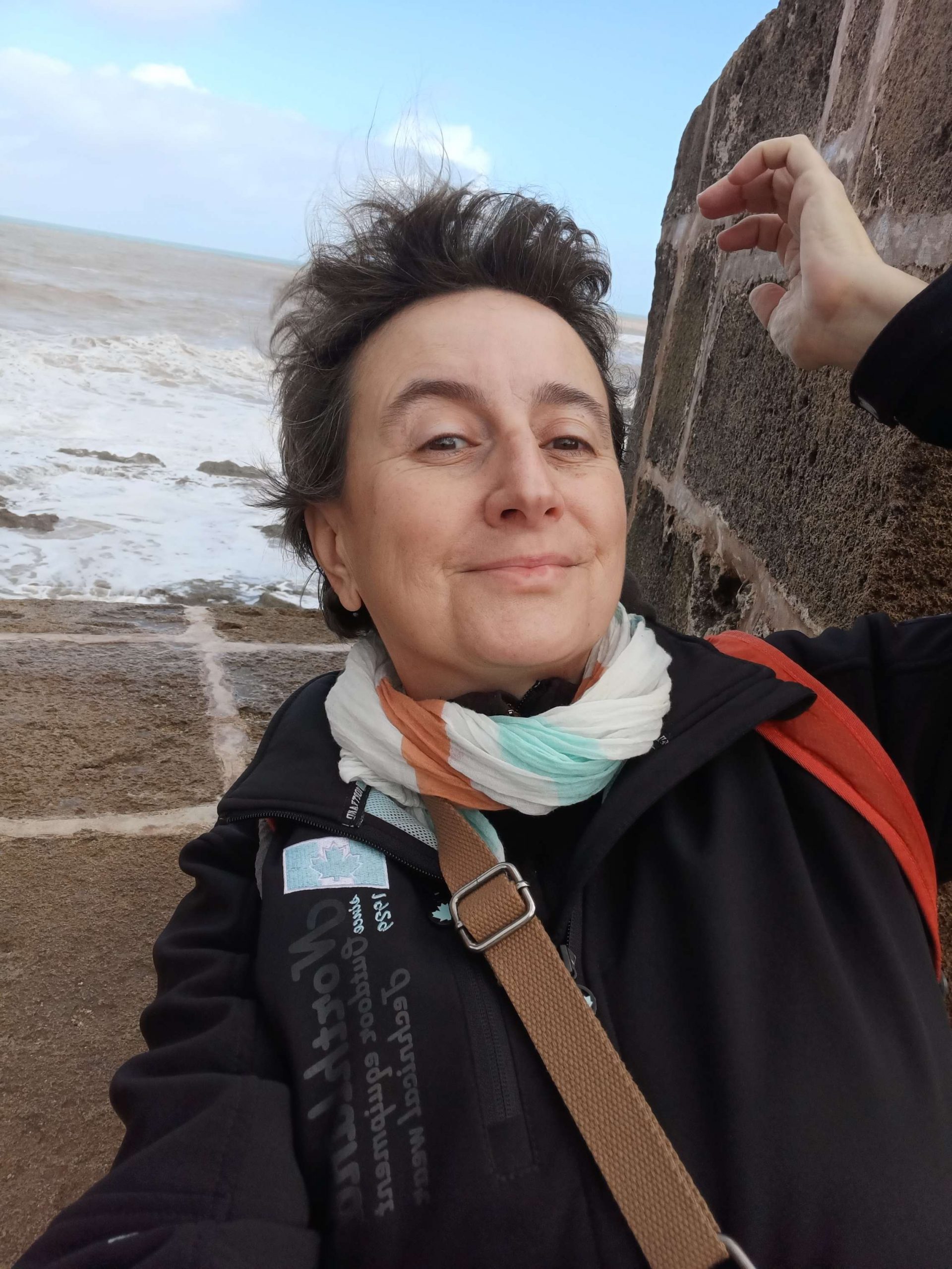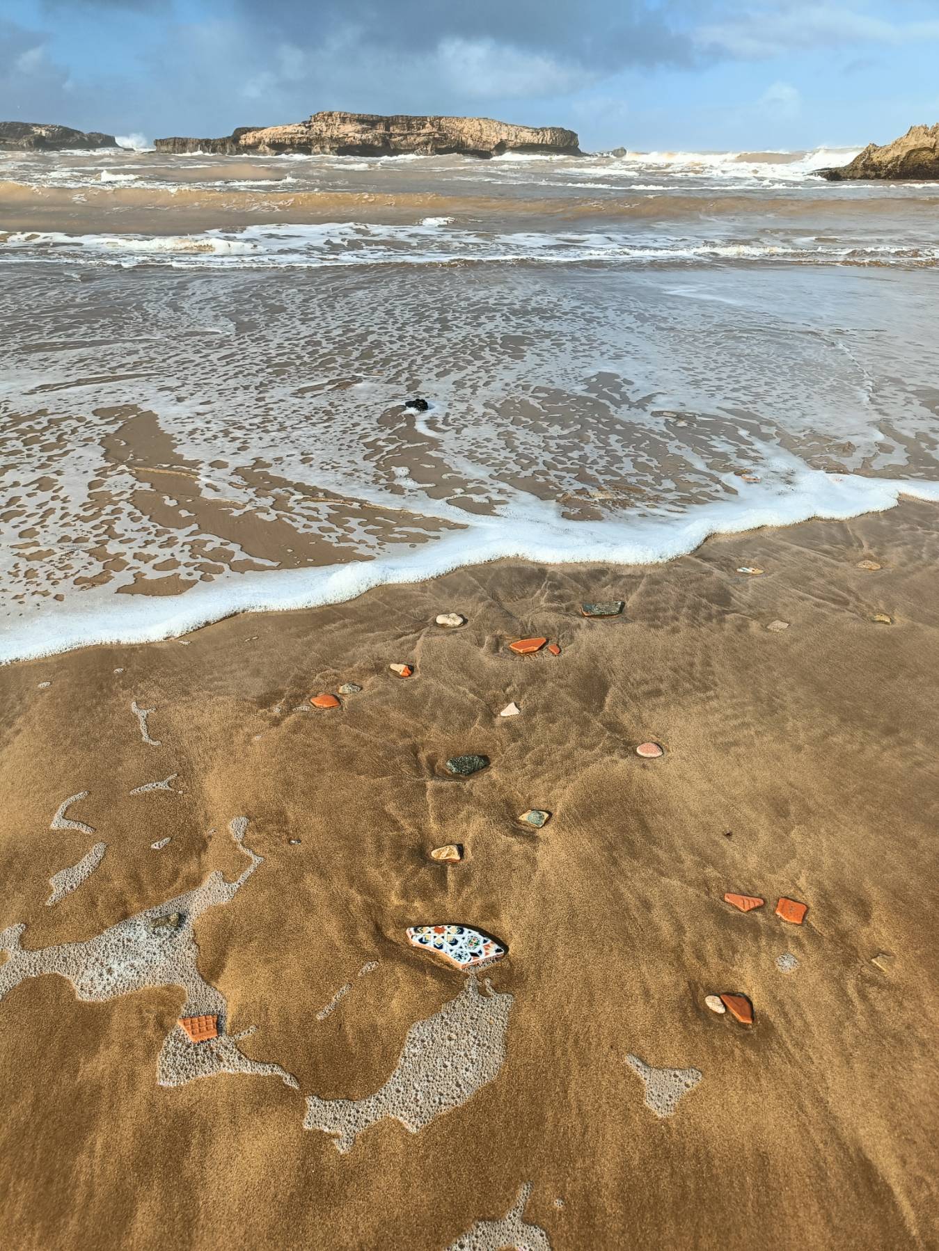 Je suis allée jusqu’à la porte Nord qui permet d’accéder à la plage, le reste de la ville étant ceint par les remparts. La mer est vraiment marron au premier plan et très agitée, mais bleue au loin sur l’horizon. Pas mal de déchets de construction dans la mer, les galets sont remplacés ici par des brisures de faïences polies.