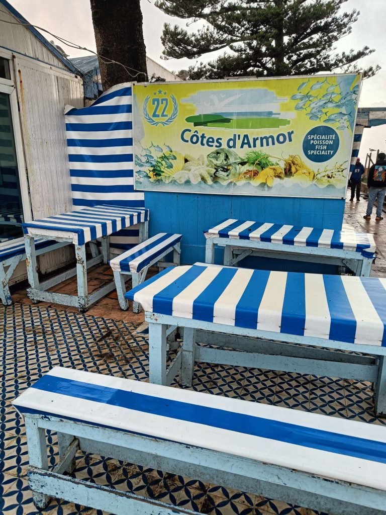 Vers 13h, je suis partie rejoindre Benoit le Toulousain au port de pêche, l’occasion de passer devant les restaus de poisson frais qui n’existaient pas sous cette forme il y a 25 ans ! Franchement ça fait envie mais le midi, je ne peux pas manger vu le petit déjeuner du matin et le soir, la plupart sont fermés. Ça ressemble un peu aux cabanes à huîtres d Arcachon, je trouve, avec des noms comme ’22- les côtes d’Armor’ ou ‘Saint-Malo’.