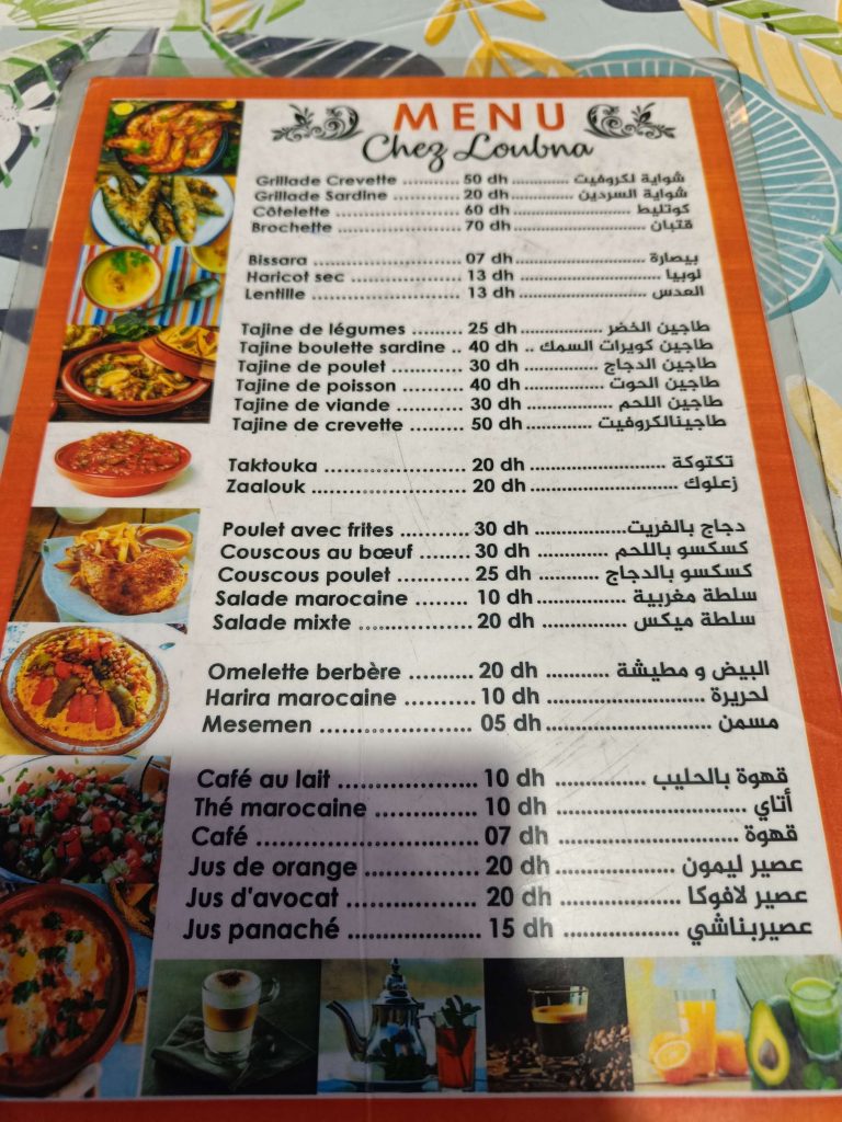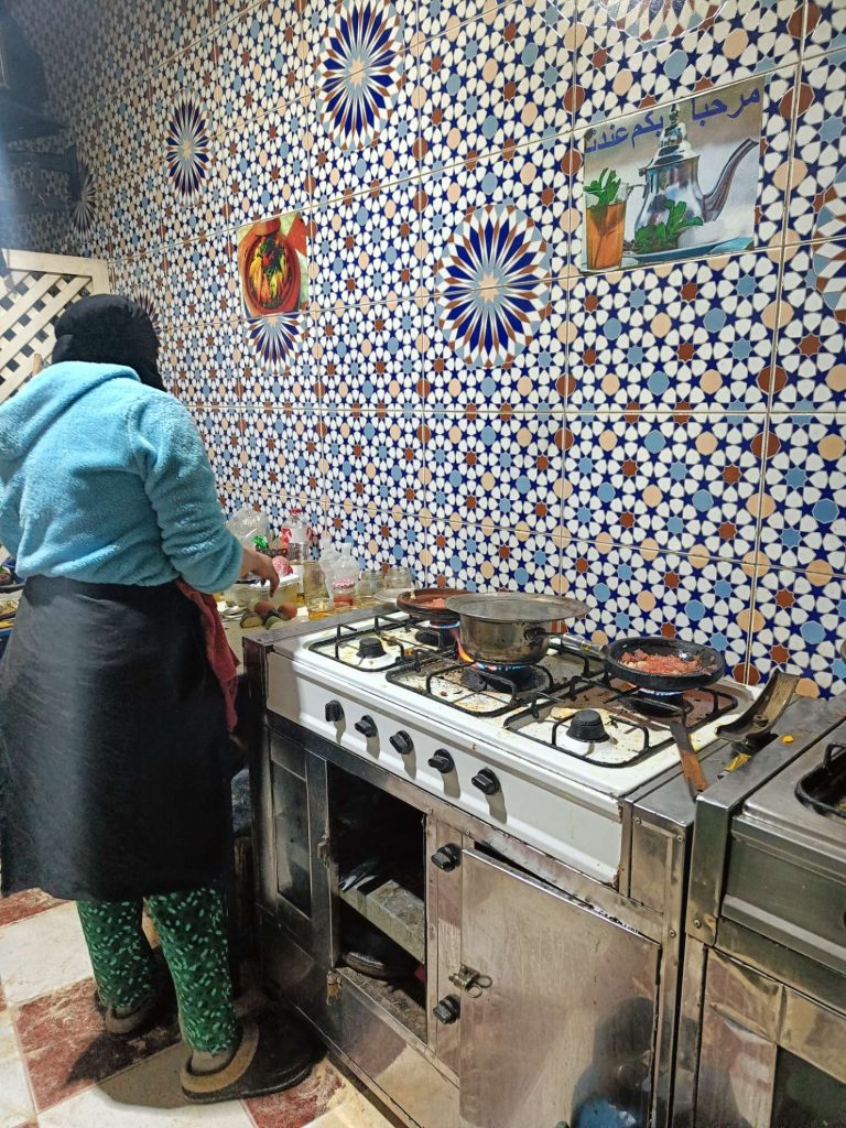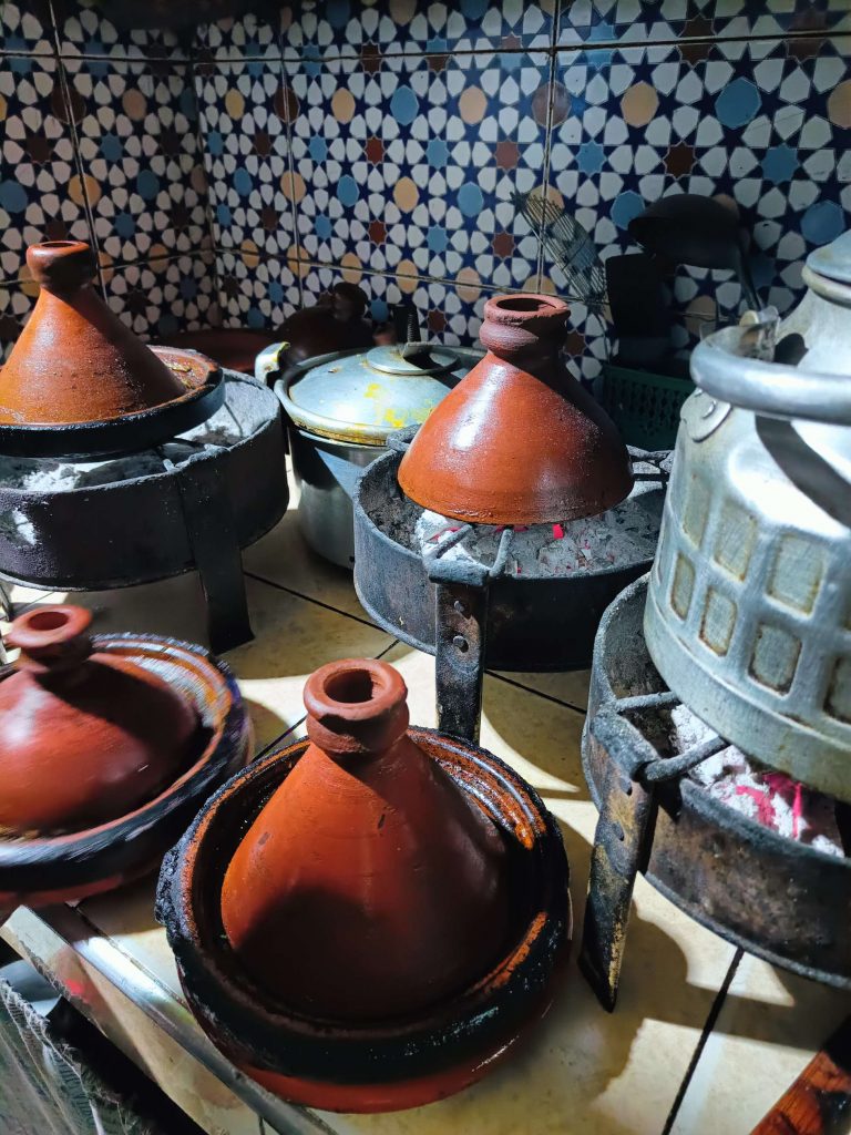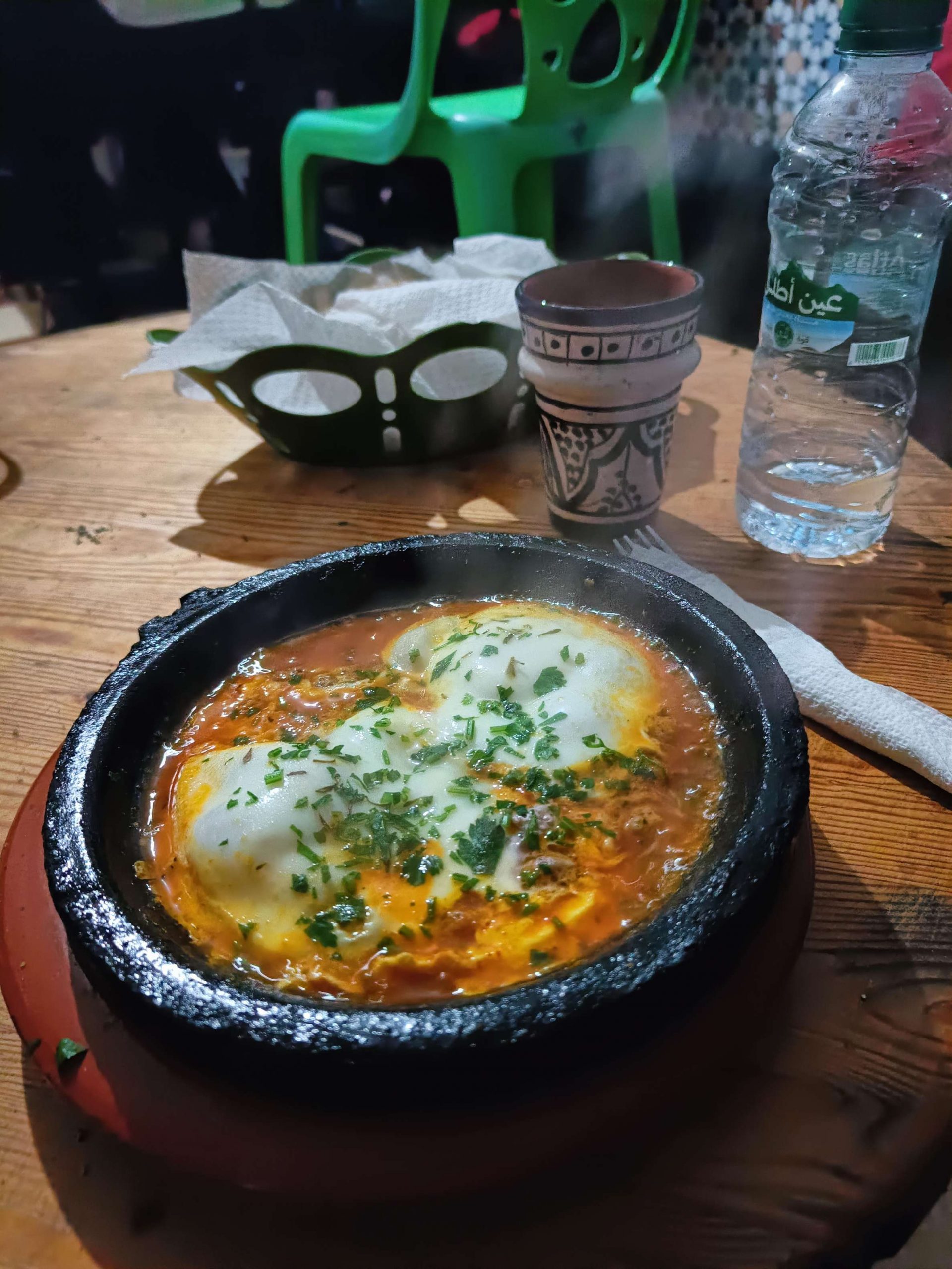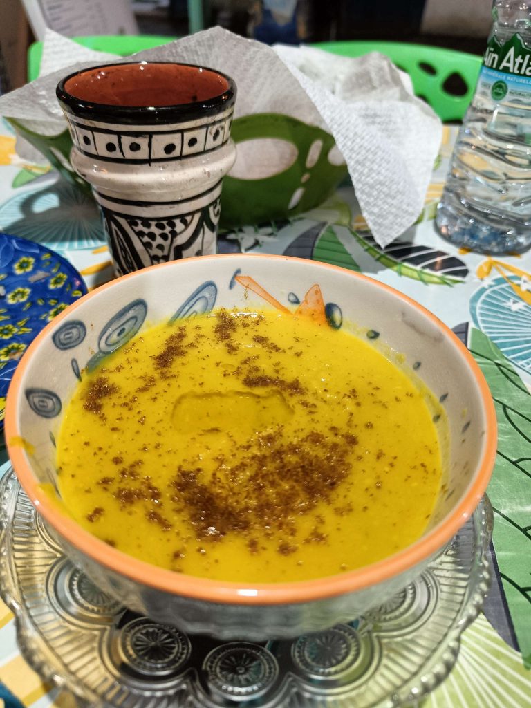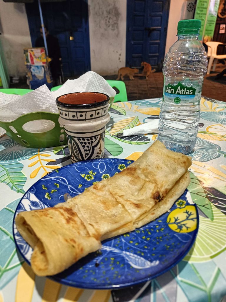J’avais très faim, alors une bissara, soupe de pois cassés, puis un msemem, le pain feuilleté tellement bon qu’on dirait un dessert… Et enfin un autre tagine kefta, j’adore tellement ça. Ce n’était pas à la carte mais dans ce resto, tout est possible. Tu demandes un truc et tu vois un marocain partir acheter ce qu’il faut chez le boucher… Ils sont 3, une femme qui cuisine avec un homme qui l’aide et un autre qui prend les commandes et fait le service. La cuisine st complètement visible et c’est vraiment avec très peu d’ustensiles. Les tagines cuisent sur de la braise. Tu as un peu d’attente pour être servi mais c’est vraiment compréhensible car c’est cuisiné devant toi…