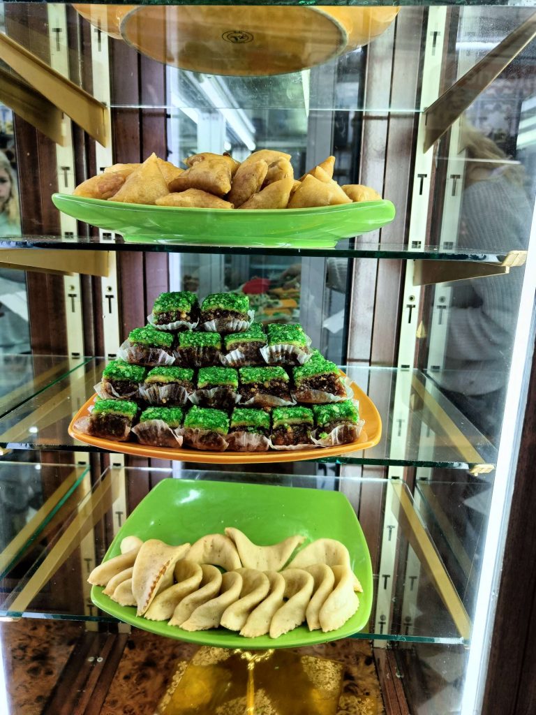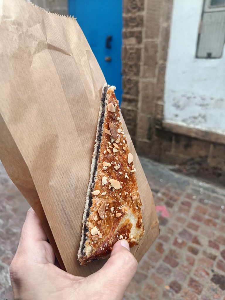 Quelques pâtisseries (une espèce de tarte frangipane au chocolat et une sorte de patate ou crotte de chien aux amandes) et un thé plus tard, nous sommes partis longer la grande plage d’Essaouira. Quelques surfeurs se sont lancés dans une eau très marron, limite bordeaux. Moi ça ne m’a pas du tout donné envie de me baigner ! Mais le soleil était chaud, quel bonheur de se balader en t-shirt alors que tout le monde m’envoyait des photos de neige en Bretagne. Je ne suis pas fâchée d’échapper à cette pagaille.