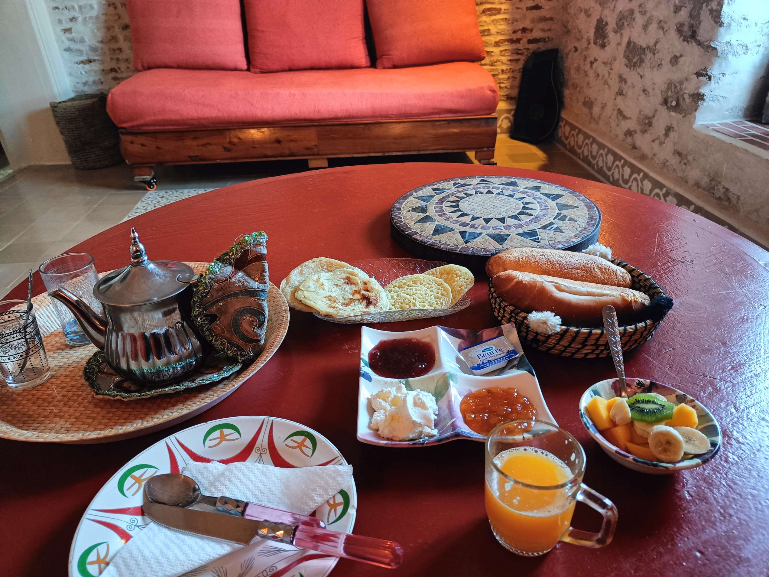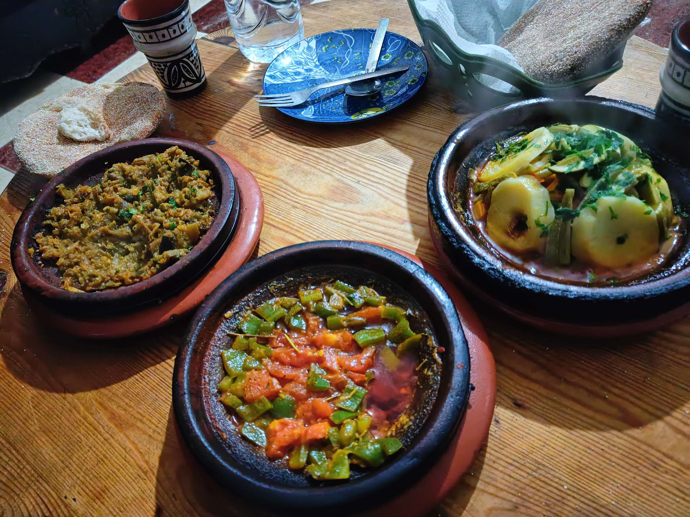 J’ai ensuite retrouvé Benoit pour le dîner (malgré le fait que j’étais huileuse comme une frite après le massage, pas eu le temps de me doucher). On a fait le plein de légumes avec du zaalouk (salade d’aubergines chaudes) et du taktouka (salade de poivrons tomates chaudes). Avec ça, j’ai complété avec un tagine au poulet, plein de légumes également. On devait manger du poisson mais les types avaient fermé boutique faute de clients. Par contre, gros coup de barre après dîner, deux journées avec 15 km à pieds d’affilée, ça fait un peu beaucoup !