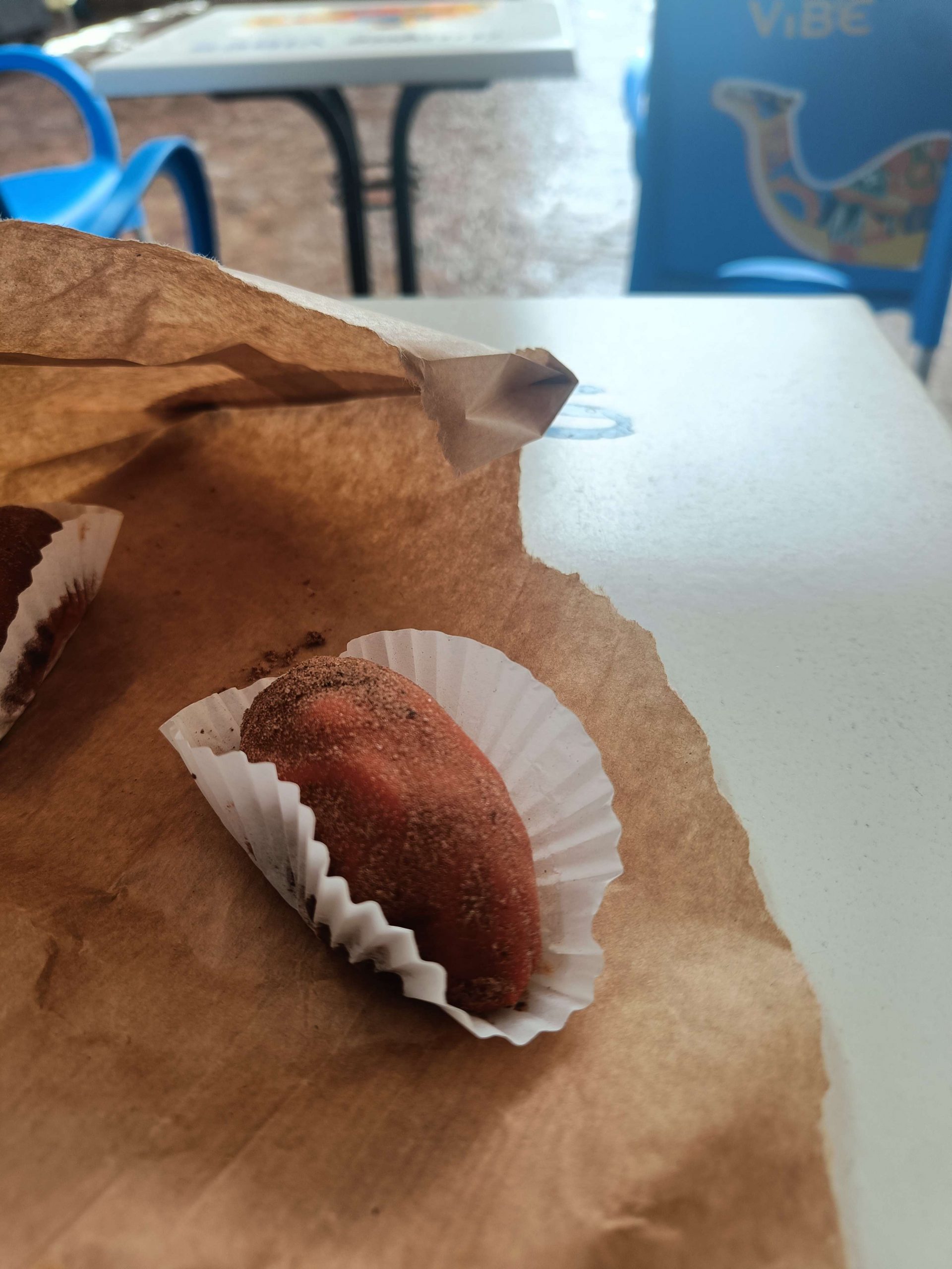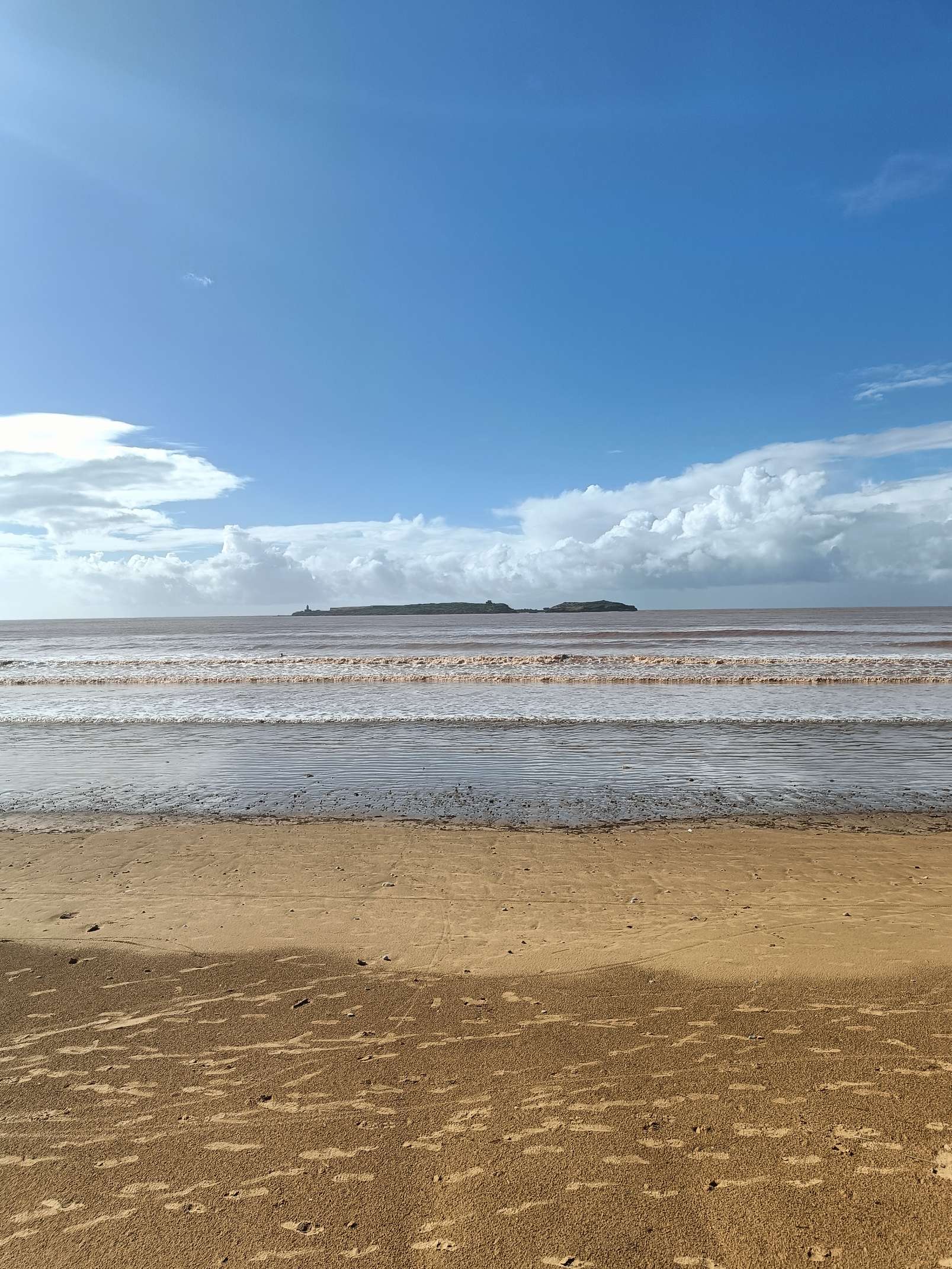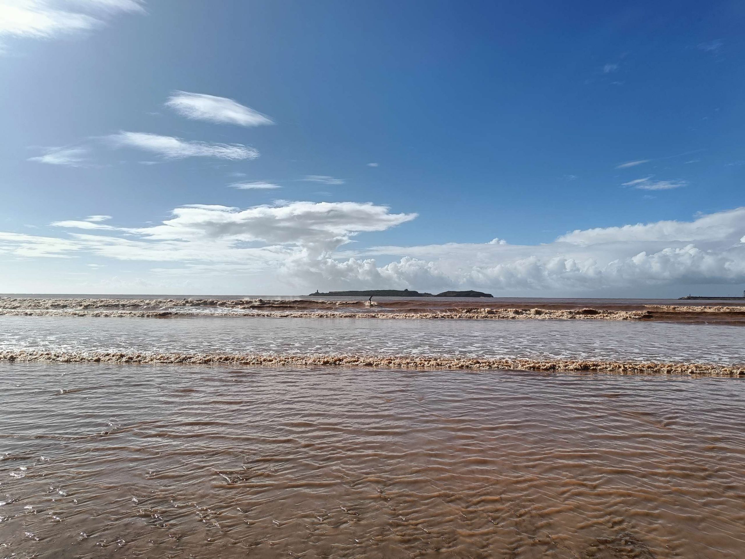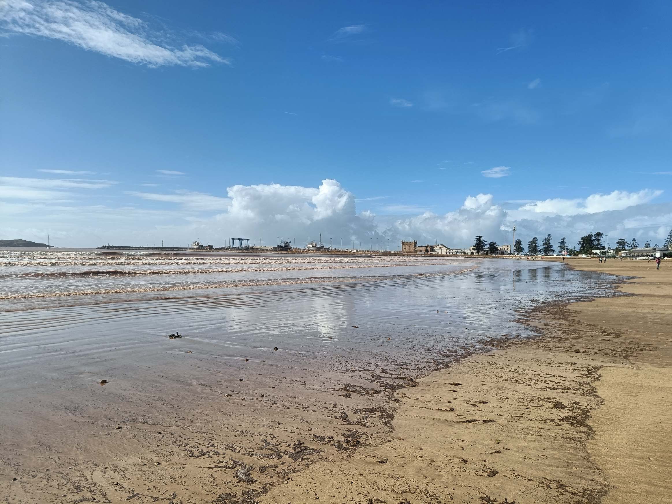 Quelques pâtisseries (une espèce de tarte frangipane au chocolat et une sorte de patate ou crotte de chien aux amandes) et un thé plus tard, nous sommes partis longer la grande plage d’Essaouira. Quelques surfeurs se sont lancés dans une eau très marron, limite bordeaux. Moi ça ne m’a pas du tout donné envie de me baigner ! Mais le soleil était chaud, quel bonheur de se balader en t-shirt alors que tout le monde m’envoyait des photos de neige en Bretagne. Je ne suis pas fâchée d’échapper à cette pagaille.
