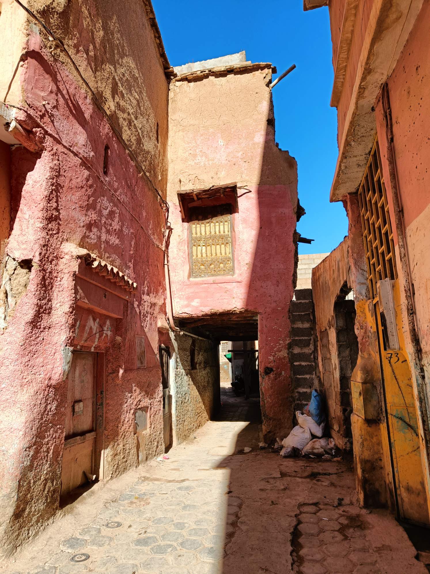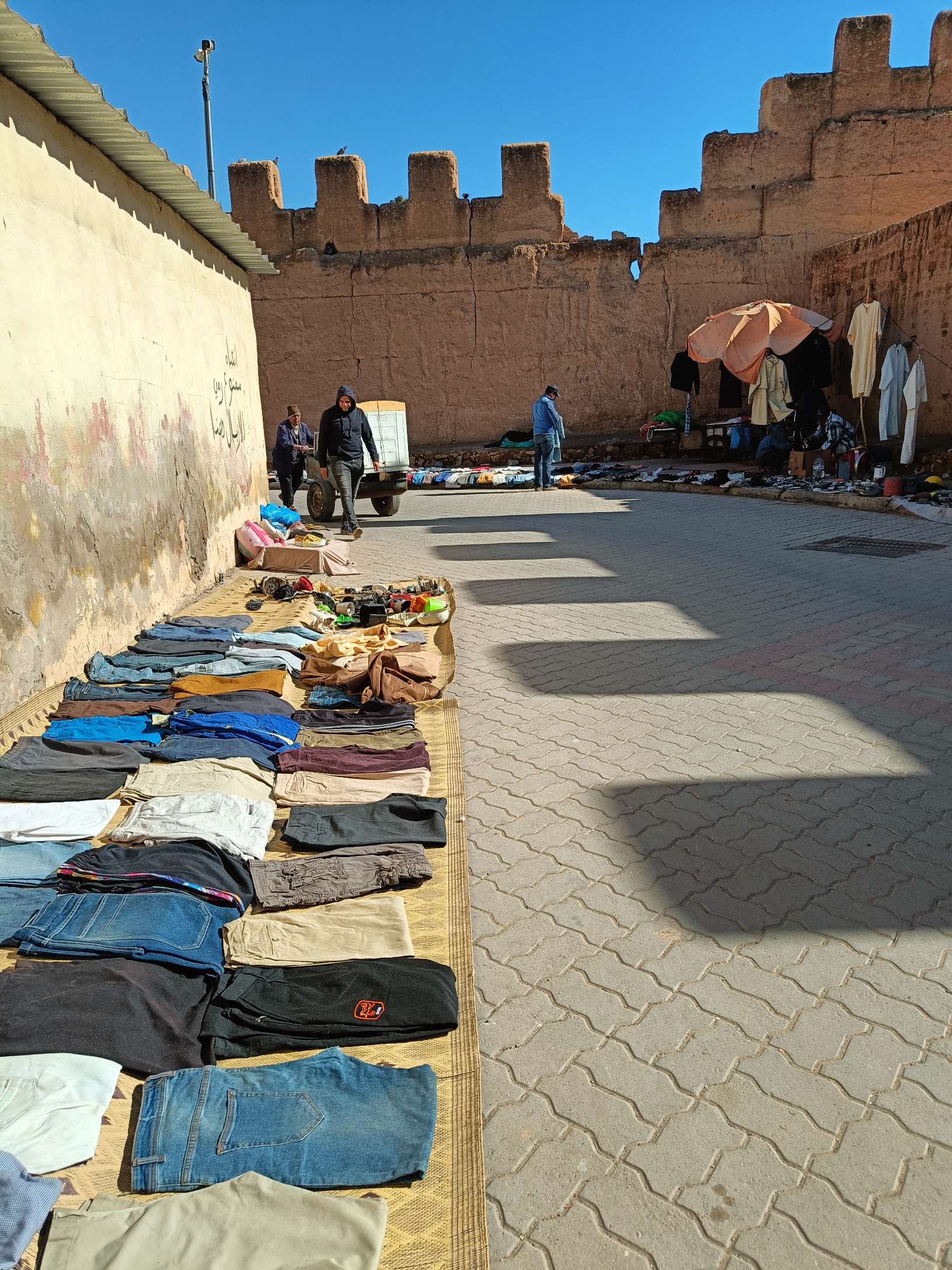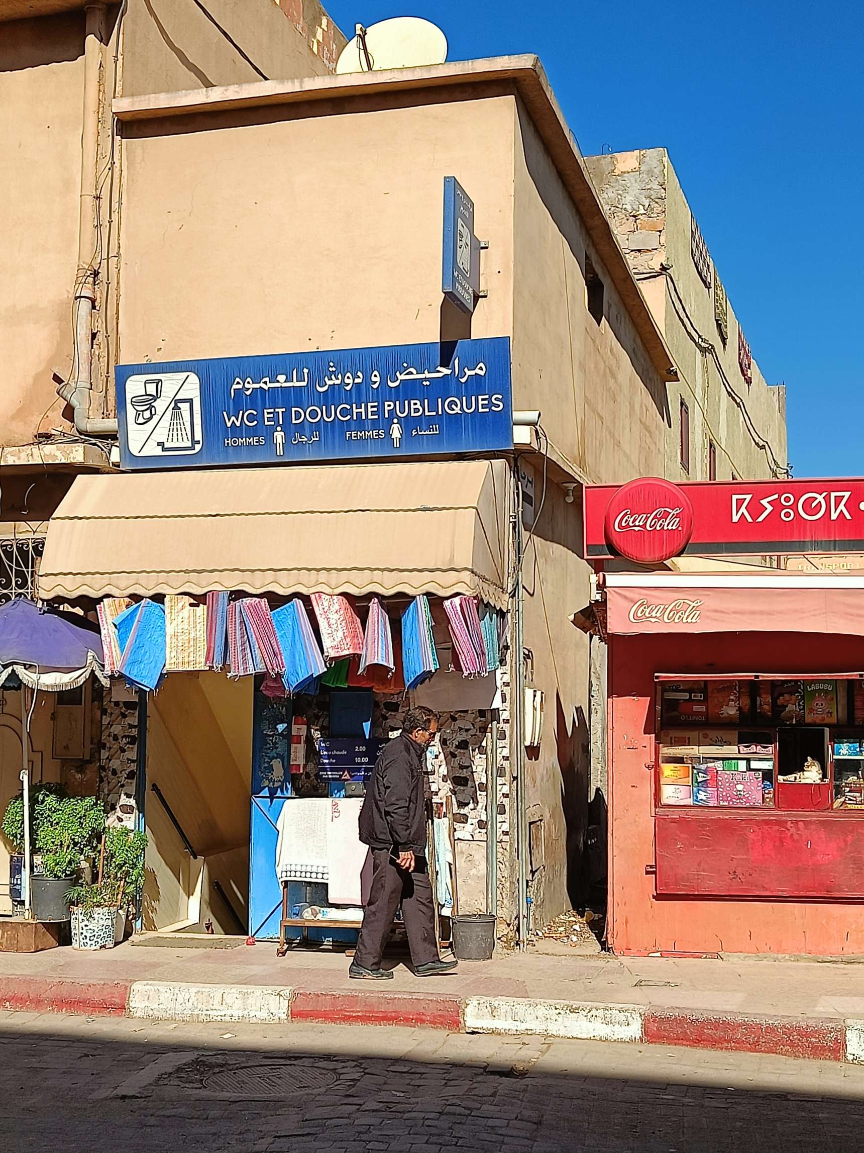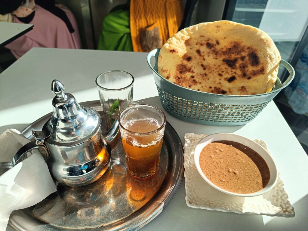 Ce matin, je prends mon temps. J’ai traîné jusqu’à 9h au lit, déjà pour mettre à jour le blog que je n’ai pas eu le courage de faire hier soir, ensuite, rien de spécial à la faire, à part prendre un petit déjeuner local. J’ai voulu aller place Assarag à un endroit que j’avais repéré hier mais pas de bol, sol affaissé devant la boutique, travaux en cours, sûrement électricité et eau coupées, les tables étaient rangées et ça me semblait pas près d’ouvrir. Je suis donc revenue sur mes pas à un endroit où j’avais repéré une dame qui petrissait des pains et les faisait cuire devant toi. La perspective de ce bon pain chaud m’a fait saliver, j’ai commandé un thé et de l’amlou et je me suis régalée. Je l’ai mangé en entier par gourmandise. 1.7€ le petit déjeuner de compétition. En même temps, j’avais pas mangé hier soir…