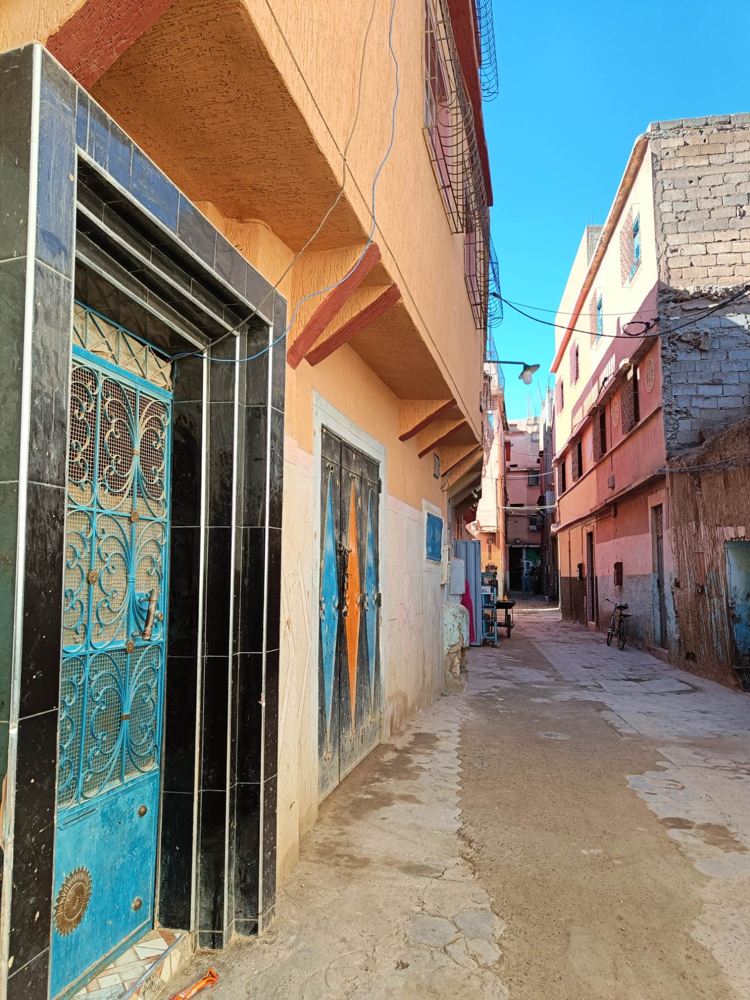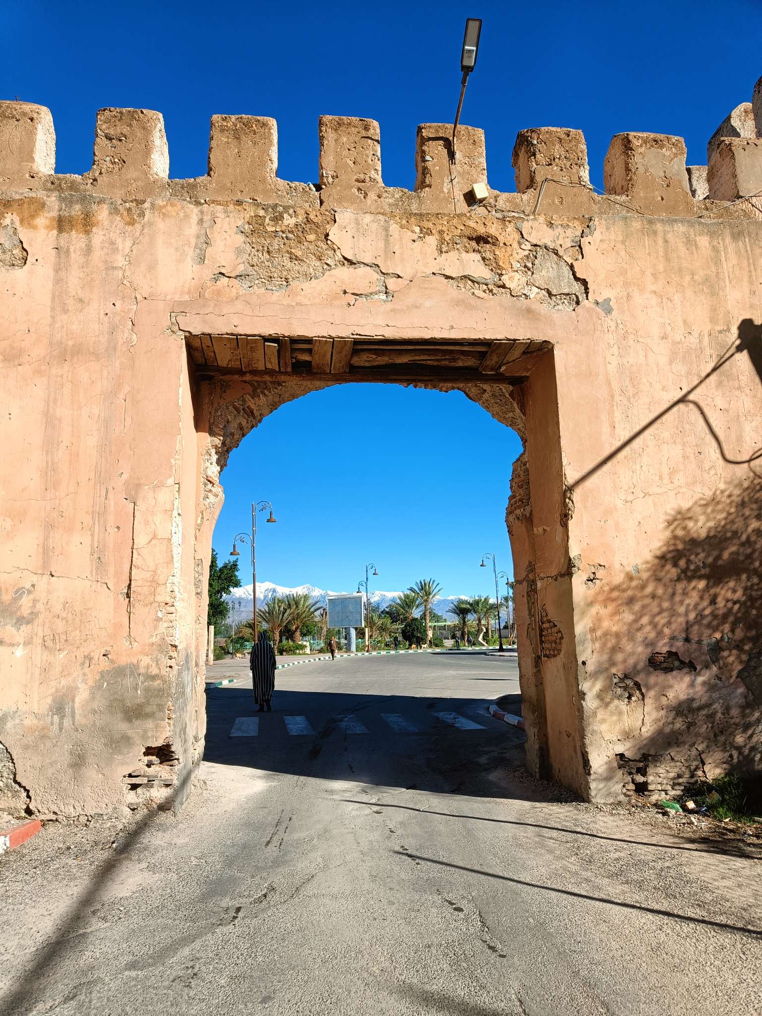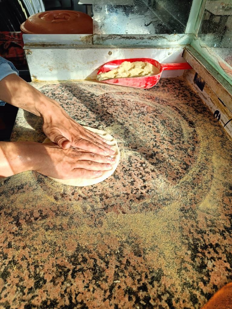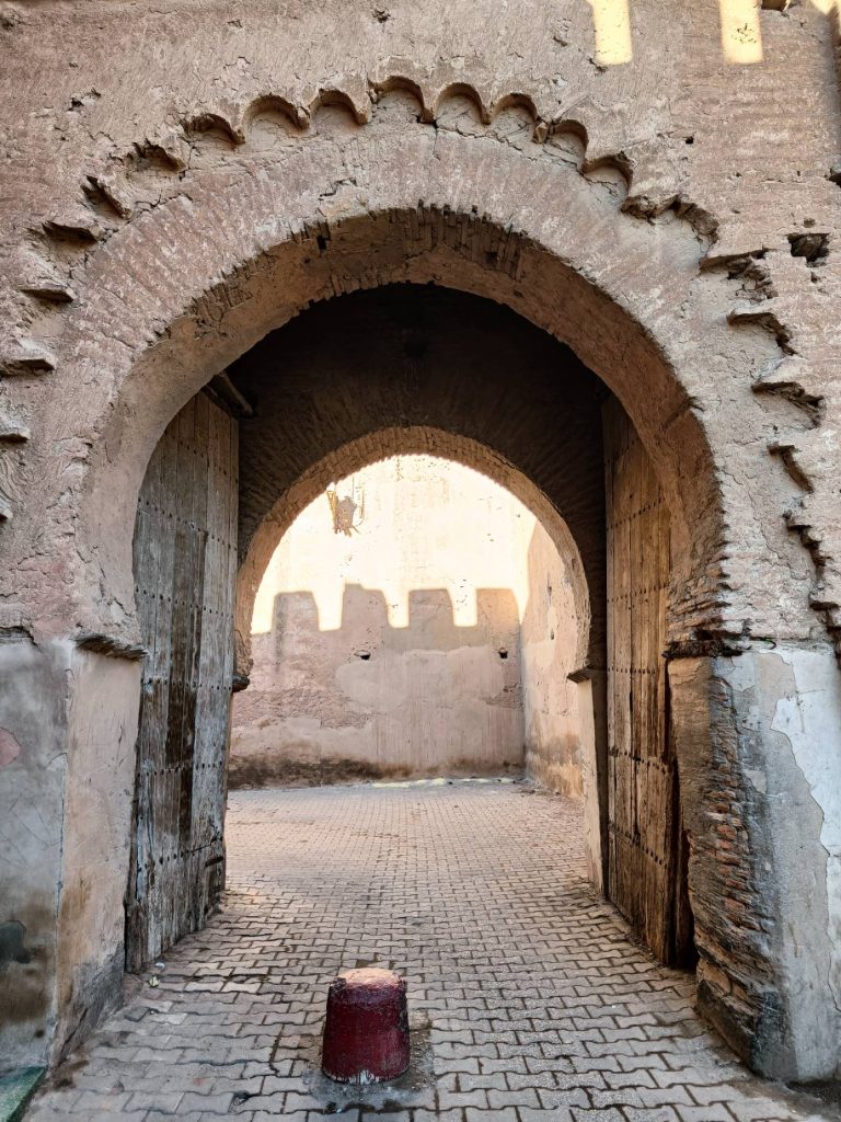 Ce matin, je prends mon temps. J’ai traîné jusqu’à 9h au lit, déjà pour mettre à jour le blog que je n’ai pas eu le courage de faire hier soir, ensuite, rien de spécial à la faire, à part prendre un petit déjeuner local. J’ai voulu aller place Assarag à un endroit que j’avais repéré hier mais pas de bol, sol affaissé devant la boutique, travaux en cours, sûrement électricité et eau coupées, les tables étaient rangées et ça me semblait pas près d’ouvrir. Je suis donc revenue sur mes pas à un endroit où j’avais repéré une dame qui petrissait des pains et les faisait cuire devant toi. La perspective de ce bon pain chaud m’a fait saliver, j’ai commandé un thé et de l’amlou et je me suis régalée. Je l’ai mangé en entier par gourmandise. 1.7€ le petit déjeuner de compétition. En même temps, j’avais pas mangé hier soir…