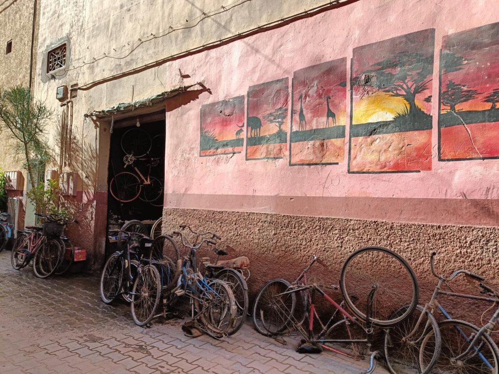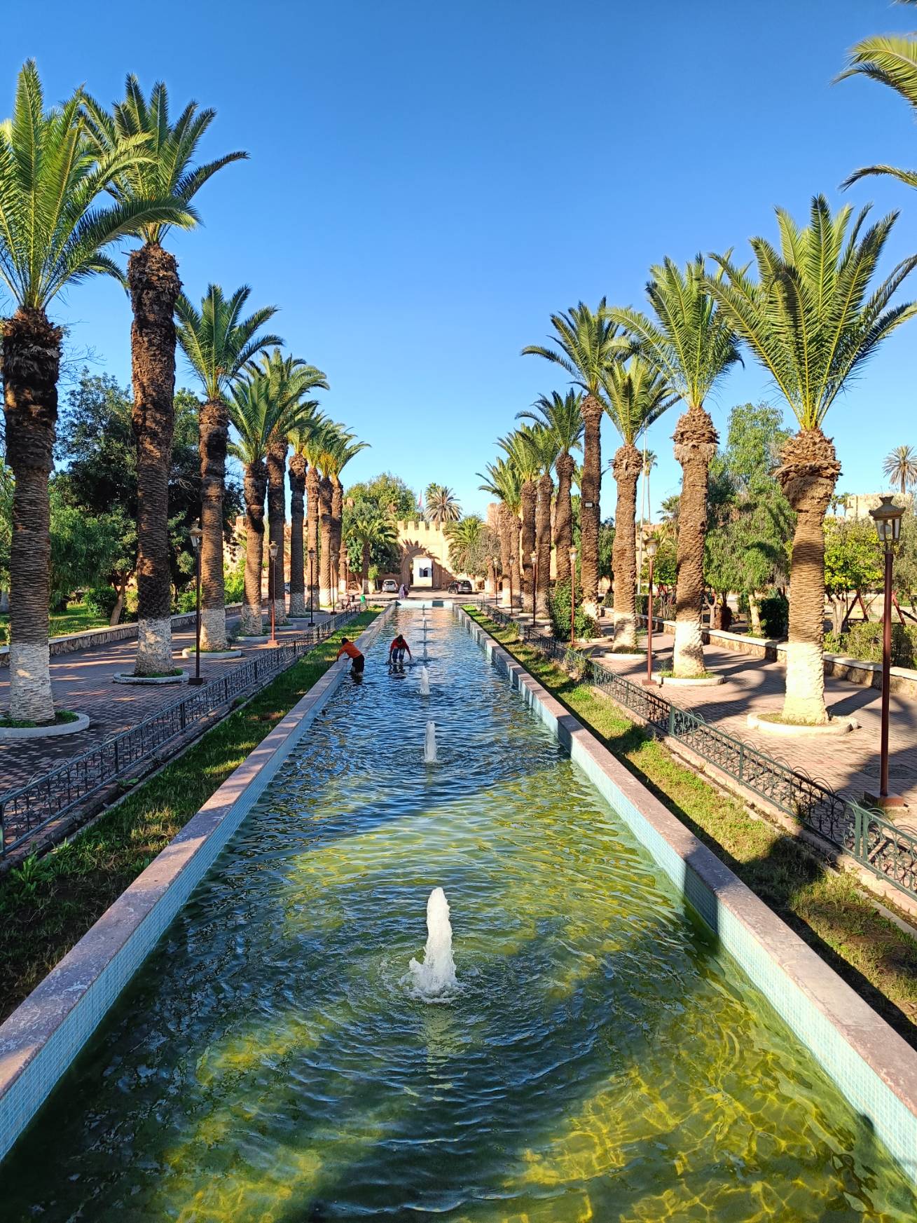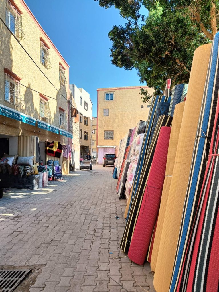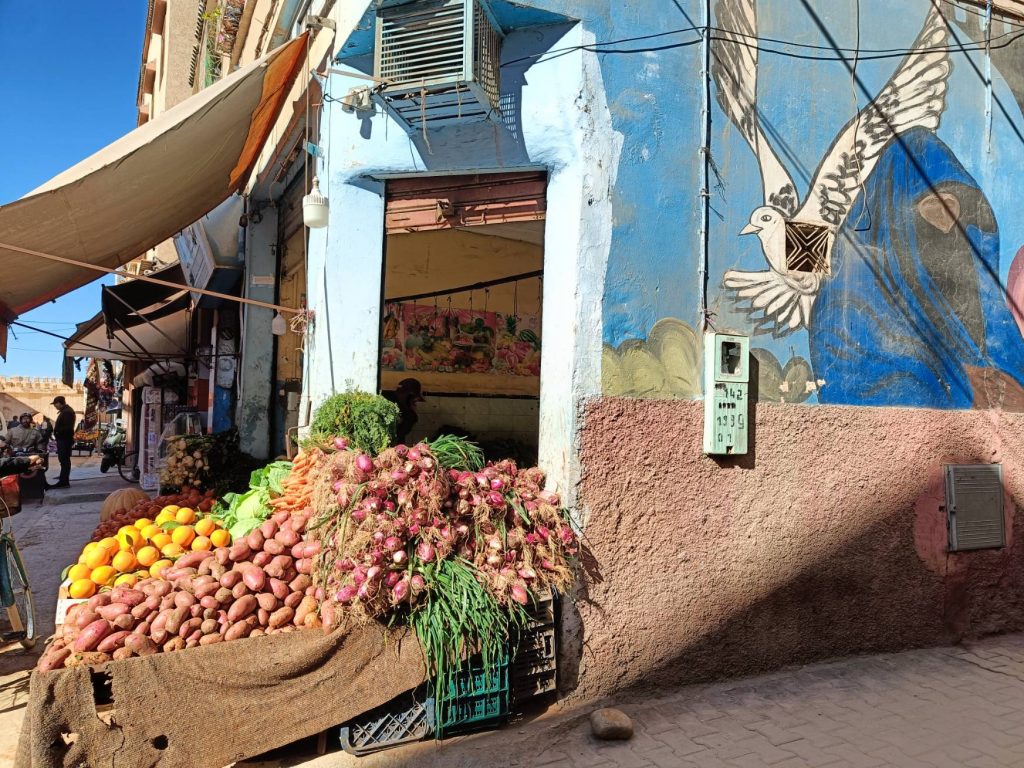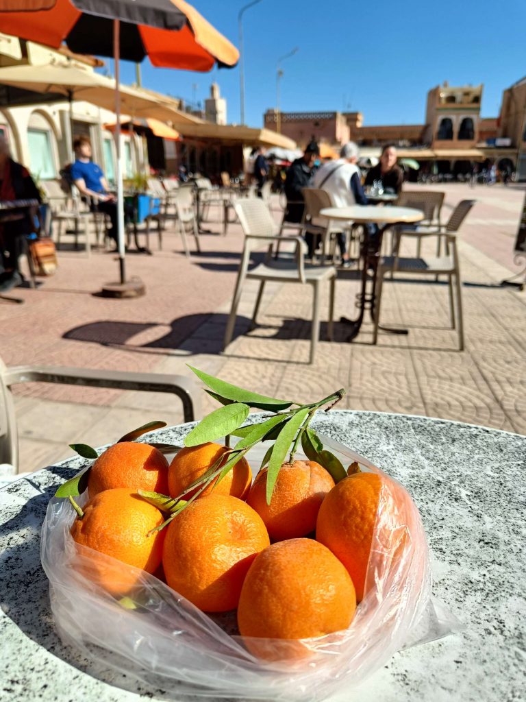 Ensuite je suis partie voir de près les fontaines aperçues de loin en calèche hier. Il n’y a que la dernière où je n’ai pas pu aller car j’ai vu une meute de chiens un peu agités, et j’ai préféré faire demi tour. Tant pis pour la photo et tant mieux pour mes mollets !Pas mal de tourisme de groupe avec des guides en djellabas qui parlent en allemand, des français aussi en individuel, en famille avec de jeunes enfants. On m’a demandé si j’étais en caravane, effectivement, je vois pas mal de retraités en vélo, sûrement avec un camping car garé en périphérie. Ils font leurs courses, fruits, légumes, viande, c’est vrai que tout fait envie, et semble très frais. Les poulets sont encore vivants dans la boutique, sûrement tués à la demande. Je me suis repris encore des clémentines, hier soir je me suis faite avoir mais je m’en doutais que 30c d euros pour 4 clementines, c’était excessif mais qu’est ce que tu veux râler …. Aujourd’hui j’en ai eu 7 (500g) pour 20 centimes. Et qu’est-ce qu’elles sont bonnes, sucrées et juteuses. Après ça, un petit thé à la menthe en terrasse au soleil où ça cogne, avant de récupérer mon sac et de partir pour la gare routière prendre un taxi collectif. La fille de l’accueil m’avait dit que 15h était la meilleure heure pour Agadir mais à 13h50, le dacia lodgy s’est rempli en 5 mn. Trop bien, je vais pouvoir profiter du coucher de soleil à Agadir.
