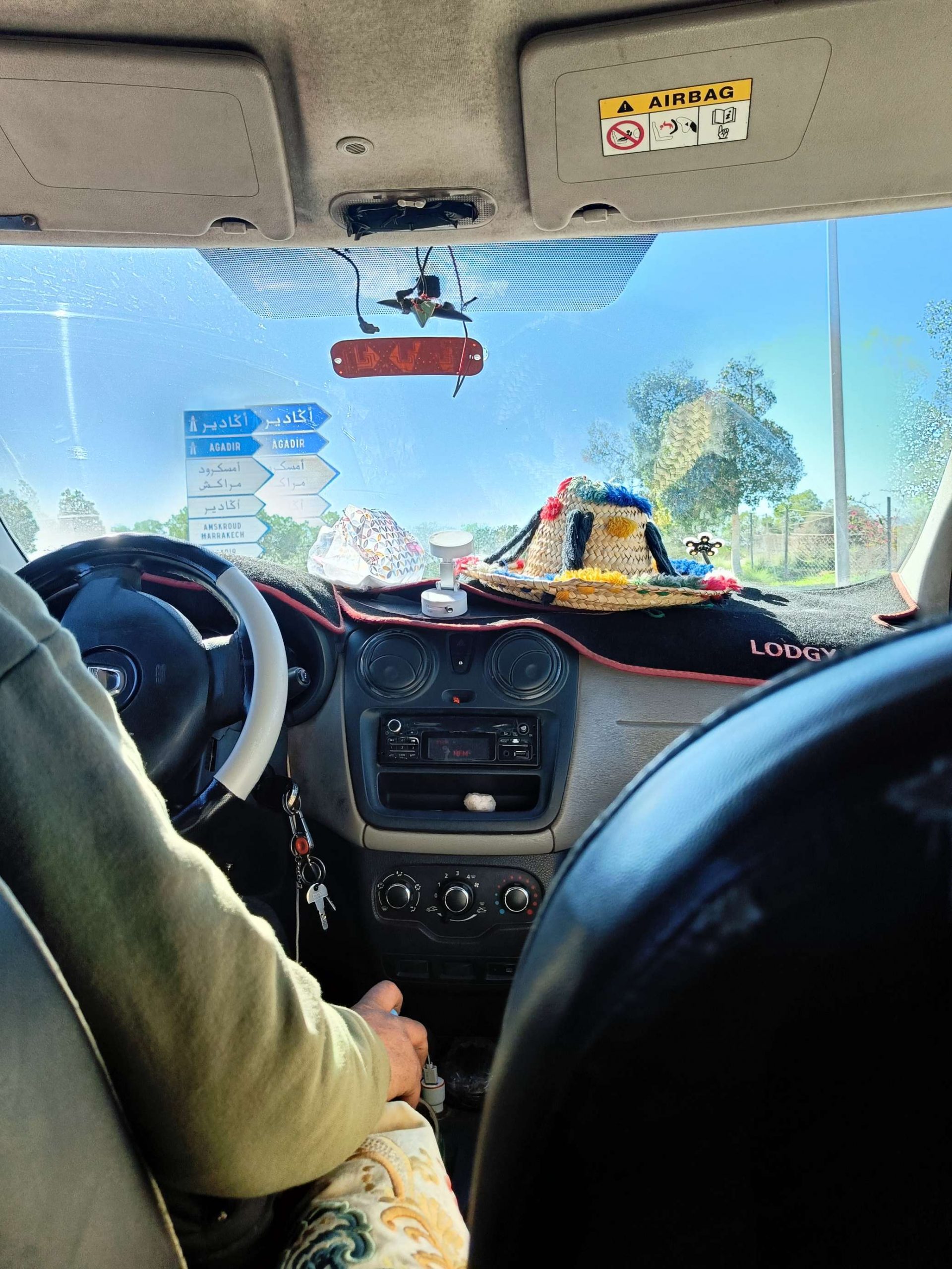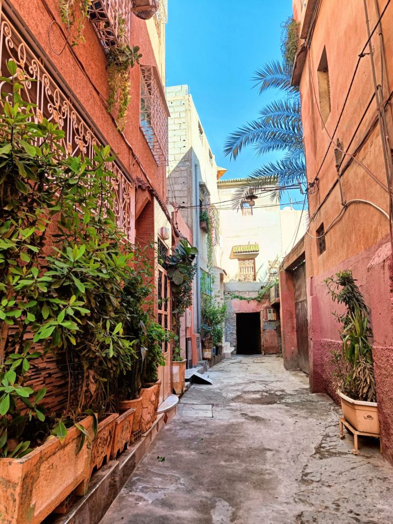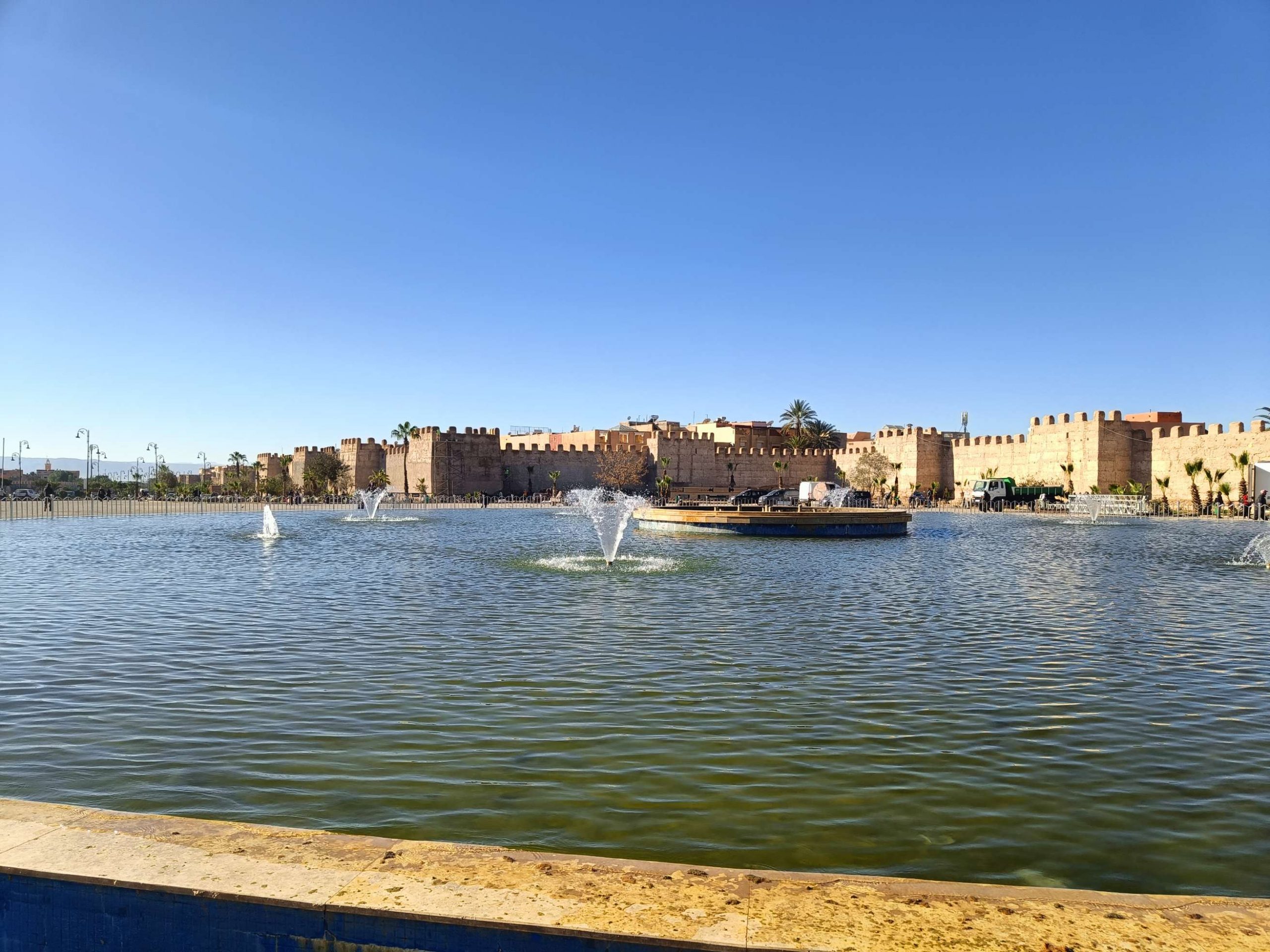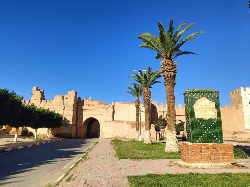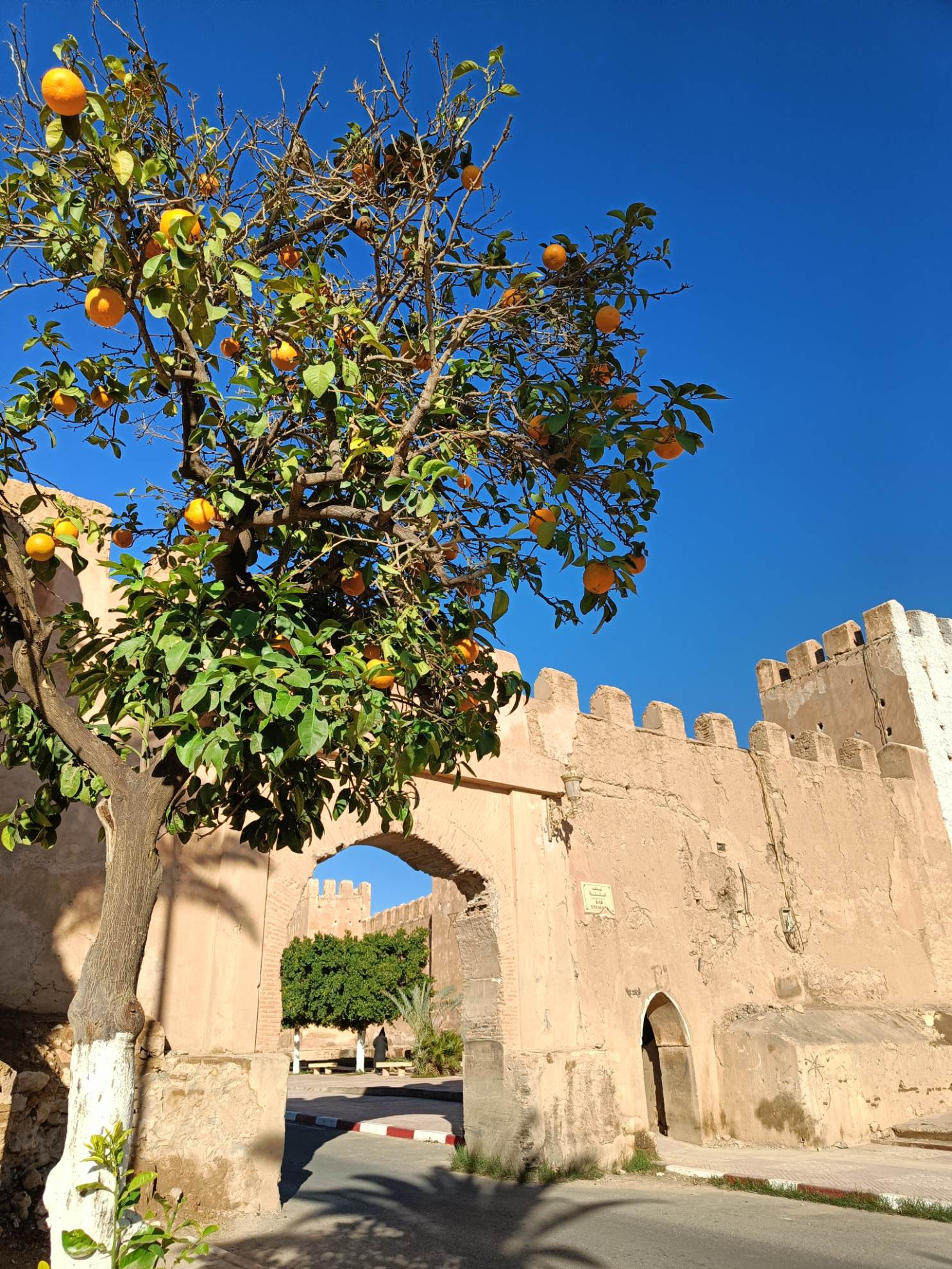 Ensuite je suis partie voir de près les fontaines aperçues de loin en calèche hier. Il n’y a que la dernière où je n’ai pas pu aller car j’ai vu une meute de chiens un peu agités, et j’ai préféré faire demi tour. Tant pis pour la photo et tant mieux pour mes mollets !Pas mal de tourisme de groupe avec des guides en djellabas qui parlent en allemand, des français aussi en individuel, en famille avec de jeunes enfants. On m’a demandé si j’étais en caravane, effectivement, je vois pas mal de retraités en vélo, sûrement avec un camping car garé en périphérie. Ils font leurs courses, fruits, légumes, viande, c’est vrai que tout fait envie, et semble très frais. Les poulets sont encore vivants dans la boutique, sûrement tués à la demande. Je me suis repris encore des clémentines, hier soir je me suis faite avoir mais je m’en doutais que 30c d euros pour 4 clementines, c’était excessif mais qu’est ce que tu veux râler …. Aujourd’hui j’en ai eu 7 (500g) pour 20 centimes. Et qu’est-ce qu’elles sont bonnes, sucrées et juteuses. Après ça, un petit thé à la menthe en terrasse au soleil où ça cogne, avant de récupérer mon sac et de partir pour la gare routière prendre un taxi collectif. La fille de l’accueil m’avait dit que 15h était la meilleure heure pour Agadir mais à 13h50, le dacia lodgy s’est rempli en 5 mn. Trop bien, je vais pouvoir profiter du coucher de soleil à Agadir.