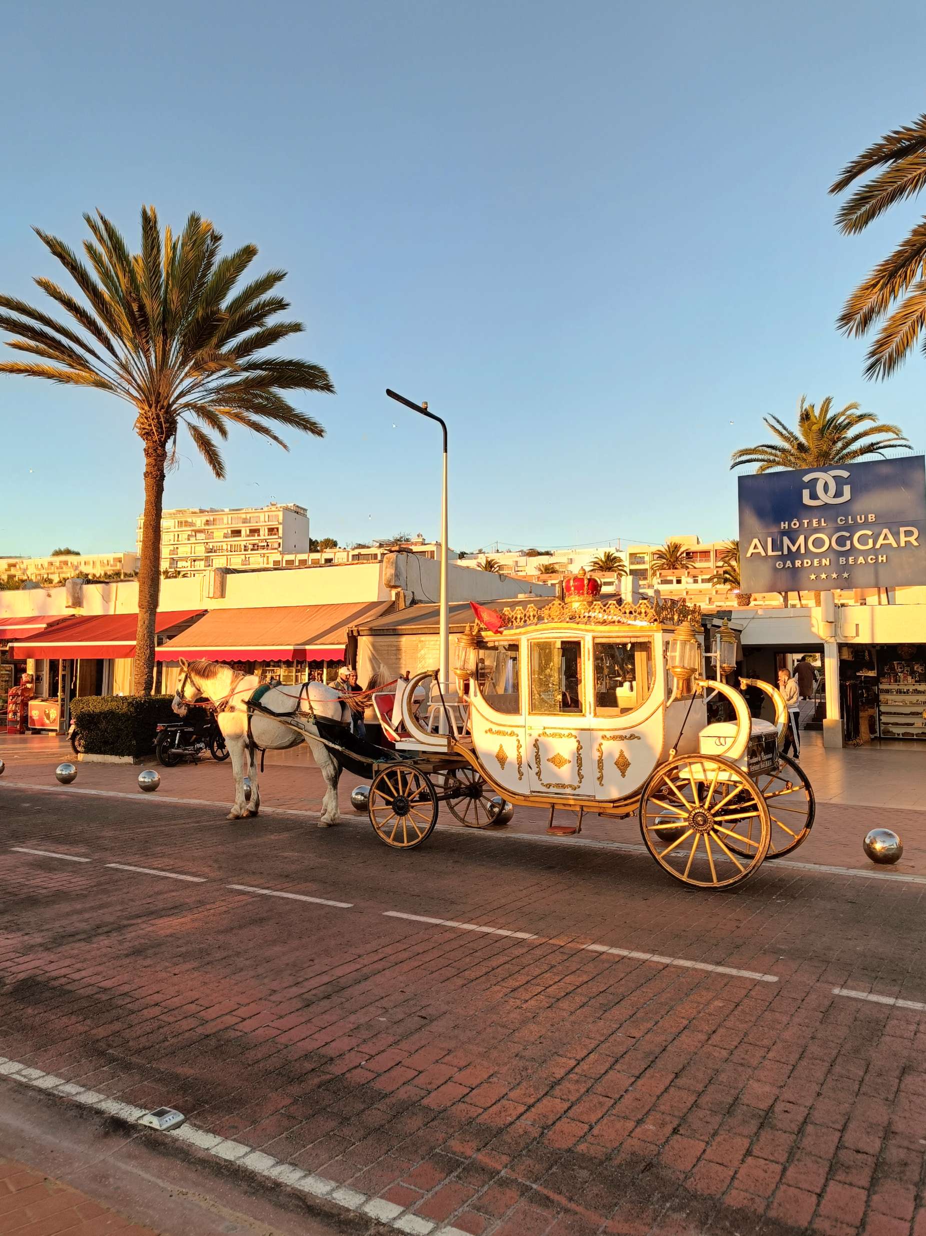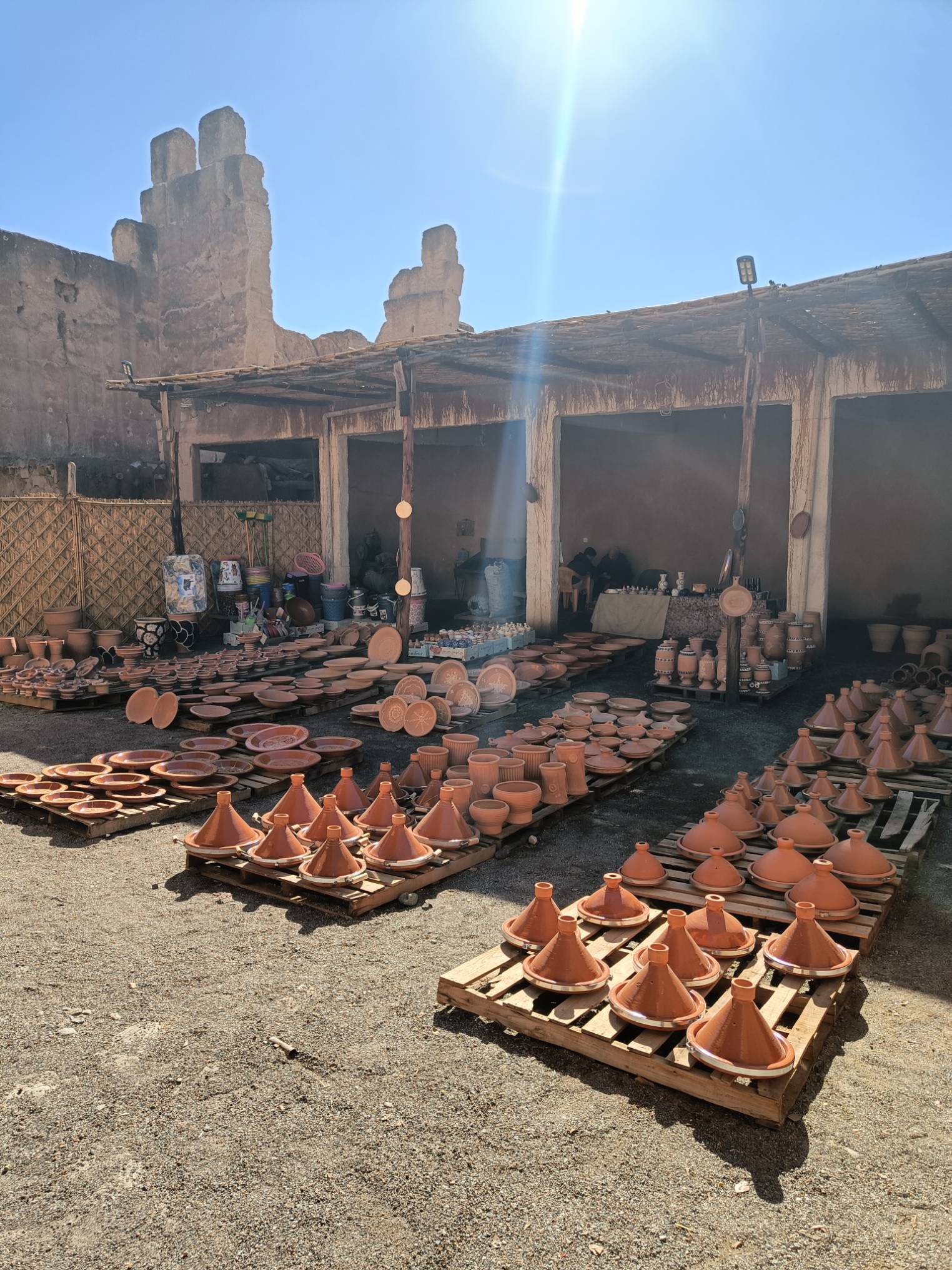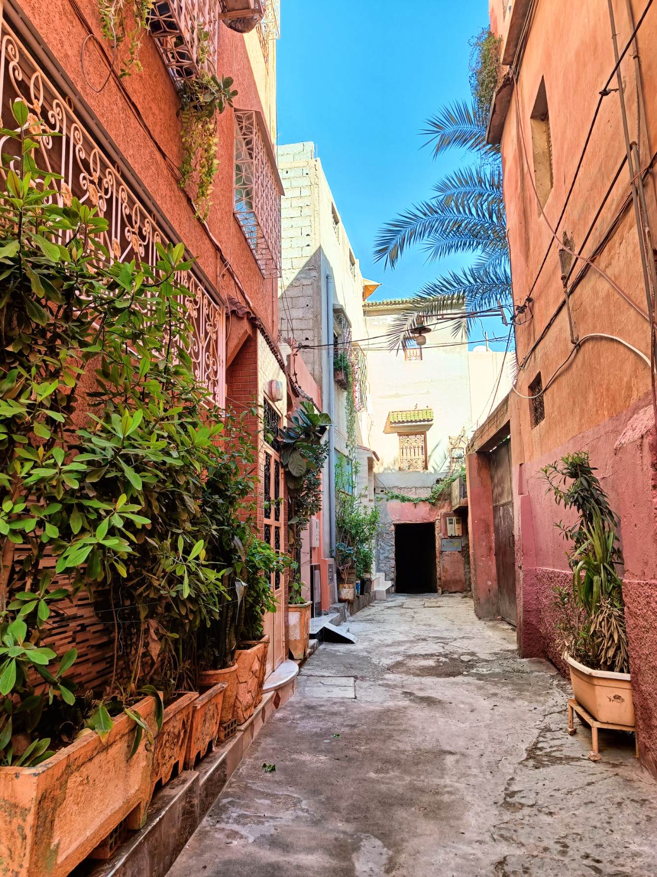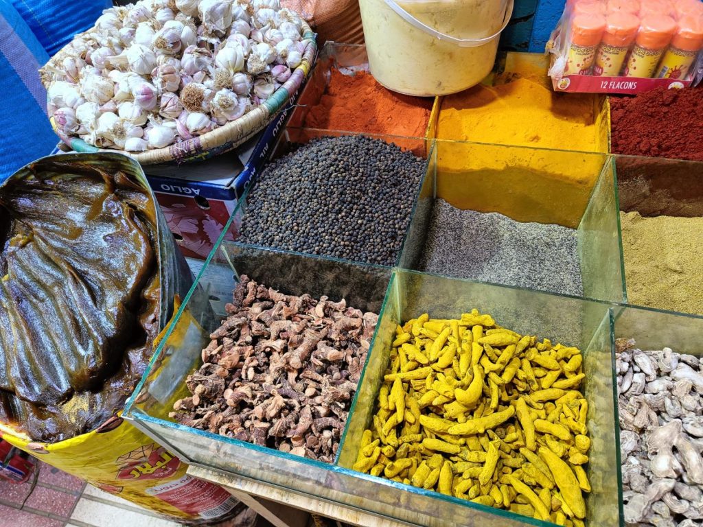 Ensuite je suis partie voir de près les fontaines aperçues de loin en calèche hier. Il n’y a que la dernière où je n’ai pas pu aller car j’ai vu une meute de chiens un peu agités, et j’ai préféré faire demi tour. Tant pis pour la photo et tant mieux pour mes mollets !Pas mal de tourisme de groupe avec des guides en djellabas qui parlent en allemand, des français aussi en individuel, en famille avec de jeunes enfants. On m’a demandé si j’étais en caravane, effectivement, je vois pas mal de retraités en vélo, sûrement avec un camping car garé en périphérie. Ils font leurs courses, fruits, légumes, viande, c’est vrai que tout fait envie, et semble très frais. Les poulets sont encore vivants dans la boutique, sûrement tués à la demande. Je me suis repris encore des clémentines, hier soir je me suis faite avoir mais je m’en doutais que 30c d euros pour 4 clementines, c’était excessif mais qu’est ce que tu veux râler …. Aujourd’hui j’en ai eu 7 (500g) pour 20 centimes. Et qu’est-ce qu’elles sont bonnes, sucrées et juteuses. Après ça, un petit thé à la menthe en terrasse au soleil où ça cogne, avant de récupérer mon sac et de partir pour la gare routière prendre un taxi collectif. La fille de l’accueil m’avait dit que 15h était la meilleure heure pour Agadir mais à 13h50, le dacia lodgy s’est rempli en 5 mn. Trop bien, je vais pouvoir profiter du coucher de soleil à Agadir.