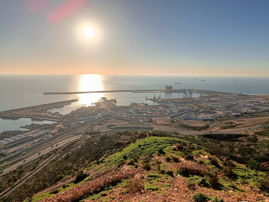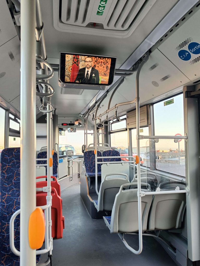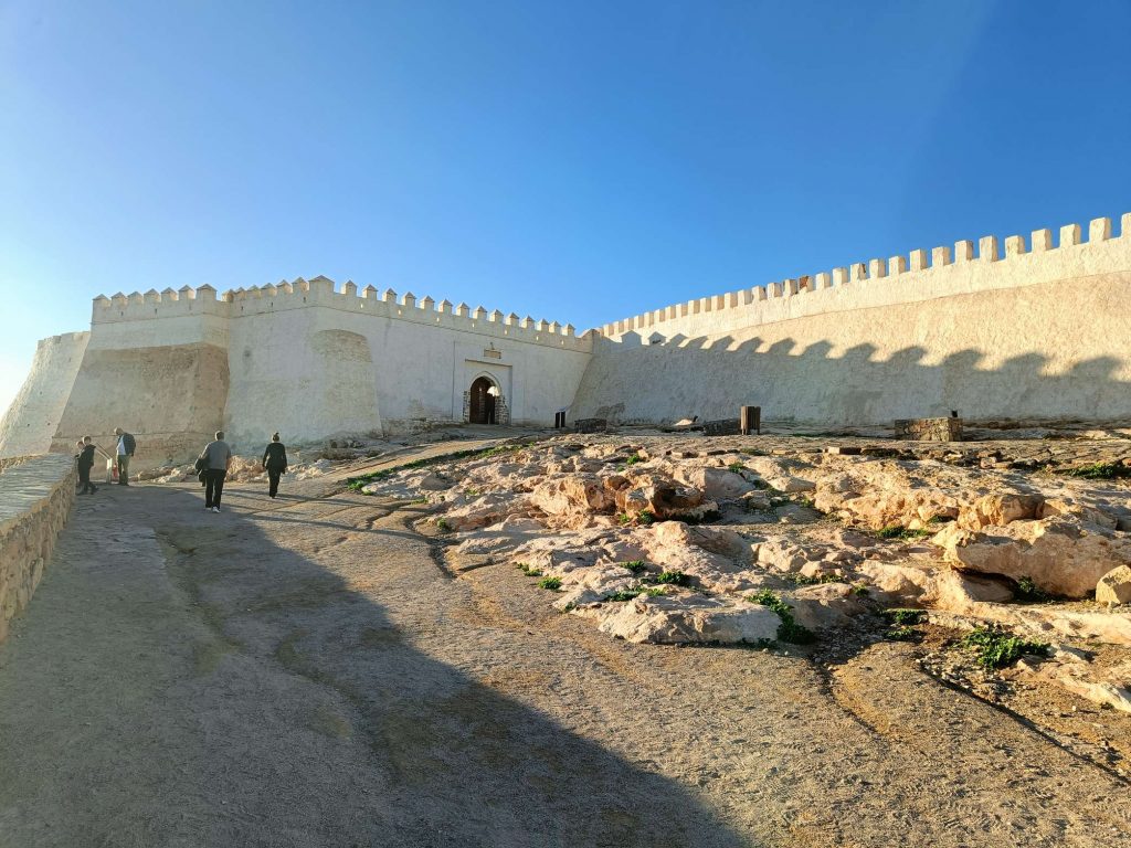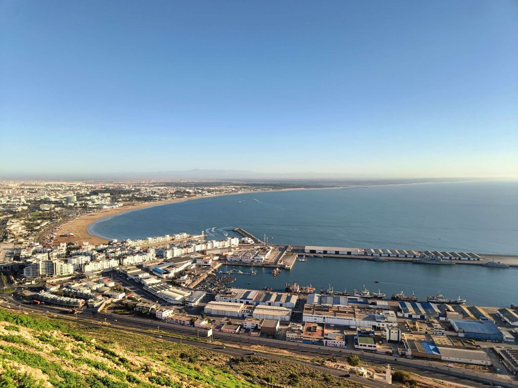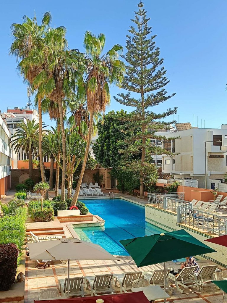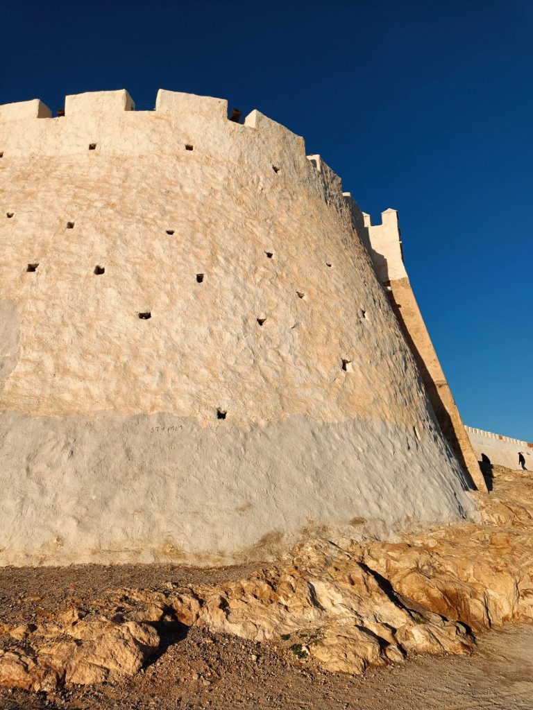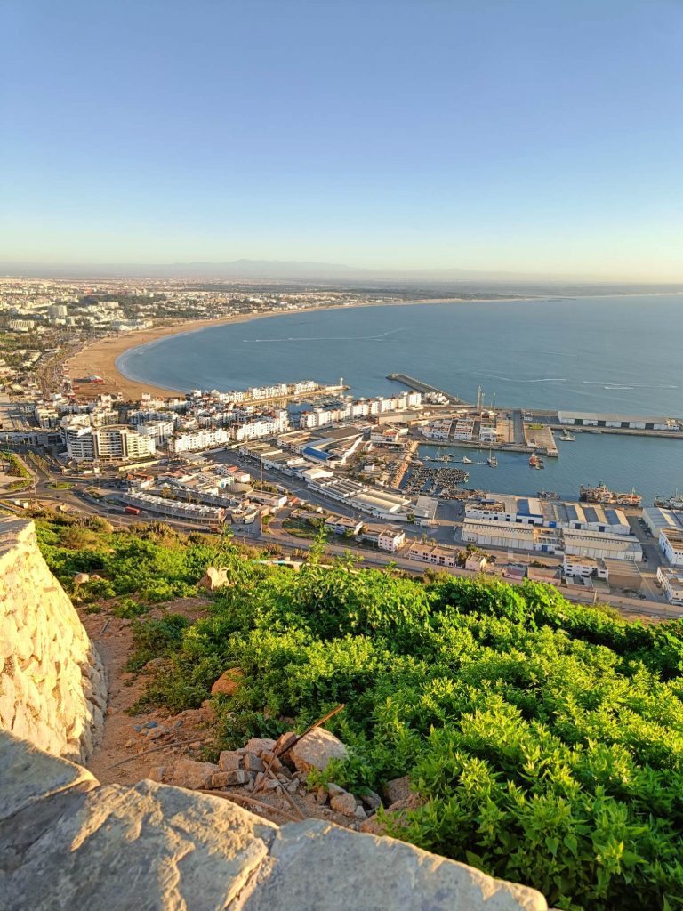 Trajet rapide, plus prudent qu’à l’aller, à la radio, on a même eu des spots de pub marocains sur la politesse, comme quoi dire bonjour à un touriste, c’est renvoyer une bonne image du Maroc. D’ailleurs tout le long du séjour, on m’a dit : bonjour, bienvenue au Maroc avec le sourire. C’était un accueil très agréable. A l’arrivée au parking Abbatoir, j’ai encore marché une vingtaine de minutes pour arriver à mon dernier hôtel, avec piscine, plus touristique que les précédents mais un peu dans son jus au niveau des chambres. Je suis repartie marcher sur la corniche, à la base je voulais juste manger une glace et voir le coucher du soleil mais je suis rentrée à l’Office du Tourisme, où j’ai dérangé les agentes d’accueil qui discutaient entre elles. Vraiment pas au top les nanas. J’ai demandé s’il y avait un bus pour aller à la Kasbah, visiblement non, mais finalement oui ‘au pied de la montagne’, elle m’a annoncé 15mn à pieds, alors que c’était plus 30 mn en marchant vite ! Une fois arrivée ‘au pied de la montagne’, le bus ne semblait pas vouloir partir alors j’ai demandé à un taxi combien il me prenait pour aller en haut. 20 dirhams, j’ai un peu tiqué, il m’a dit 15, si on peut emmener la grand mère qui attend avec tous ces sacs. Tope là.
