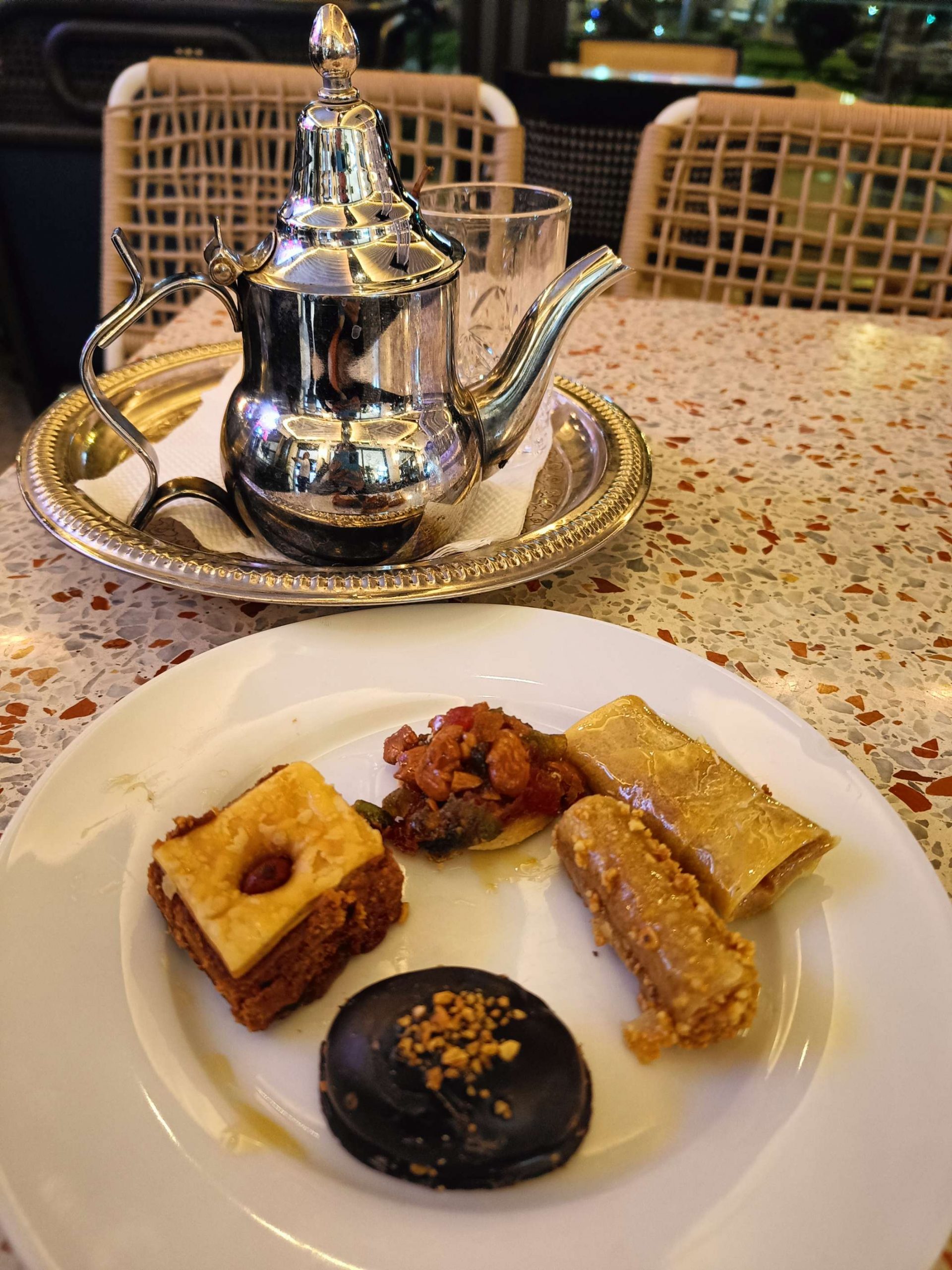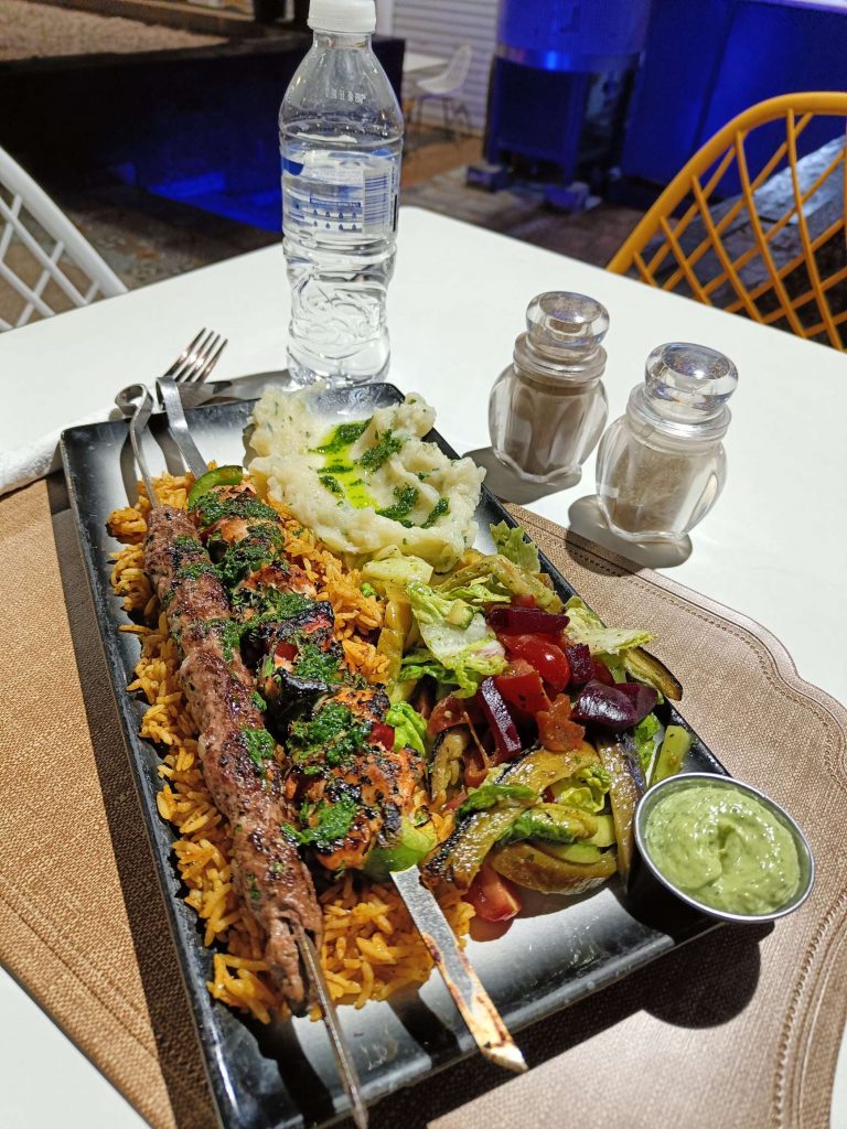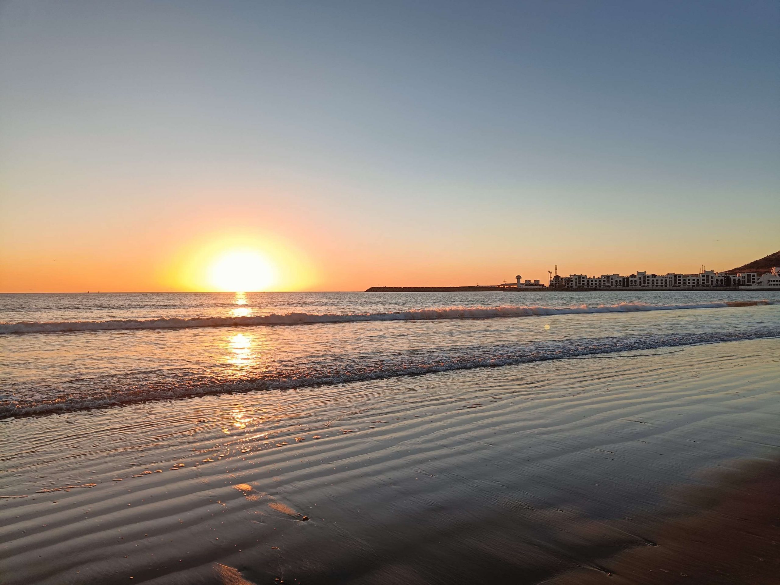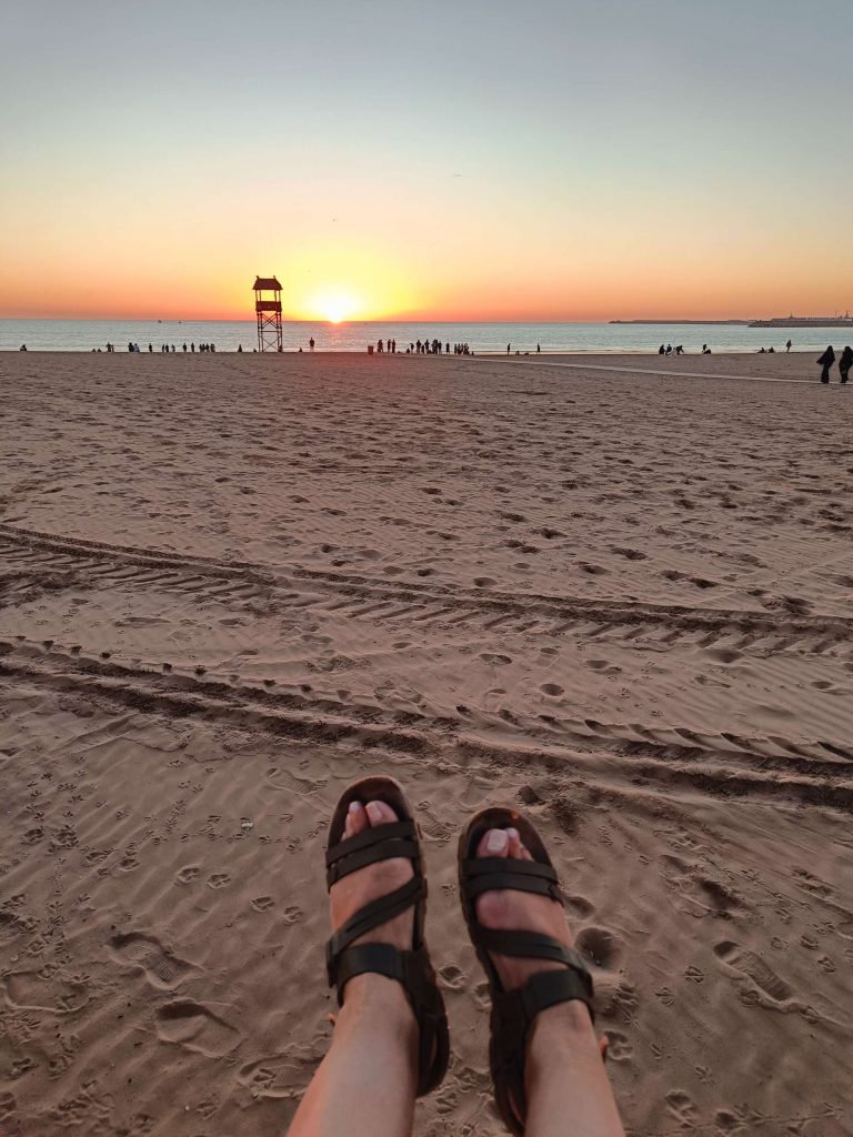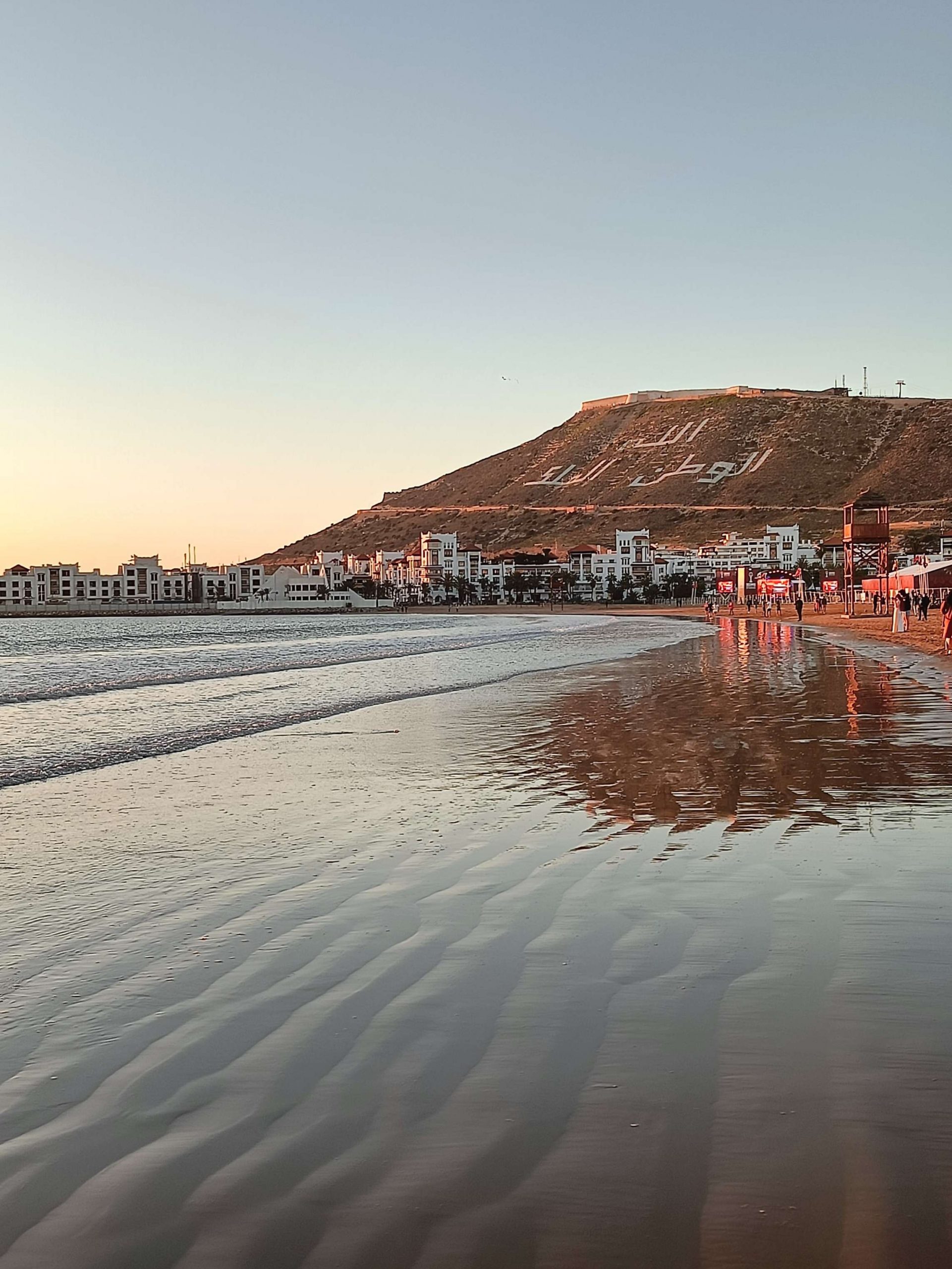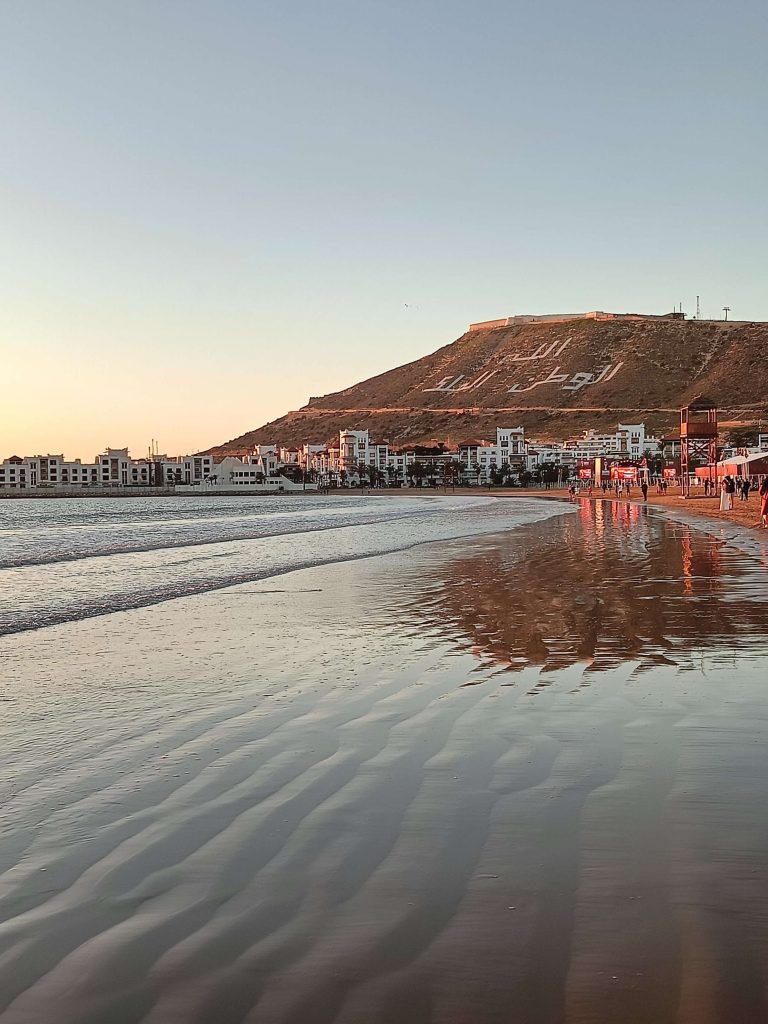 Au début, je comptais visiter la Kasbah et finalement, j’ai laissé tomber, j’ai juste fait le tour des remparts et la vue est vraiment splendide sur Agadir. Au retour, j’ai pu prendre le bus, j’ai été étonnée du prix du ticket 8 dirhams, à deux, c’est tout de suite plus intéressant de prendre un taxi. Ensuite, je suis redescendue vers la plage, belle ambiance au coucher du soleil, beaucoup de musiques africaines car demain le Maroc affronte le Cameroun, les ‘fan zones’ sont fin prêtes. Par contre, je commençais à avoir sérieusement les crocs, je n’avais rien mangé depuis le Petit déjeuner à part 3 clémentines ce midi. J’avais envie de grillages, bonne pioche avec un resto qui s’appelle ‘ma poele’. Par contre, il faisait un peu frais dehors, j’étais en courant d’air, mais les brochettes étaient super bonnes avec du riz, de la purée et une salade avec des lanieres de légumes confits dans l’huile. C’était vraiment bon. En dessert, je me suis arrêtée dans une pâtisserie juste à côté, c’était royal, j’ai choisi 5 patisseries arrosées d’un thé à la menthe. C’était bien mérité, j’ai marché plus de 20 km aujourd’hui !