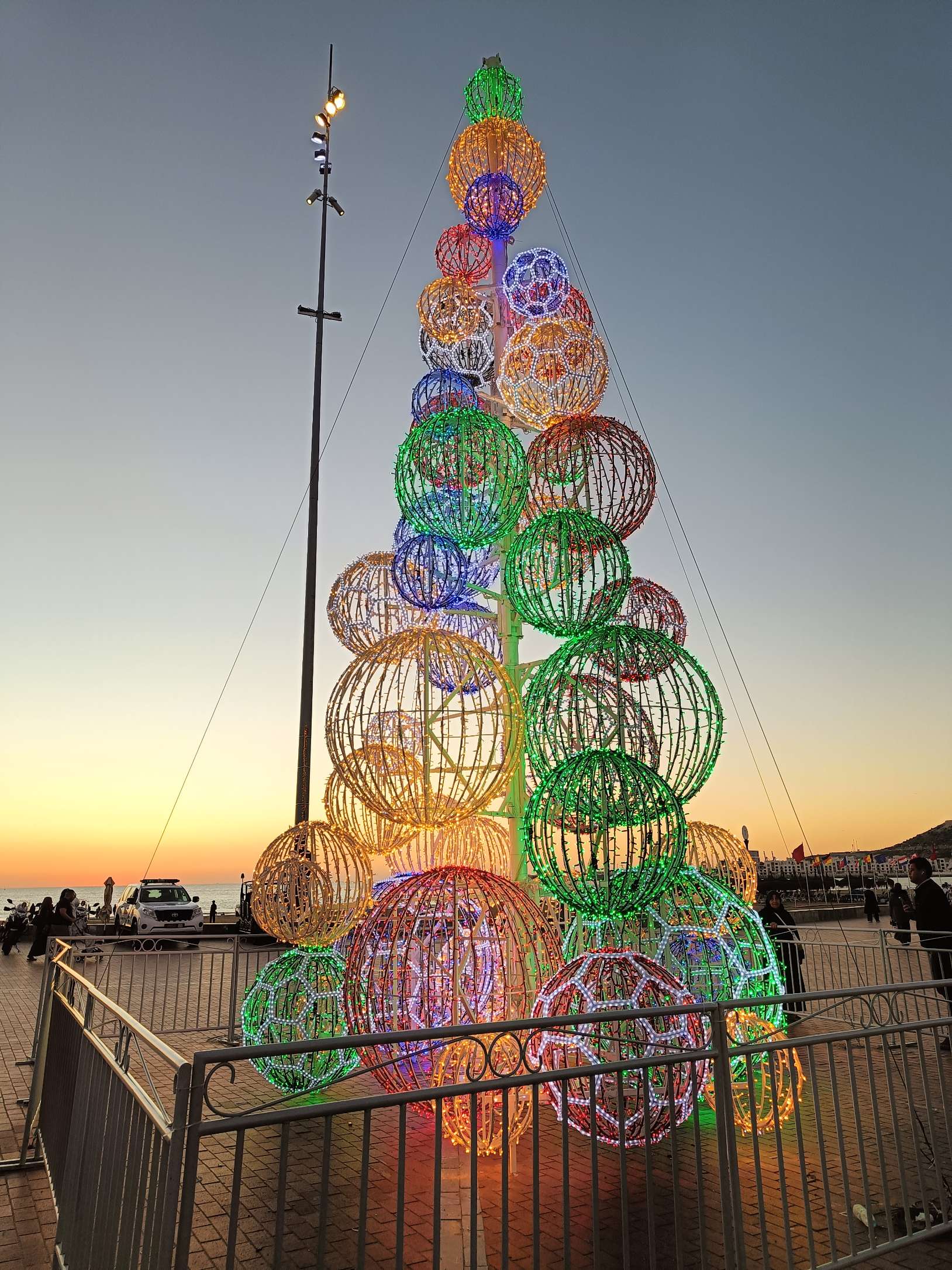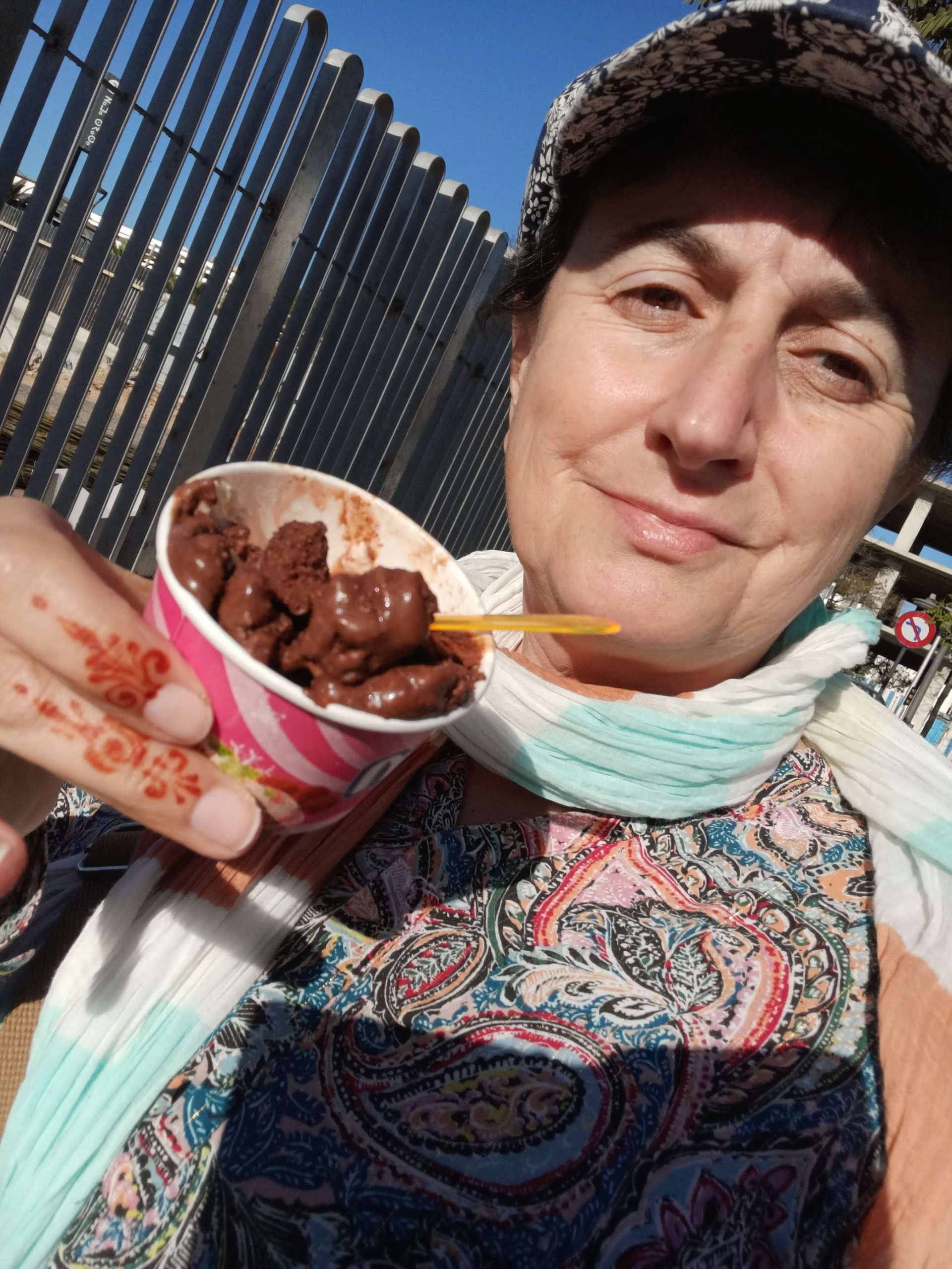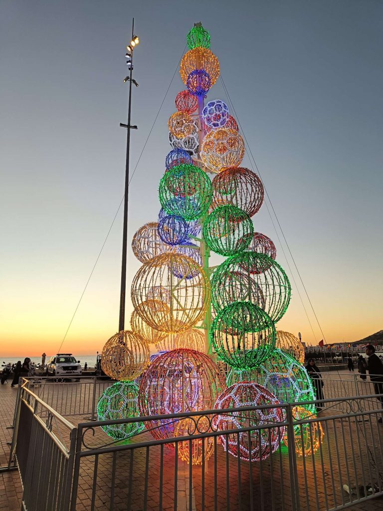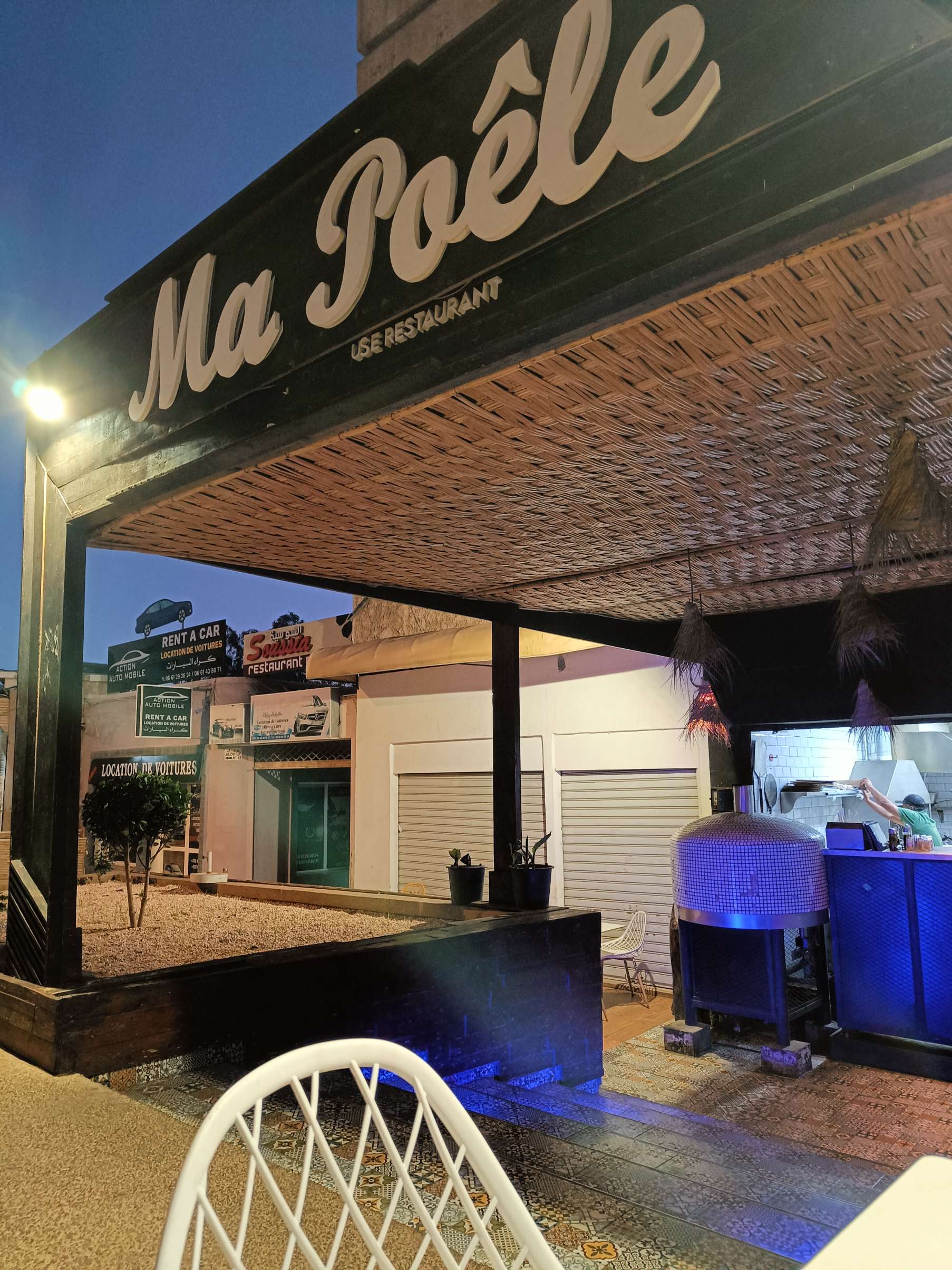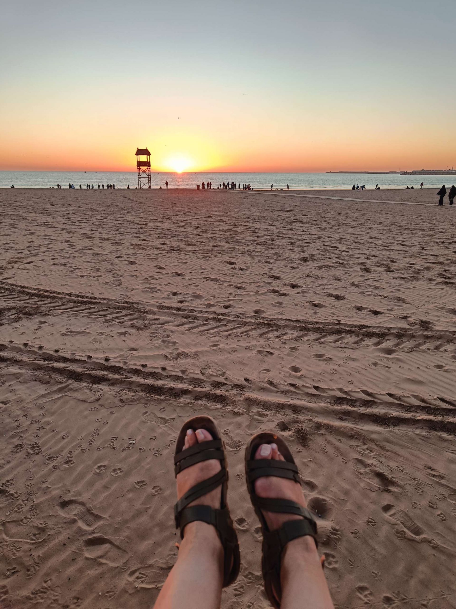 Au début, je comptais visiter la Kasbah et finalement, j’ai laissé tomber, j’ai juste fait le tour des remparts et la vue est vraiment splendide sur Agadir. Au retour, j’ai pu prendre le bus, j’ai été étonnée du prix du ticket 8 dirhams, à deux, c’est tout de suite plus intéressant de prendre un taxi. Ensuite, je suis redescendue vers la plage, belle ambiance au coucher du soleil, beaucoup de musiques africaines car demain le Maroc affronte le Cameroun, les ‘fan zones’ sont fin prêtes. Par contre, je commençais à avoir sérieusement les crocs, je n’avais rien mangé depuis le Petit déjeuner à part 3 clémentines ce midi. J’avais envie de grillages, bonne pioche avec un resto qui s’appelle ‘ma poele’. Par contre, il faisait un peu frais dehors, j’étais en courant d’air, mais les brochettes étaient super bonnes avec du riz, de la purée et une salade avec des lanieres de légumes confits dans l’huile. C’était vraiment bon. En dessert, je me suis arrêtée dans une pâtisserie juste à côté, c’était royal, j’ai choisi 5 patisseries arrosées d’un thé à la menthe. C’était bien mérité, j’ai marché plus de 20 km aujourd’hui !
